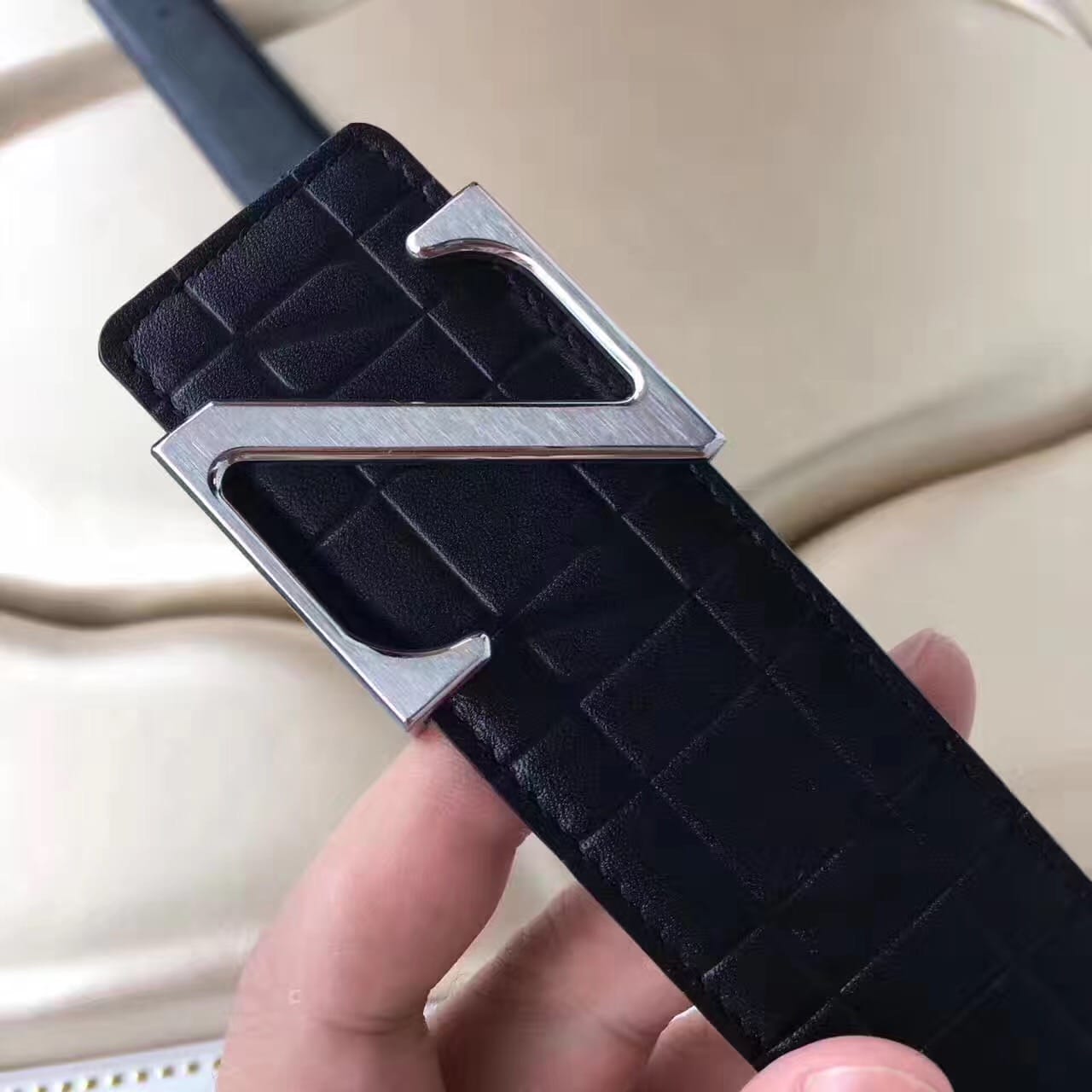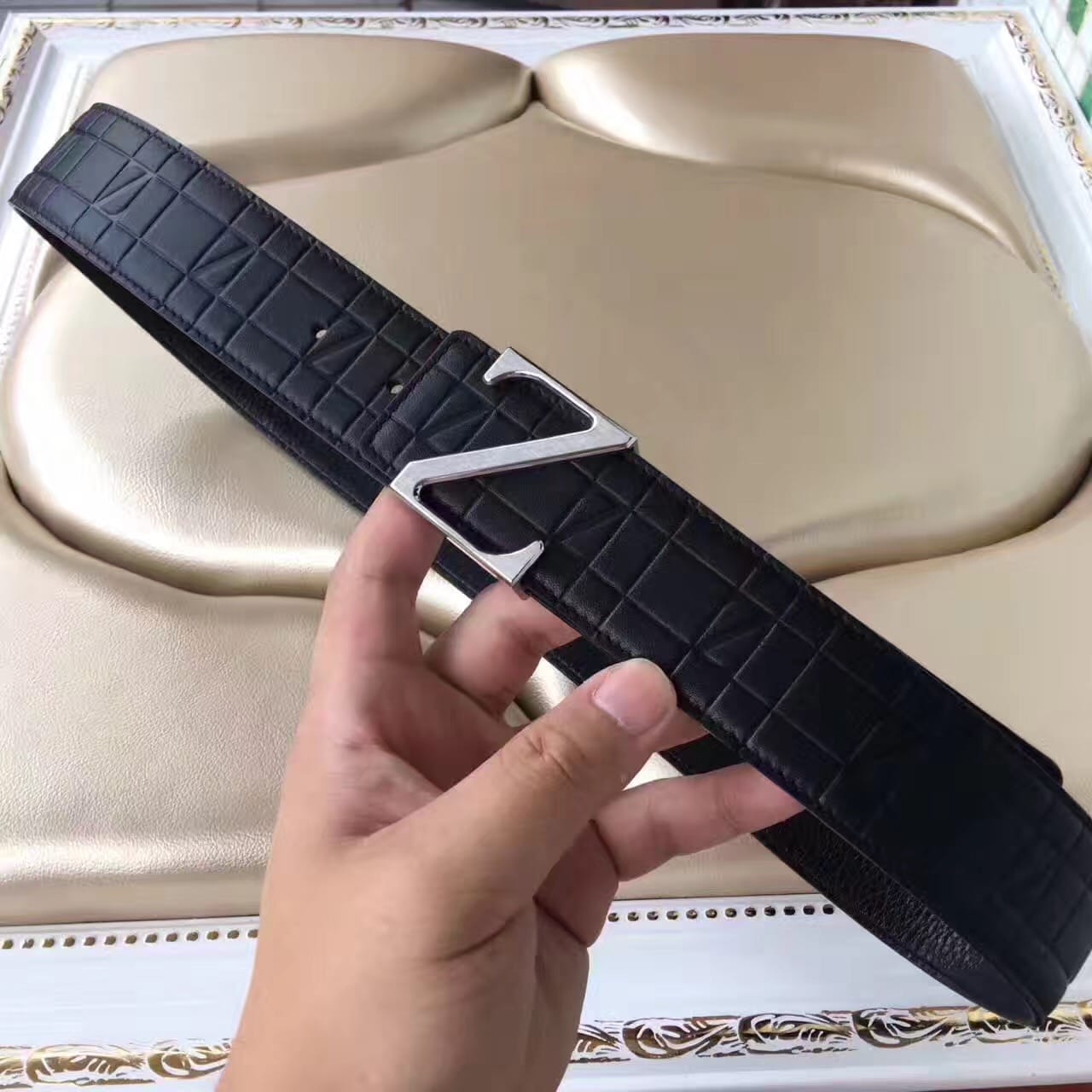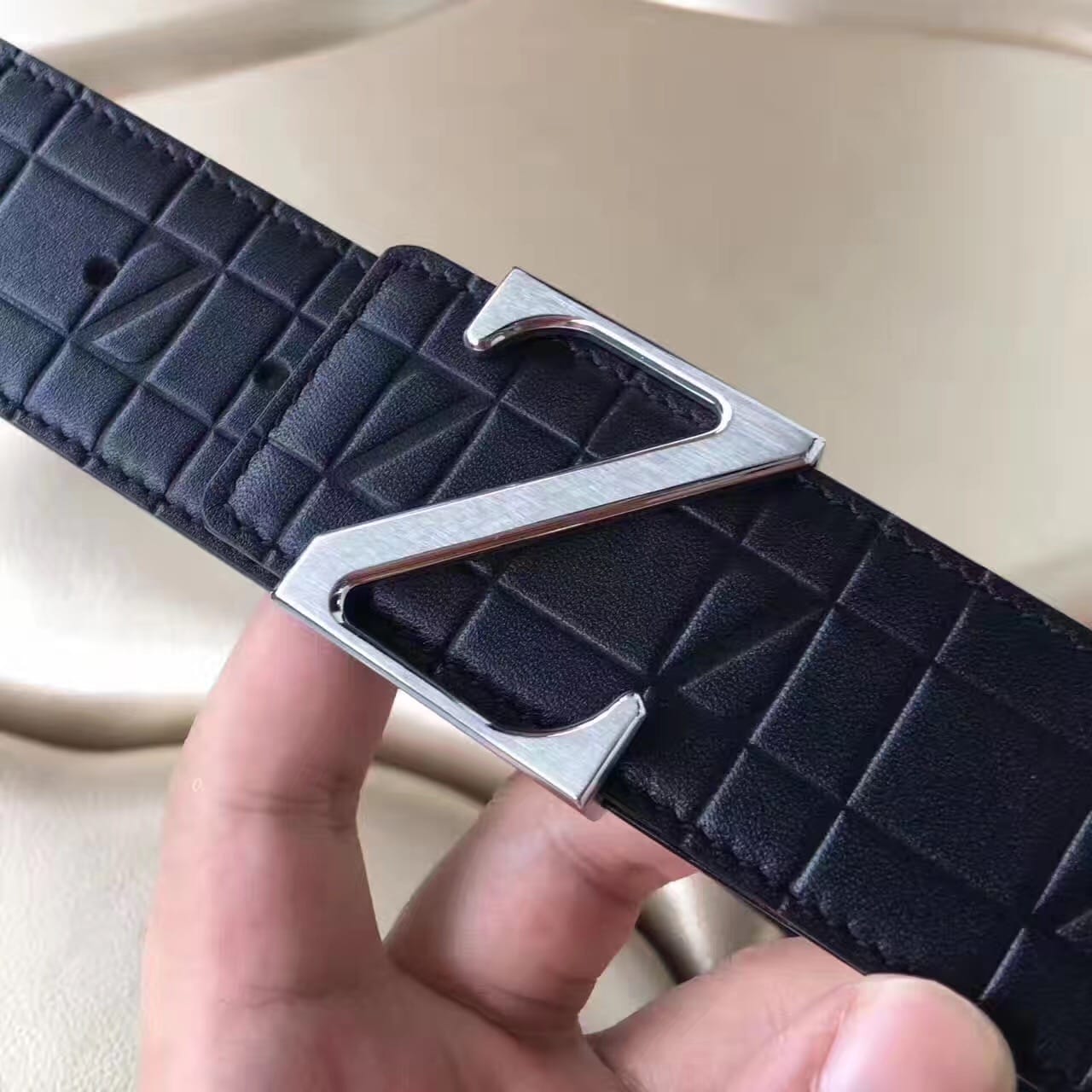 杰尼亚 Z字头 头层牛皮格纹压花 男士腰带