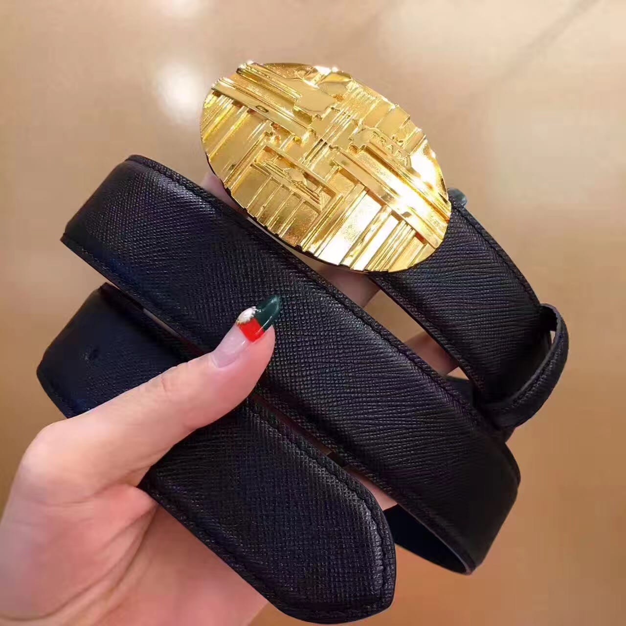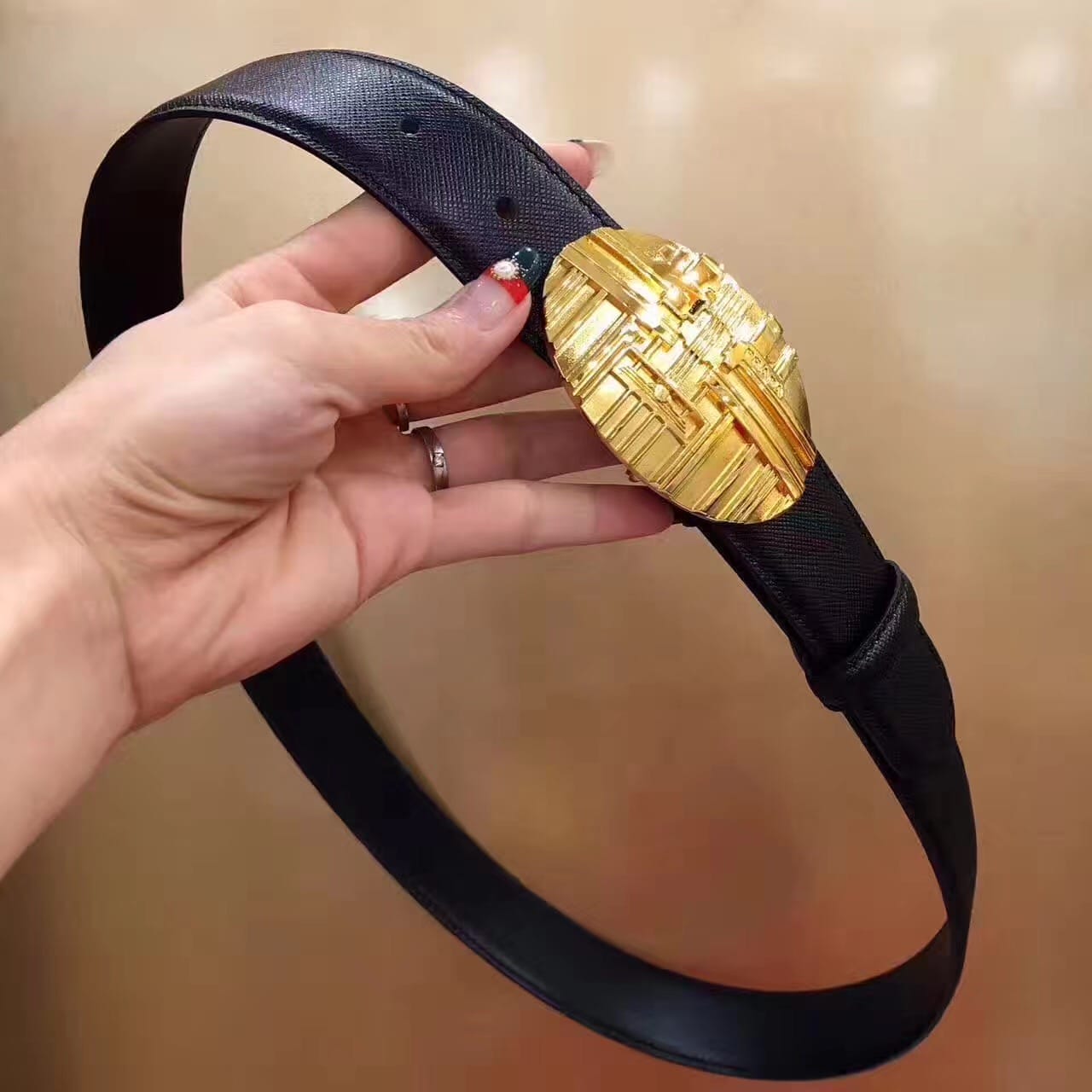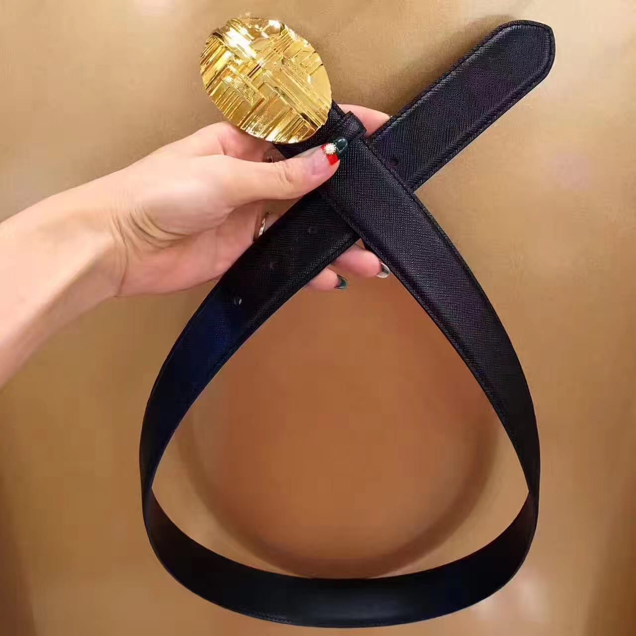 普拉达 金色钢扣搭配头层牛皮十字纹腰带