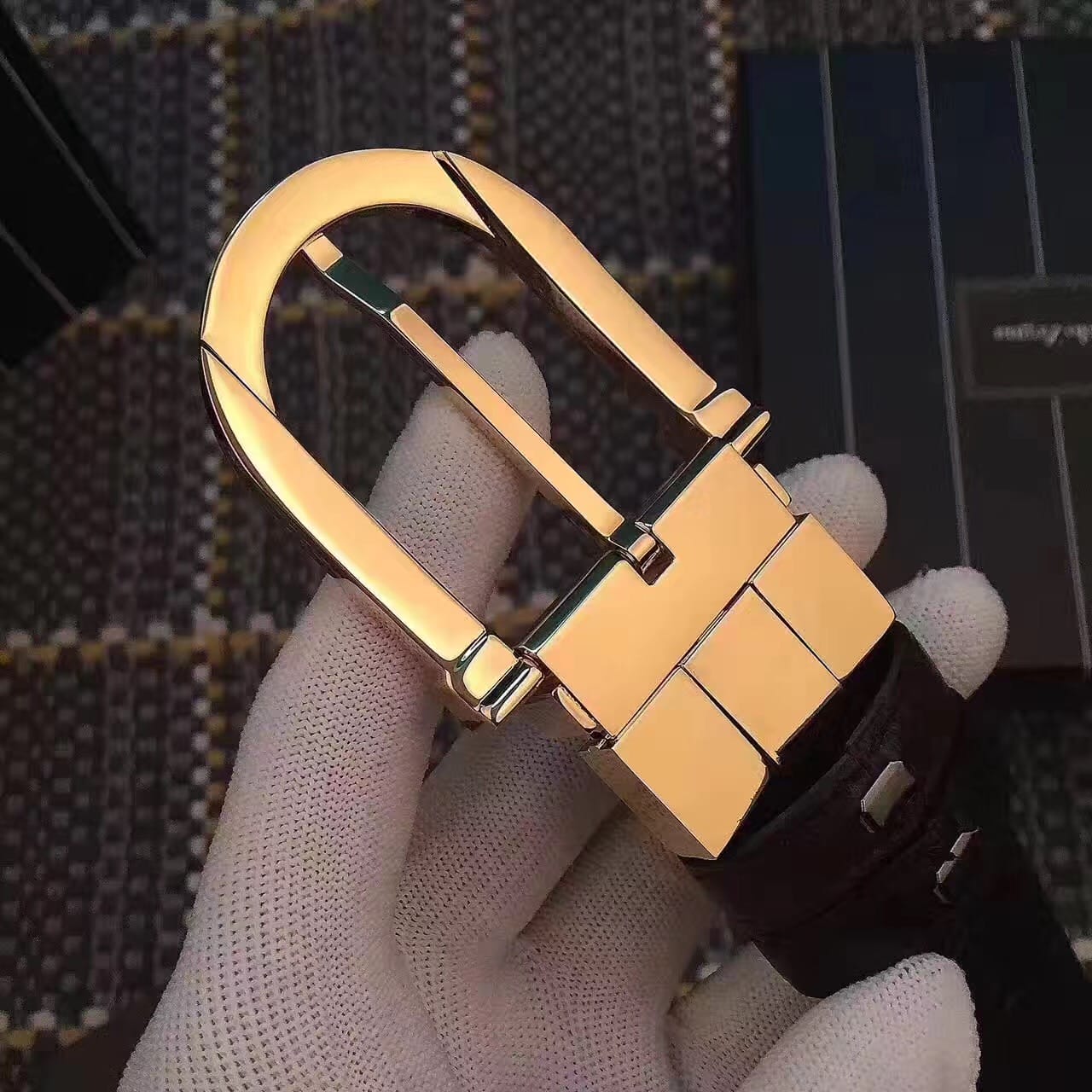 普拉达 金色钢扣搭配头层牛皮十字纹腰带