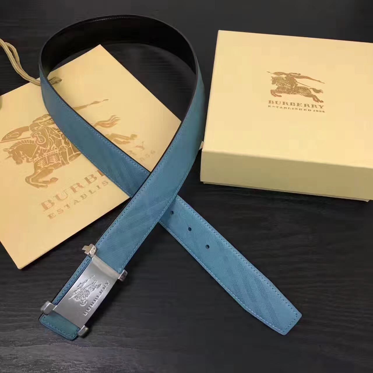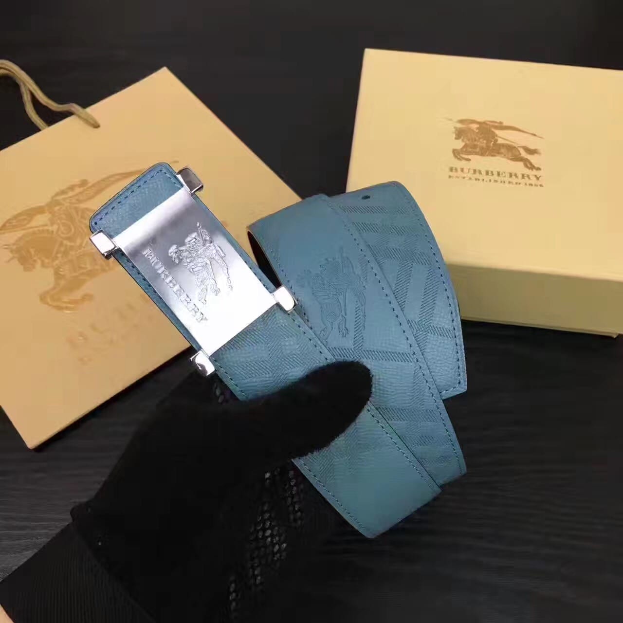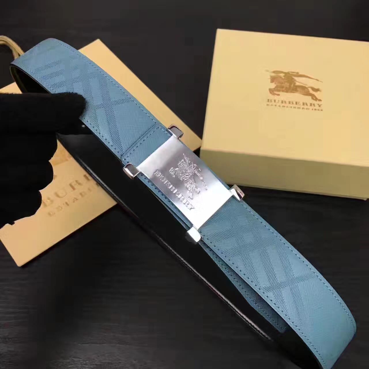 Burberry原版压花款 湖蓝色头层牛皮男士腰带