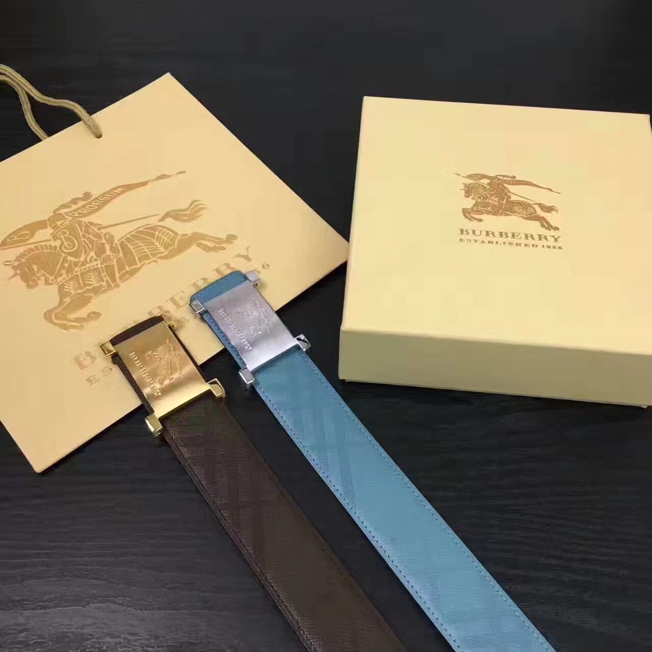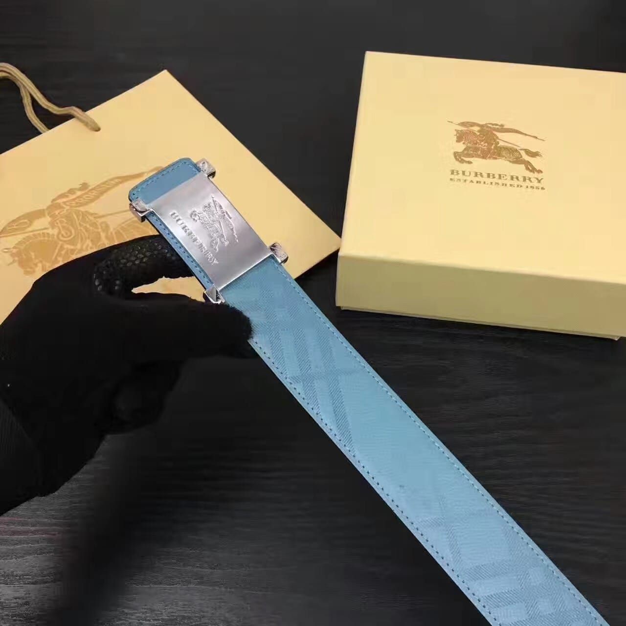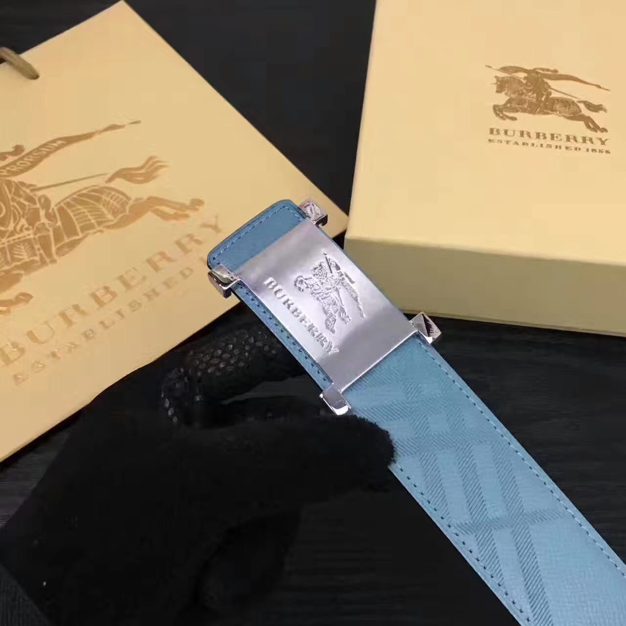 Burberry原版压花款 湖蓝色头层牛皮男士腰带