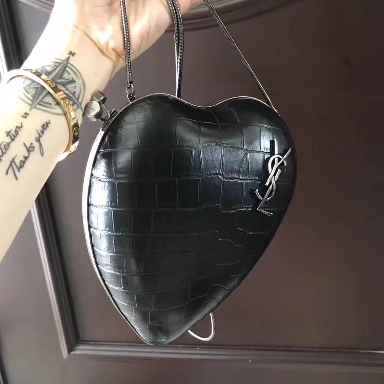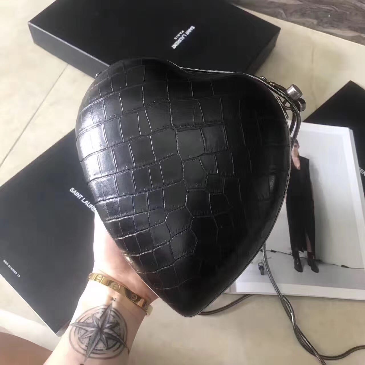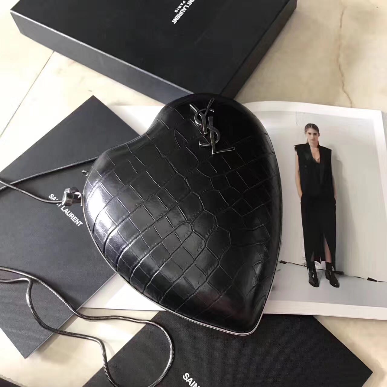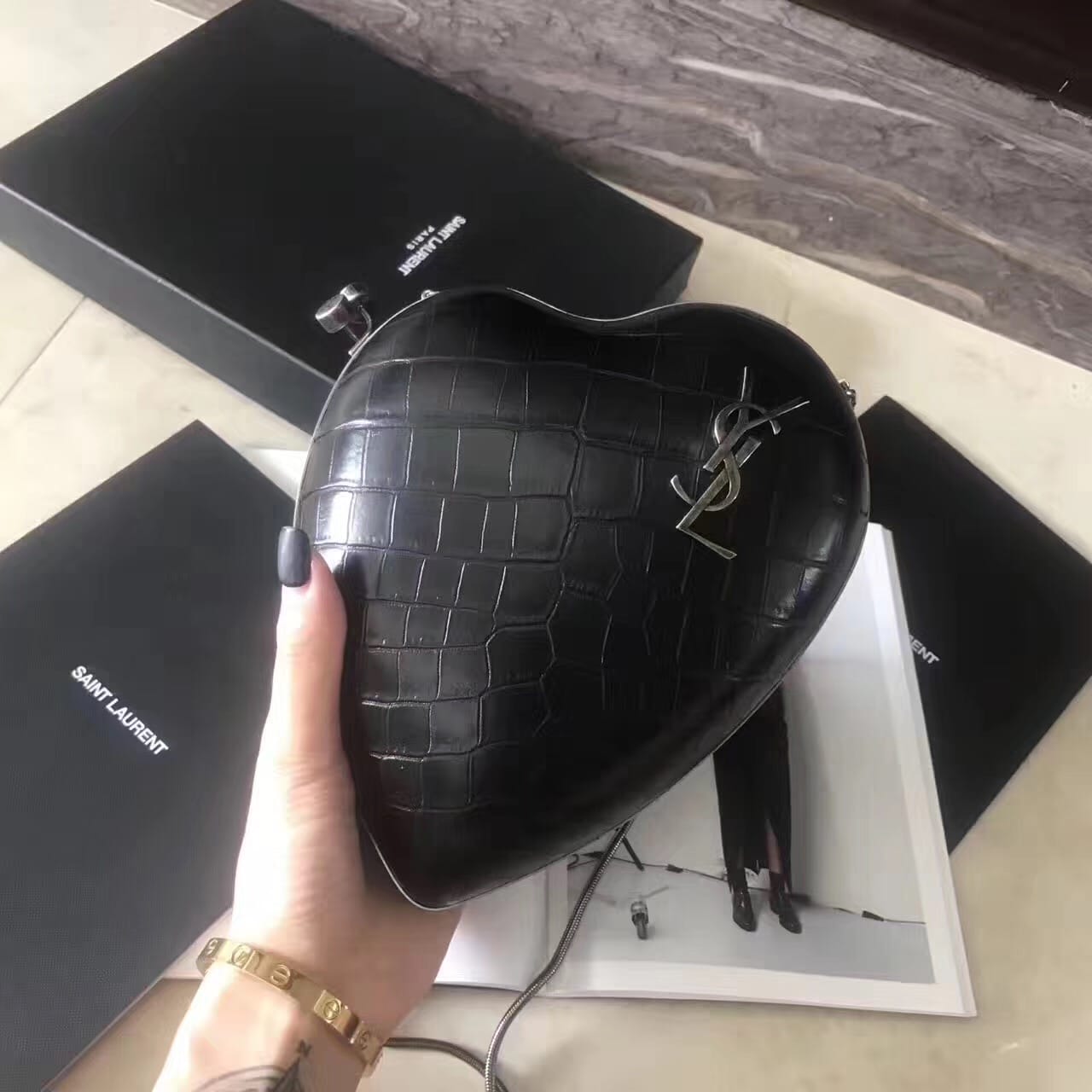 saint laurent 最新鳄鱼压花真皮love箱形袋,