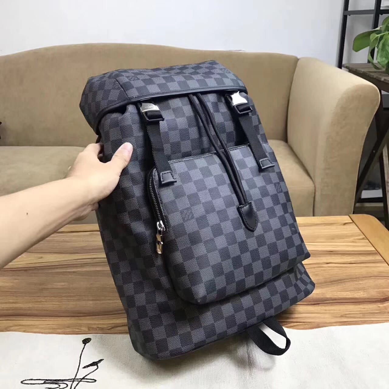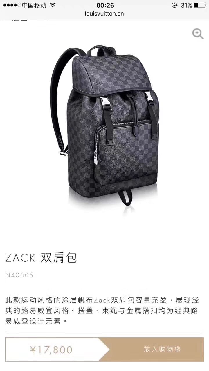 登山包N40005原单独家实拍!此款运动风格的涂层帆布Zack双肩包容量充盈,展现经典的路易威登风格。搭盖、束绳与金属搭扣均为经典路易威登设计元素。尺寸:47×41×13cm