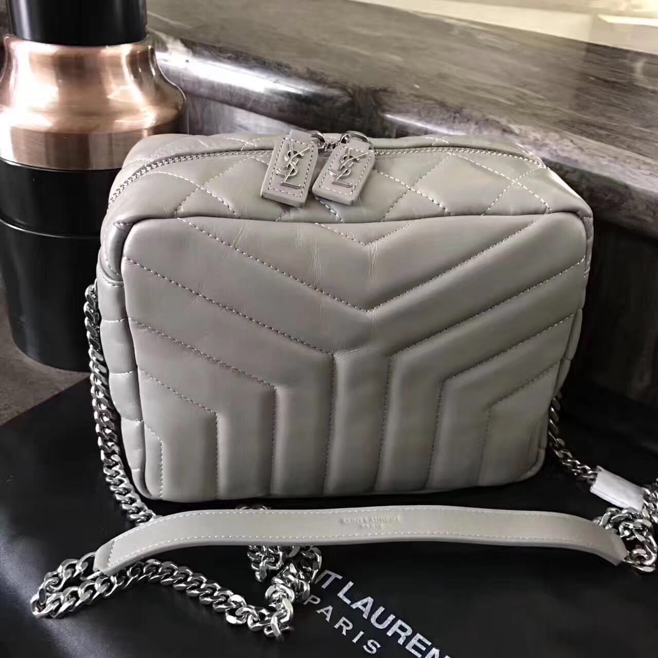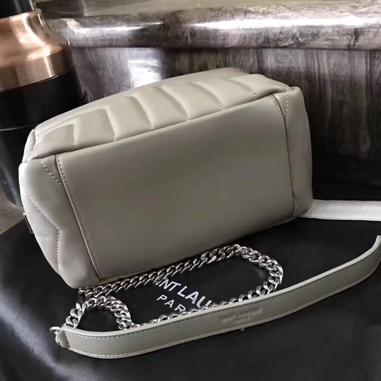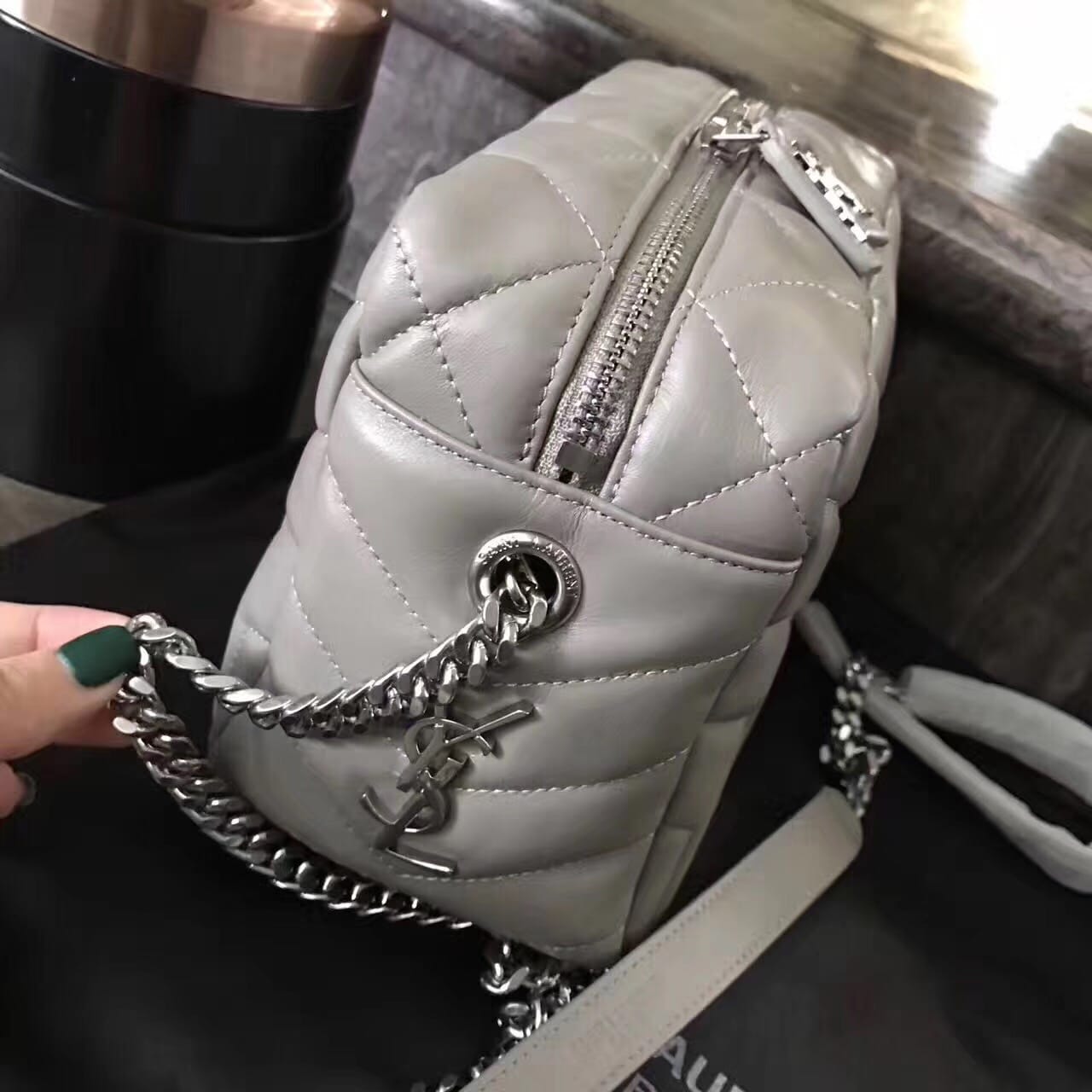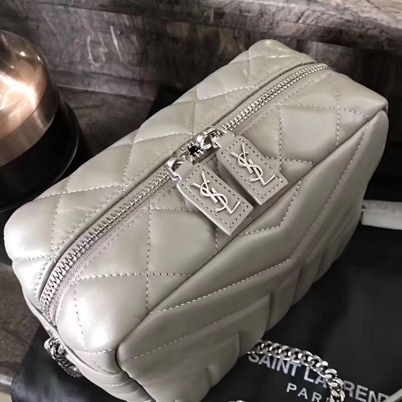 今年的保龄球包,侧面带金属联结YSL标志,金属和真皮链条肩带