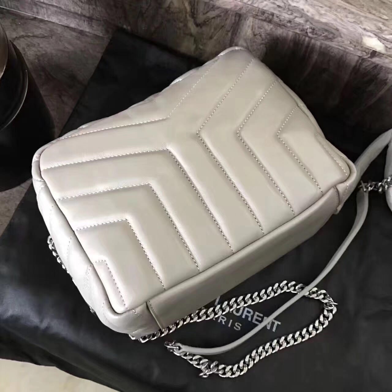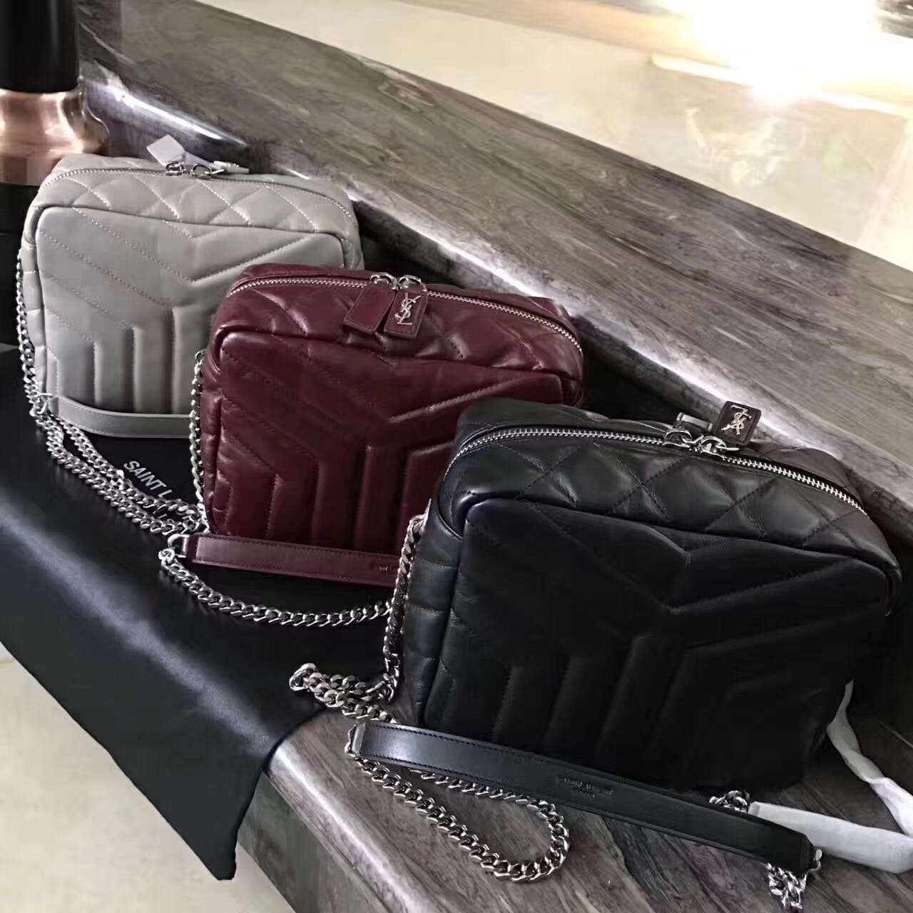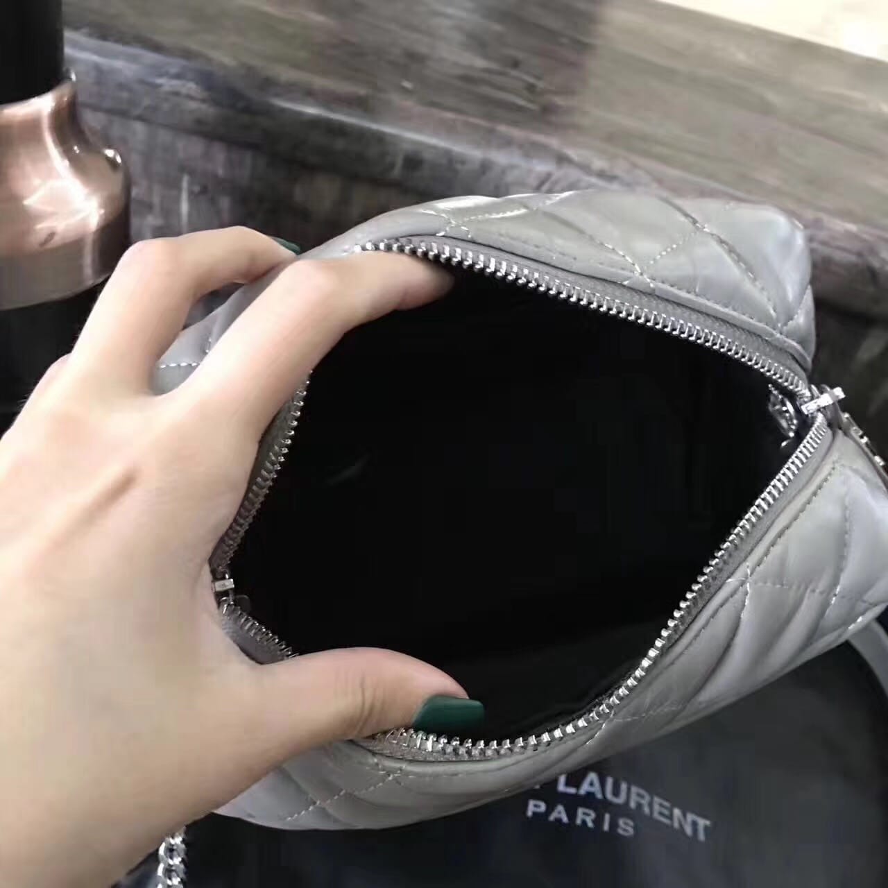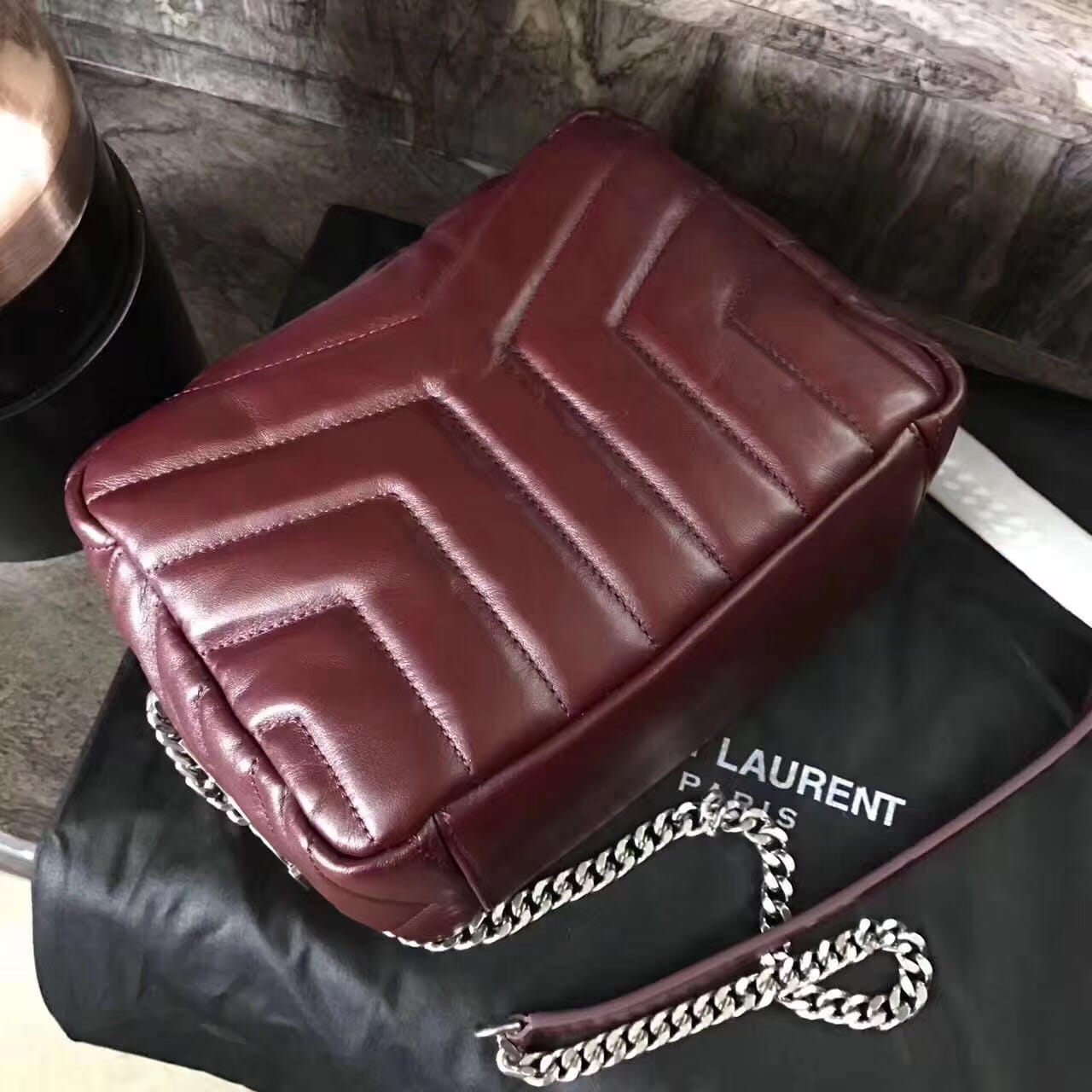 今年的保龄球包,侧面带金属联结YSL标志,金属和真皮链条肩带