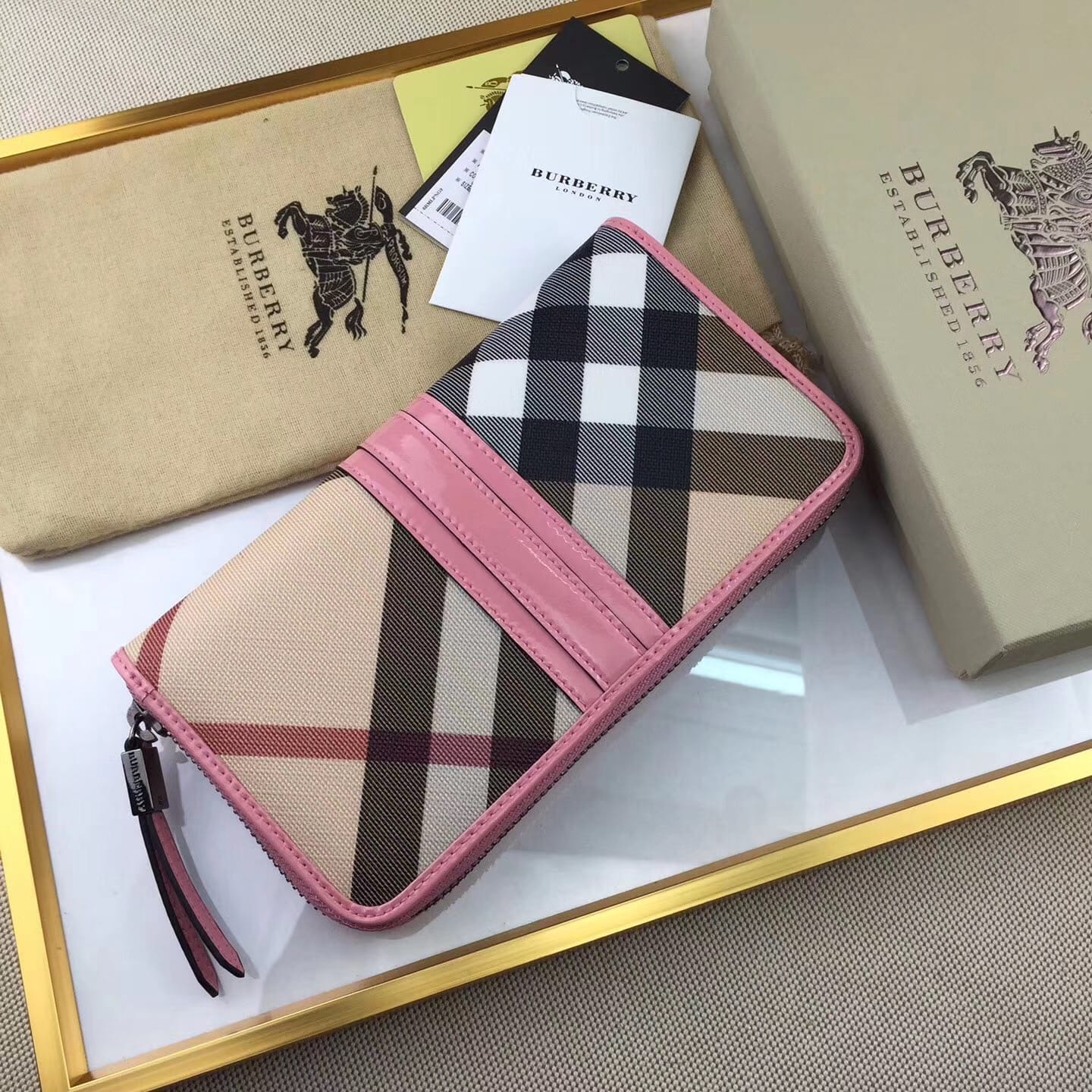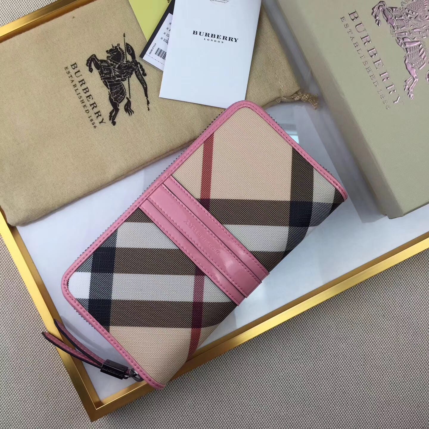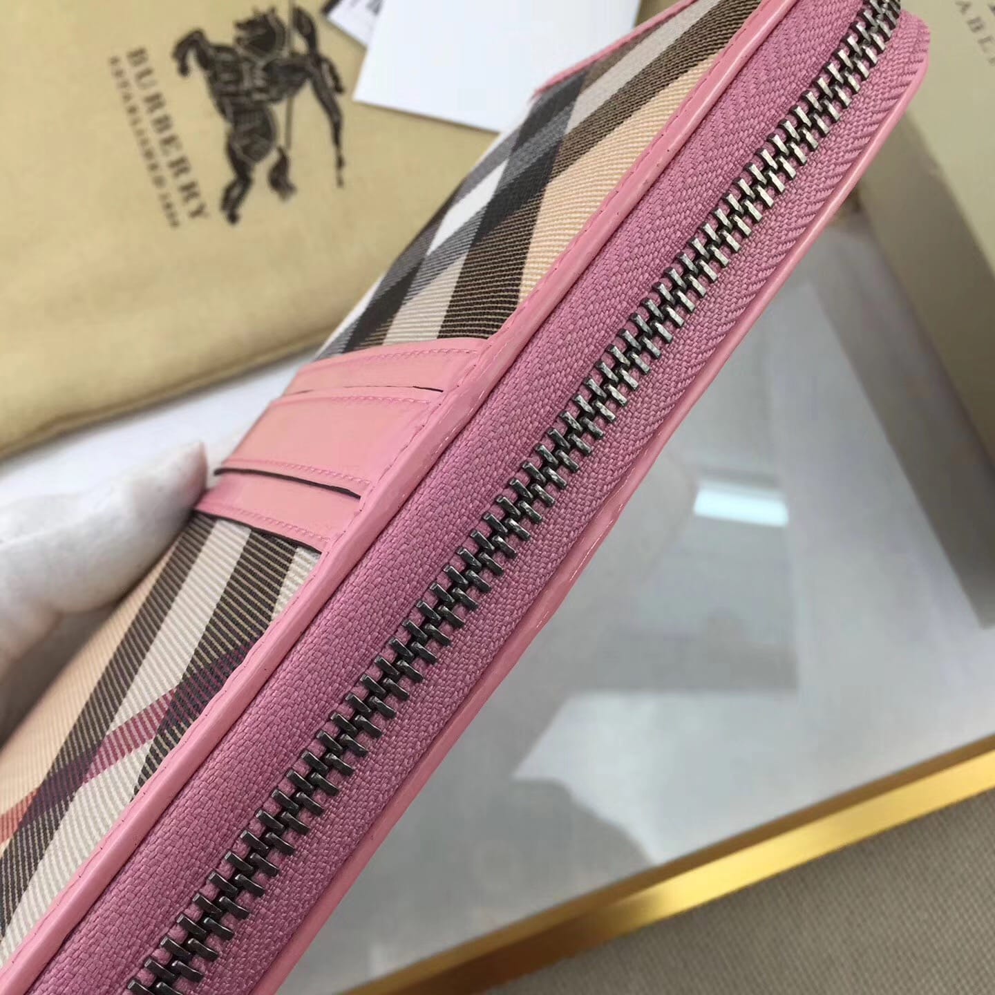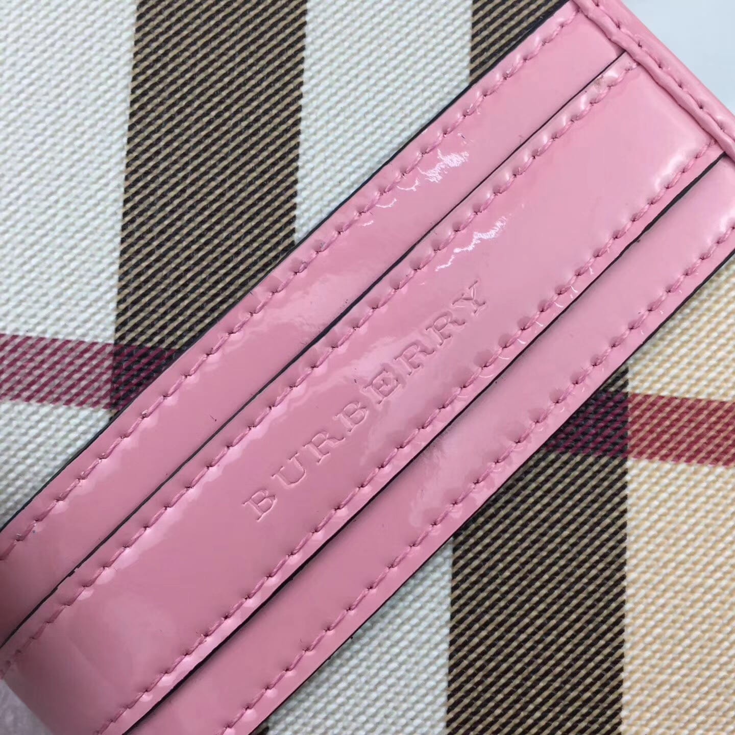 【Burberry?柏宝利】原单出品??~~??外包边采用光面漆皮搭配细腻[玫瑰]柔软的进口小牛皮,原版格子面料?专柜品质、做工精细?实物拍摄?,??1390粉色,尺寸19cm*10cm*2.5cm*