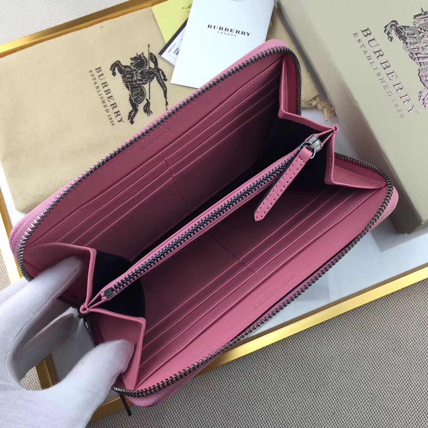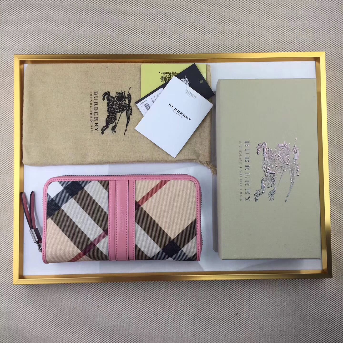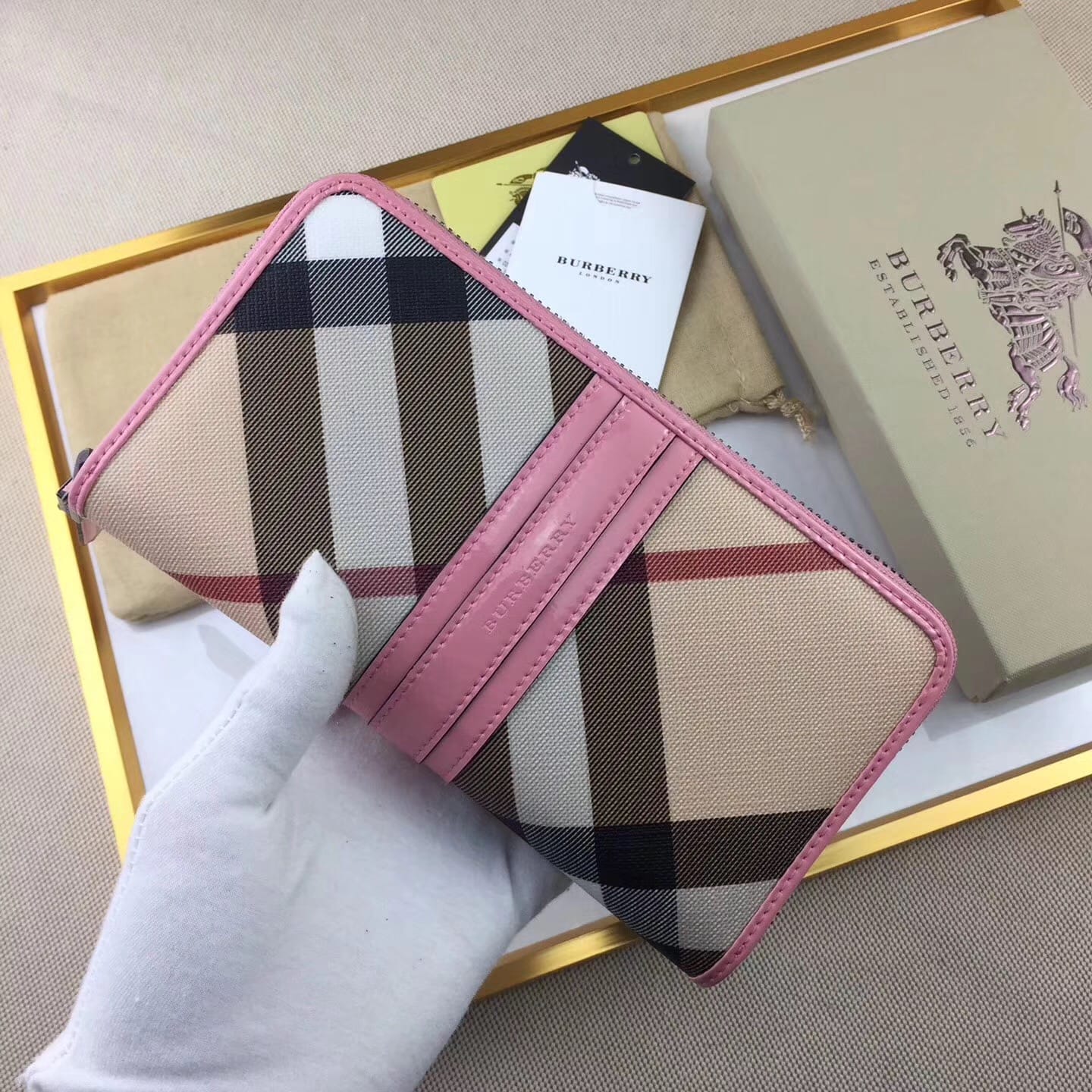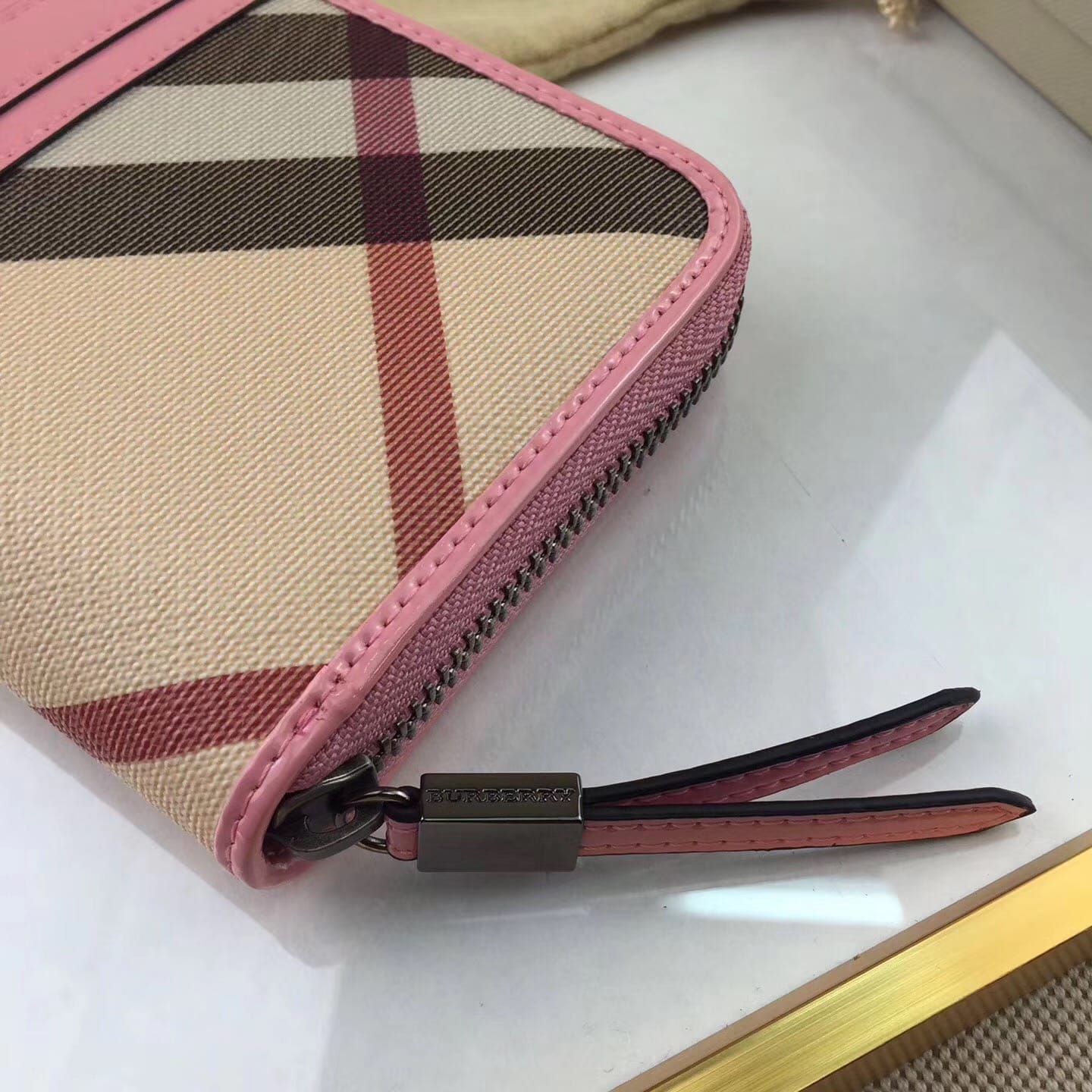 【Burberry?柏宝利】原单出品??~~??外包边采用光面漆皮搭配细腻[玫瑰]柔软的进口小牛皮,原版格子面料?专柜品质、做工精细?实物拍摄?,??1390粉色,尺寸19cm*10cm*2.5cm*
