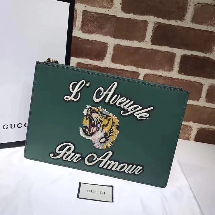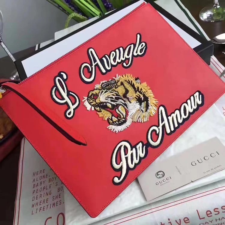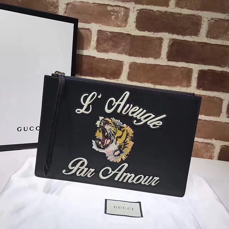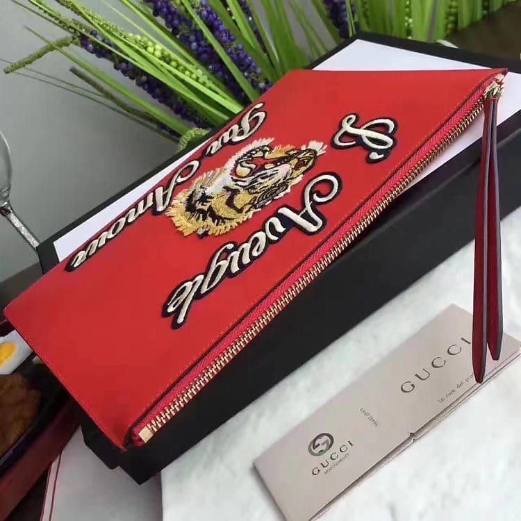 Gucci??2017最新款?中性手拿包??顶级牛皮 细腻手工油边?王虎刺绣和谚语刺绣??拉链封口 背面高清 logo压麦?采用顶级意大利牛皮进口里布???私订刺绣 做工精湛 尺寸:30x20cm ?款号:431416