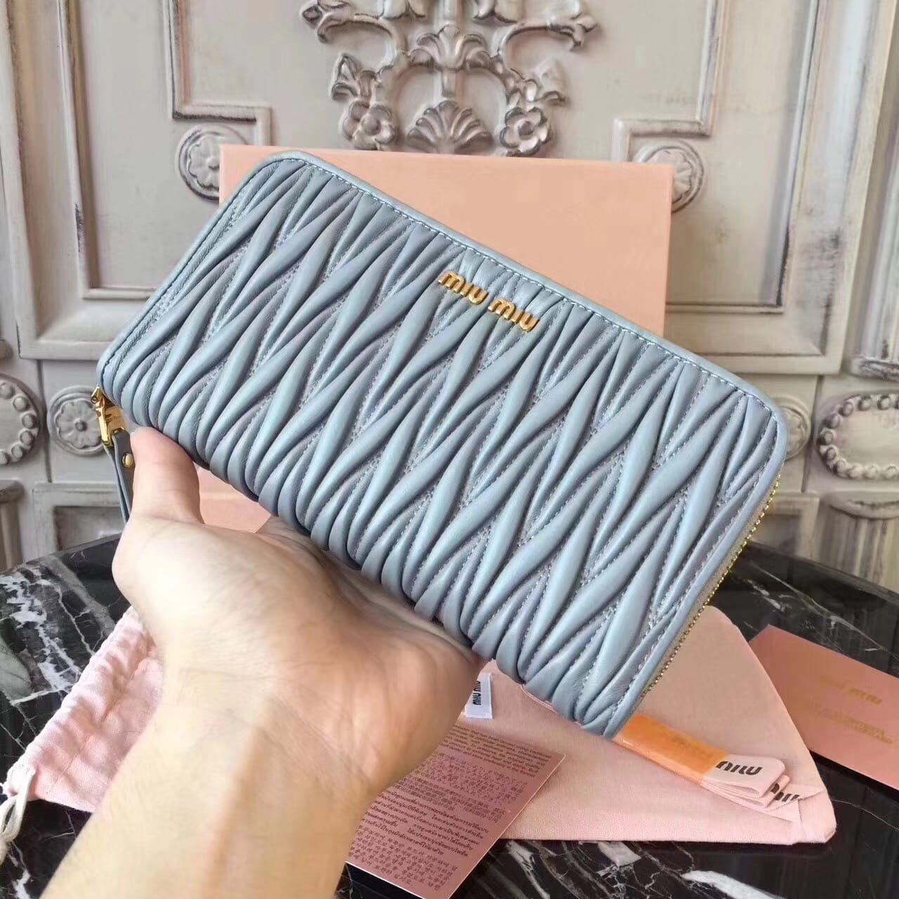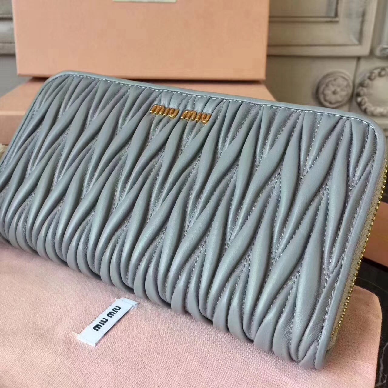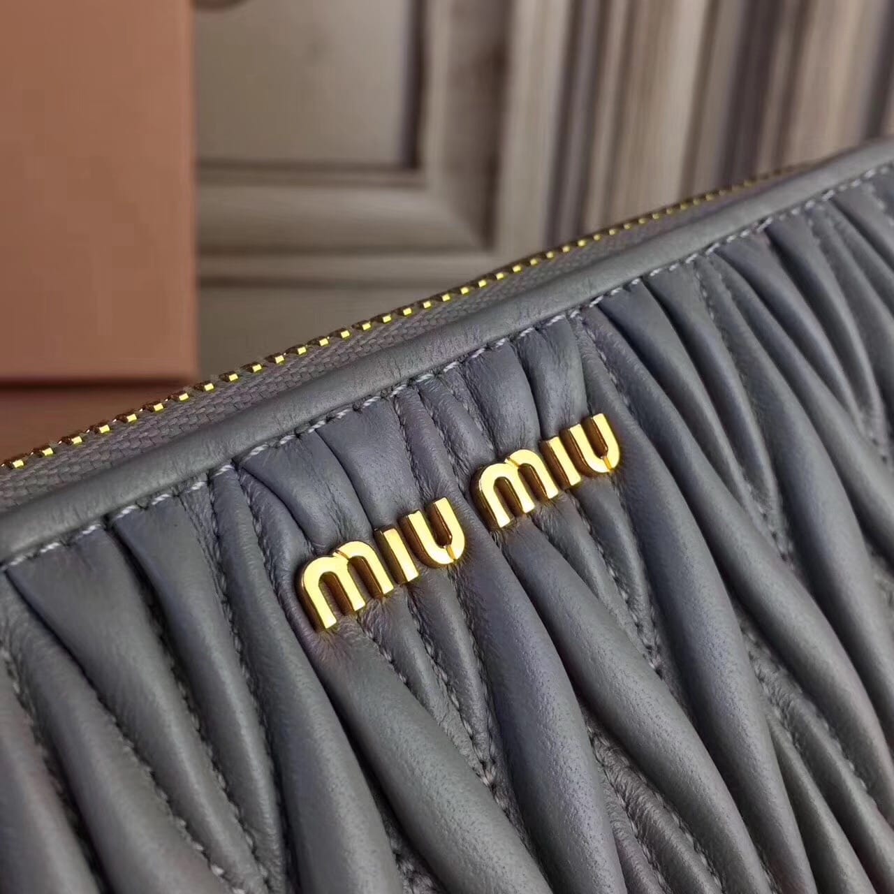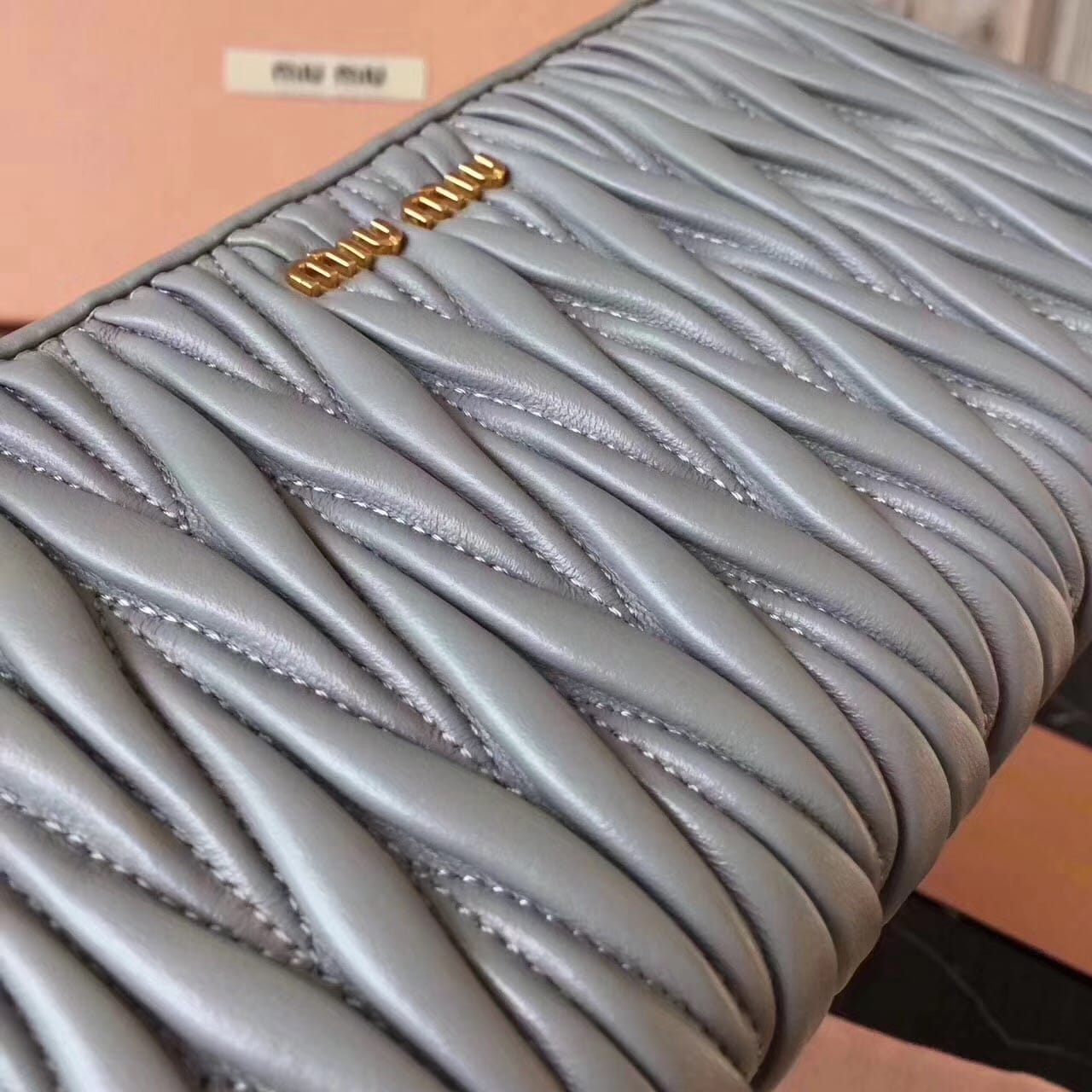 Miumiu缪缪 褶皱拉链钱包?褶皱闪亮油蜡小牛皮钱夹?抛光