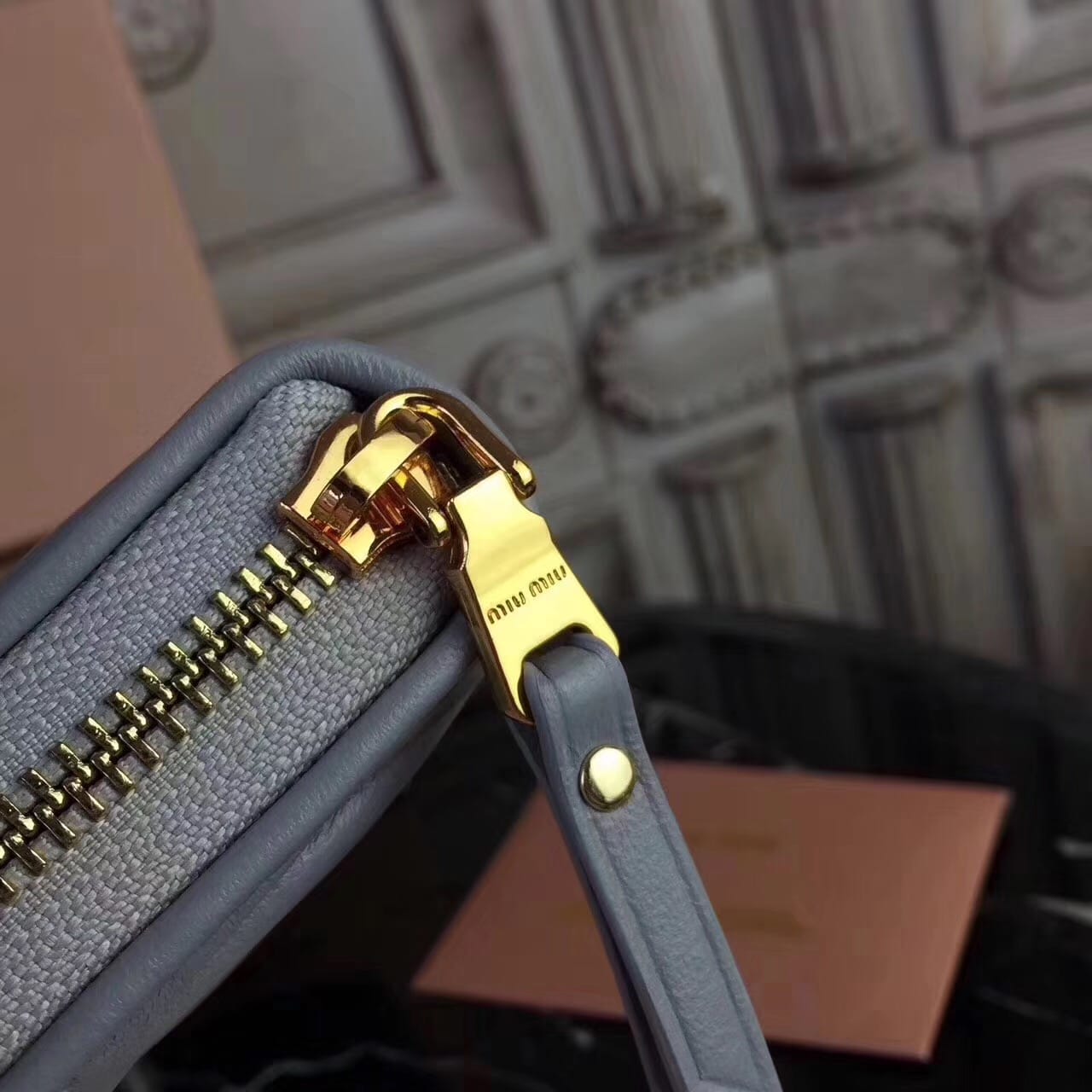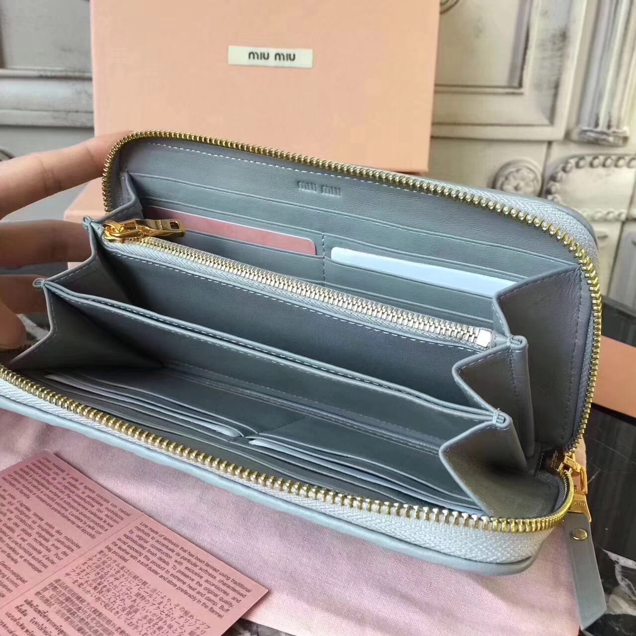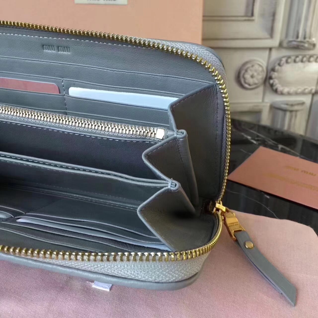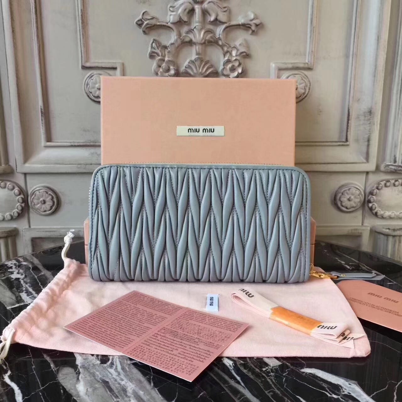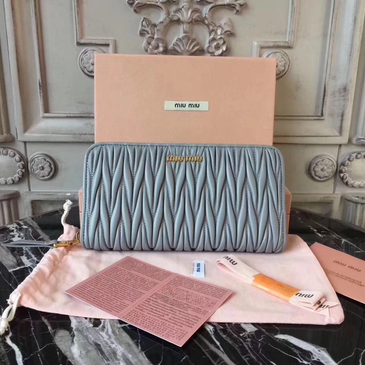 Miumiu缪缪 褶皱拉链钱包?褶皱闪亮油蜡小牛皮钱夹?抛光