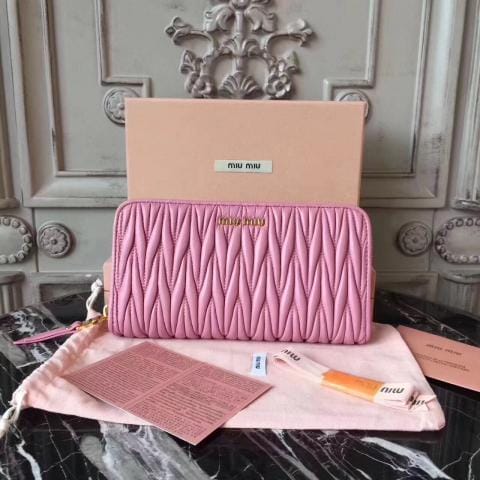 Miumiu缪缪 褶皱拉链钱包?褶皱闪亮油蜡小牛皮钱夹?抛光