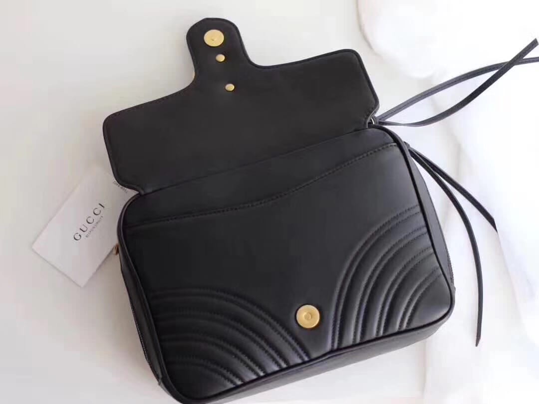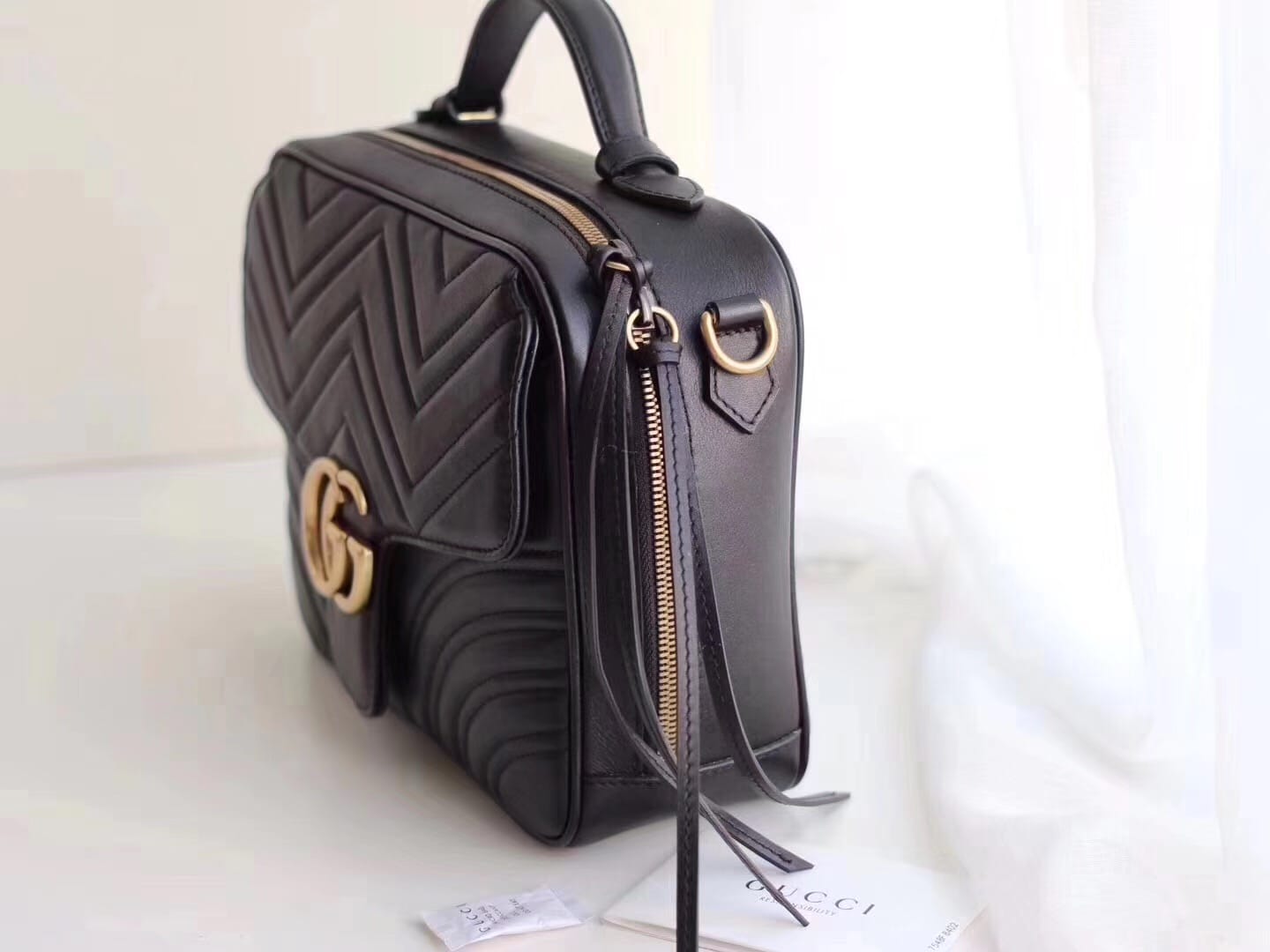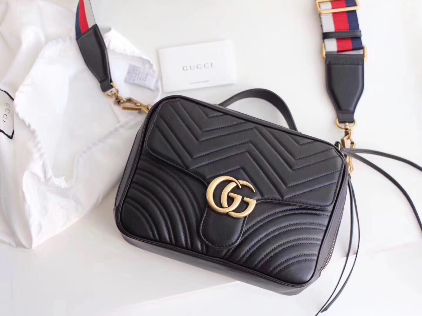 Gucci新款专柜品牌 ,原单,GG Marmont 强势来袭. 极具特色宽大柔软的sylvie可调节织带,伸拉式手提带. 大盖头内插袋. 可手提、斜挎、肩背. 款号:498100黑色,尺寸:W25 H9 D8,