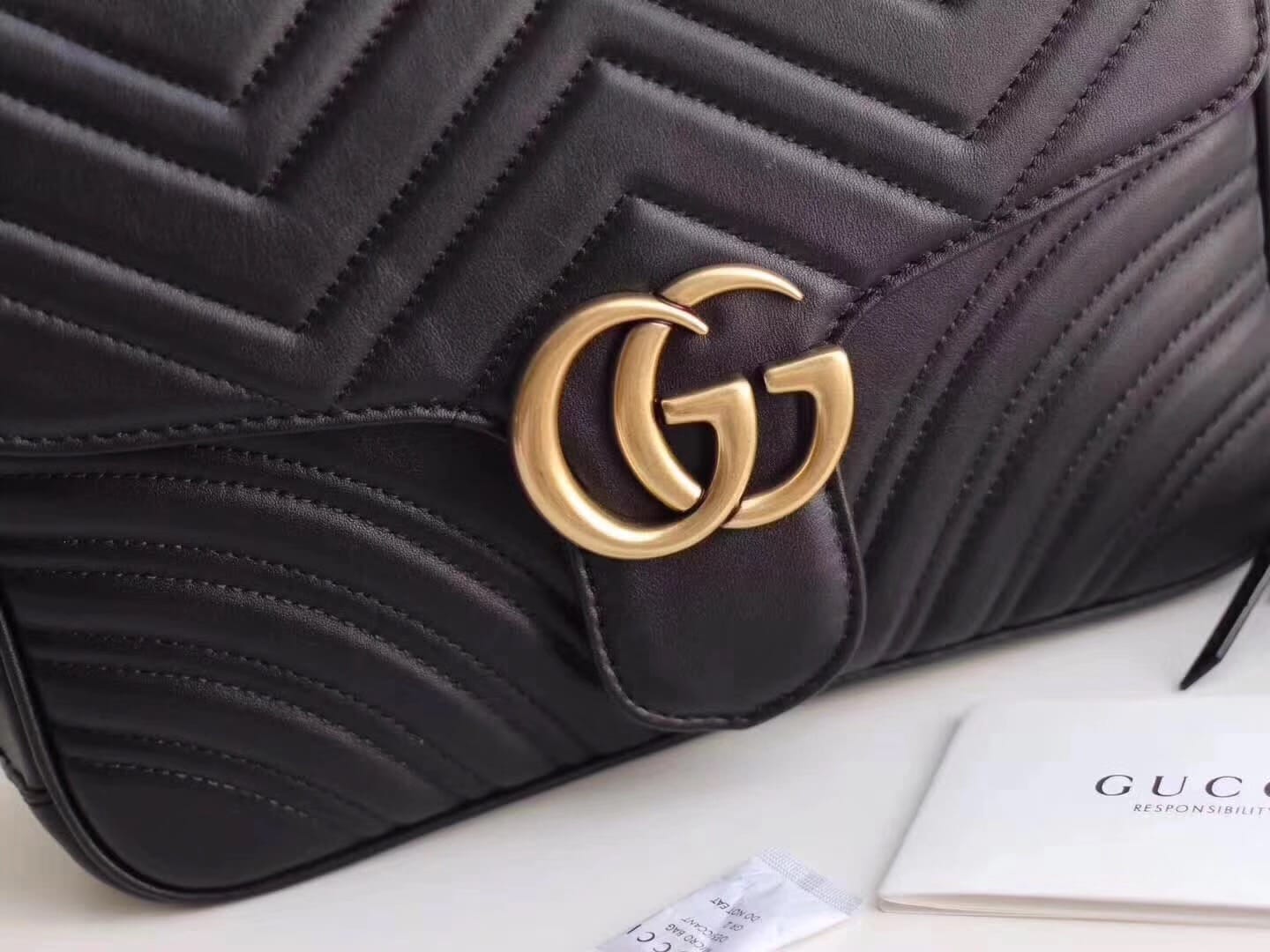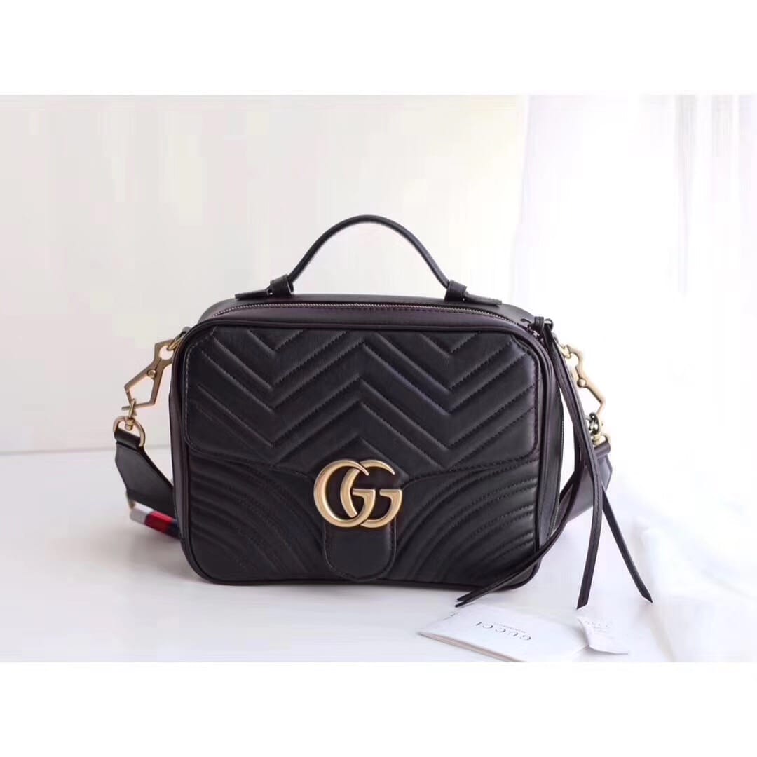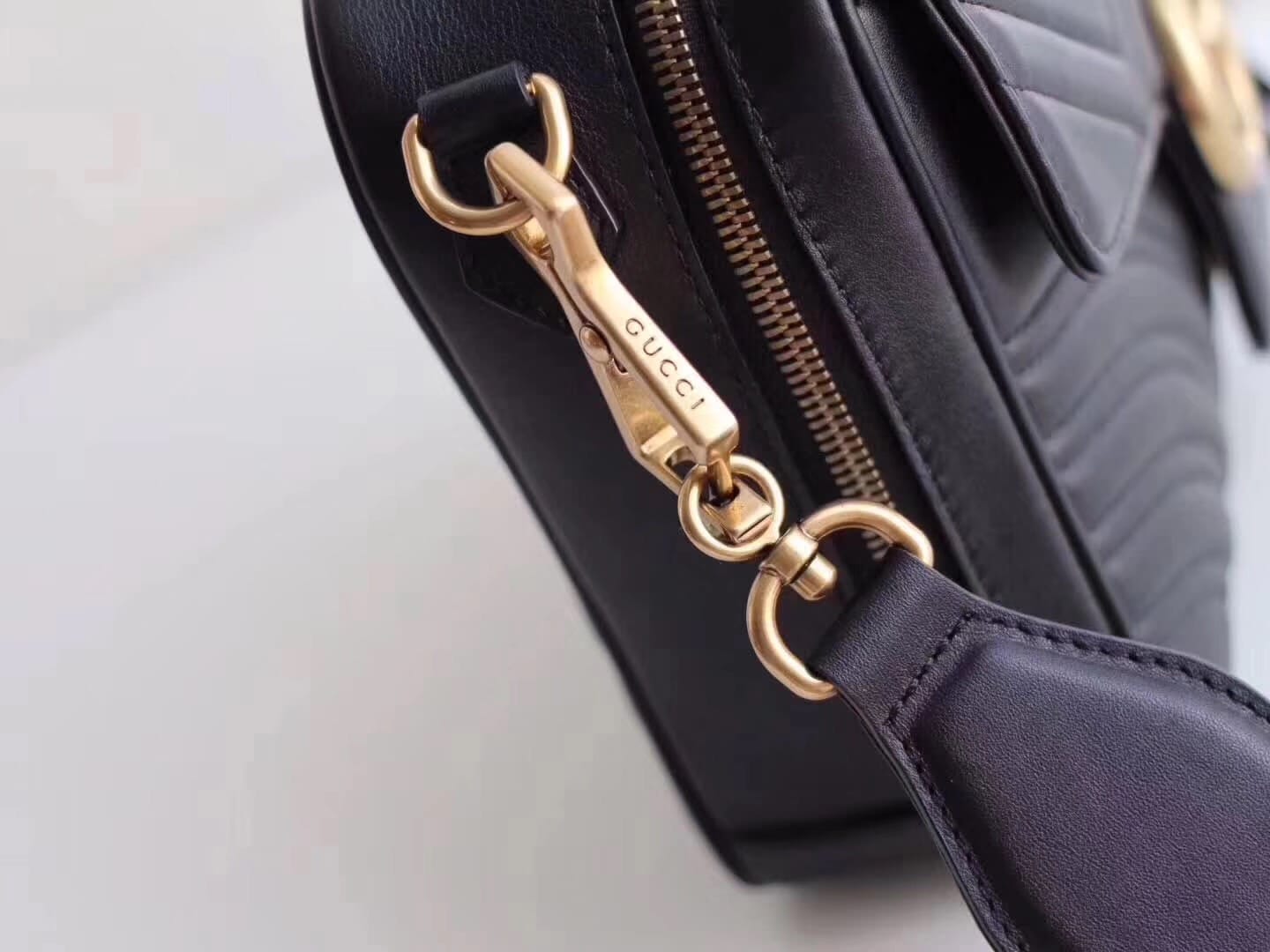 Gucci新款专柜品牌 ,原单,GG Marmont 强势来袭. 极具特色宽大柔软的sylvie可调节织带,伸拉式手提带. 大盖头内插袋. 可手提、斜挎、肩背. 款号:498100黑色,尺寸:W25 H9 D8,