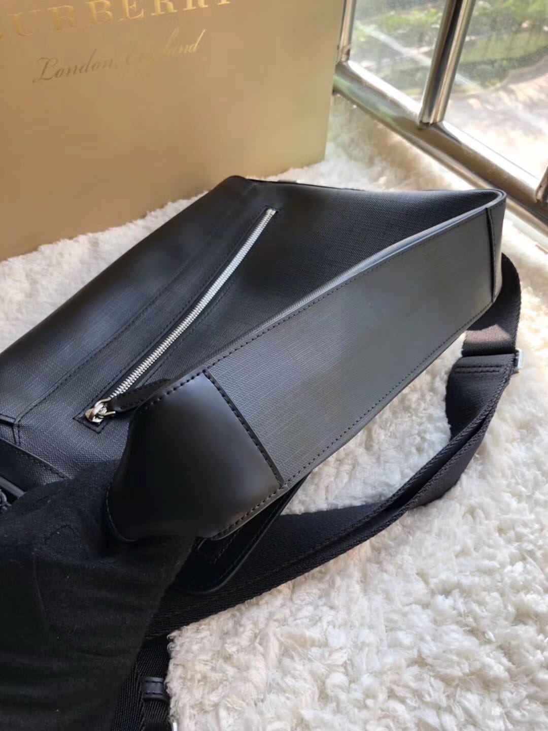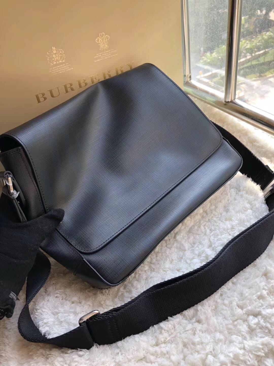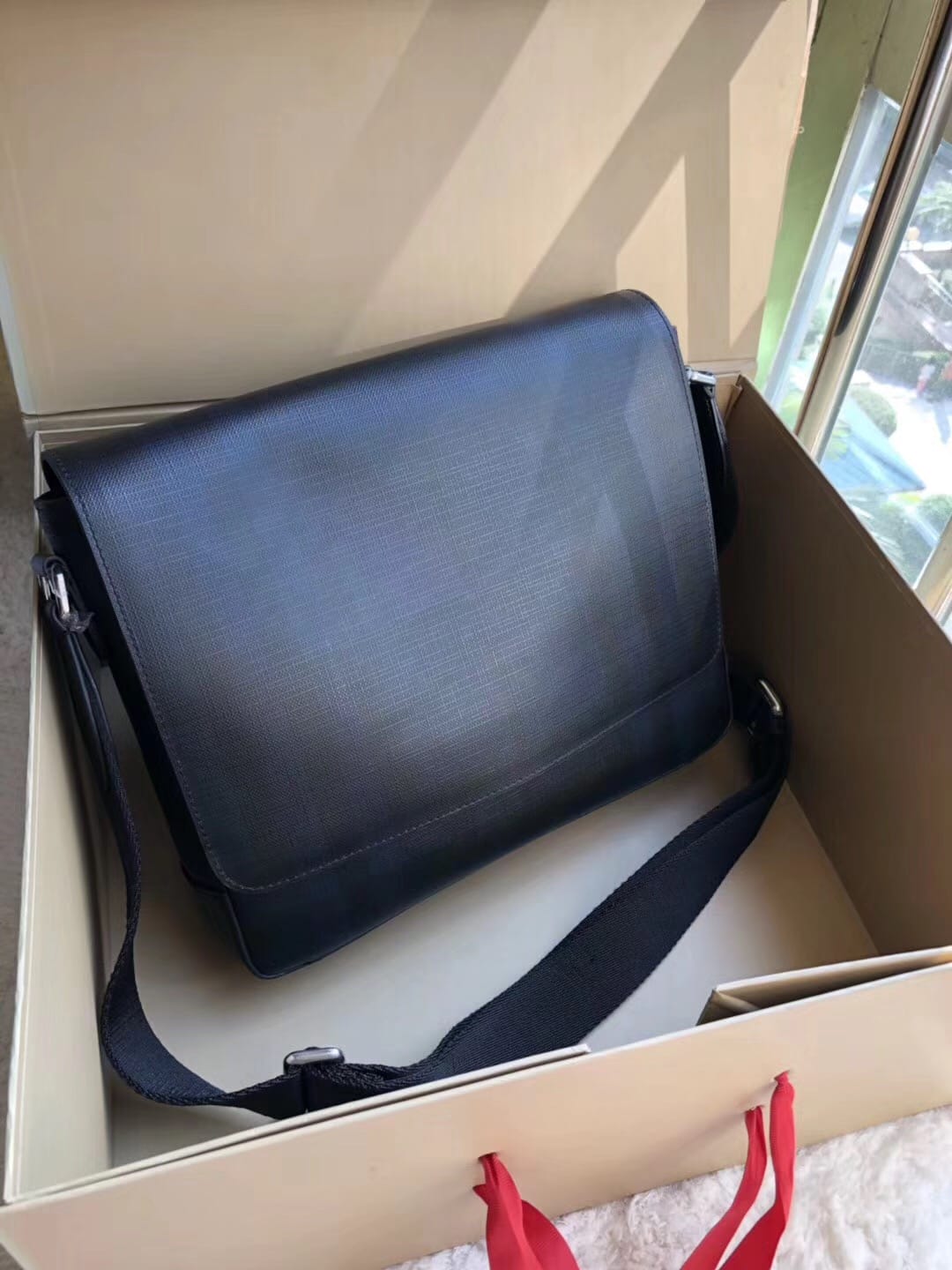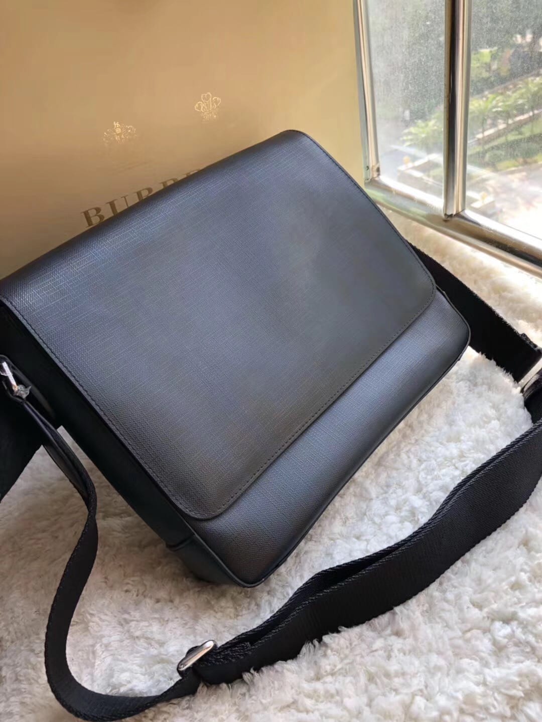 ?B家男士斜挎包 兰格PVC 配牛皮 ??独具匠心创新理念 传统考究的精湛工艺 创意无垠的设计风格 ?体现男士干练利落气质 百搭时尚 可调节肩带 尺寸:31*7*26cm!