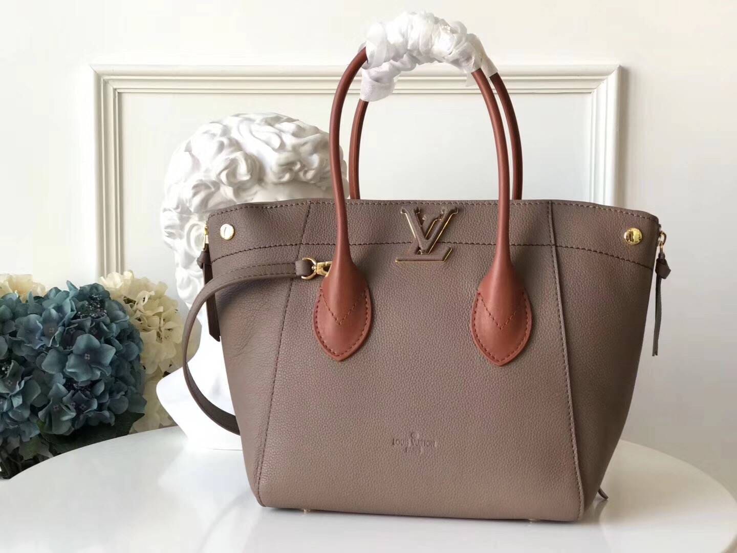 新品 Freedom小牛皮Tote手袋 M54841 灰色 展现前卫的机车风格。独特的拉链开合设计,可改变手袋造型与气质。饰有皮质金属LV标识,都市生活中的时尚伴侣 尺寸35x24x16