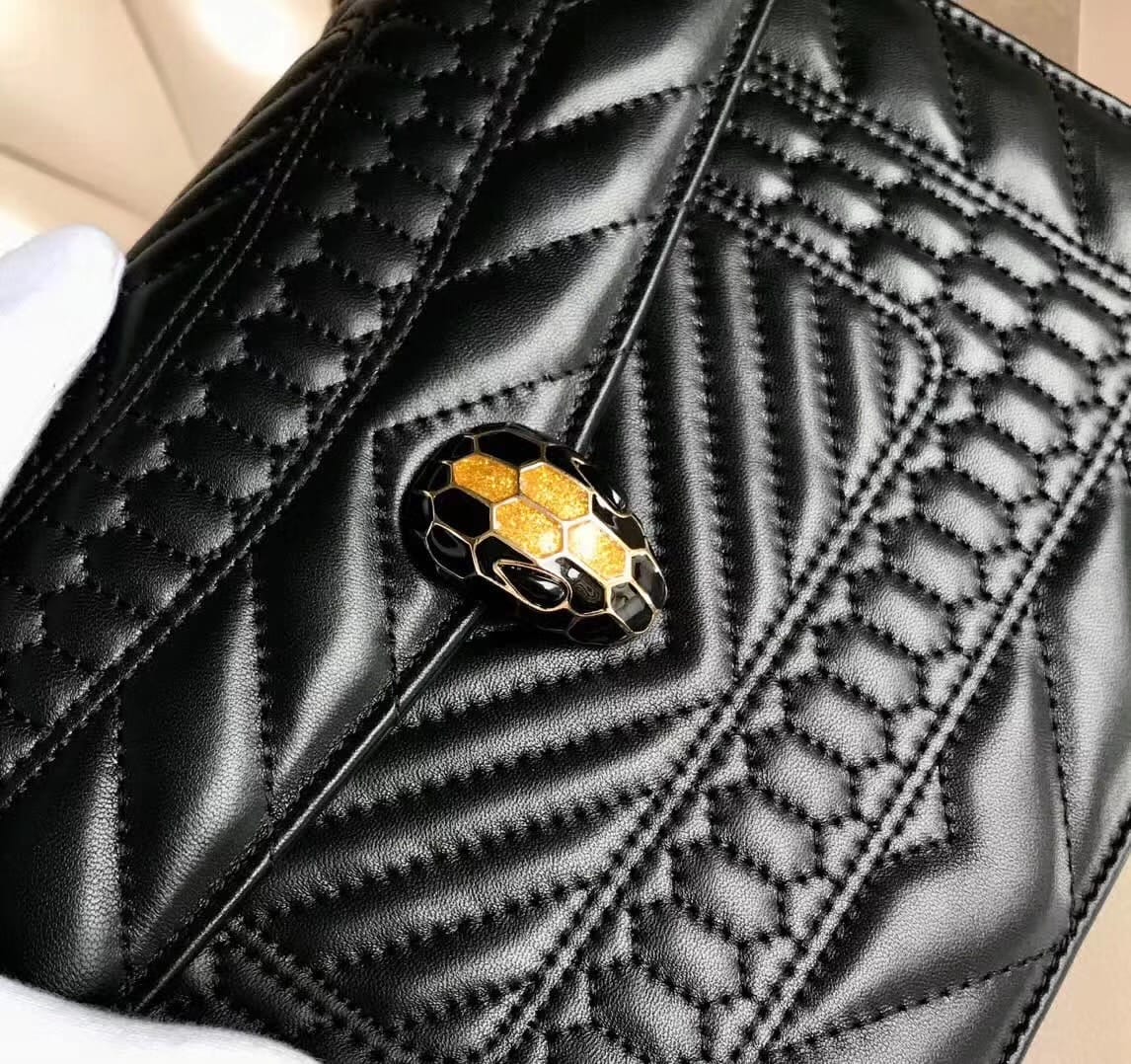 Bvlga** ?限量版黑金?迷人彩色蛇头一衍缝网格刺绣Scaglie 几何图案装饰 配真羊皮内里,市面上唯一对版?每一个绣花细节完美极致??? 给它个专柜 它就是正品?独特的雨衣包装 纯铜式的五金 为复古在添神笔 ??毫不遮掩透露着艺术气息尺寸: 27.5*18.5*7.5cm配全套包装