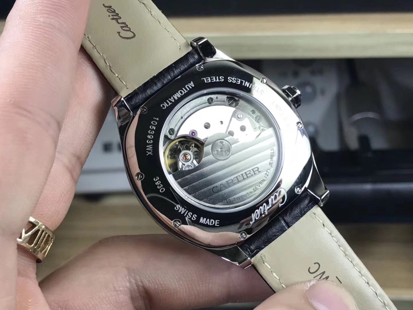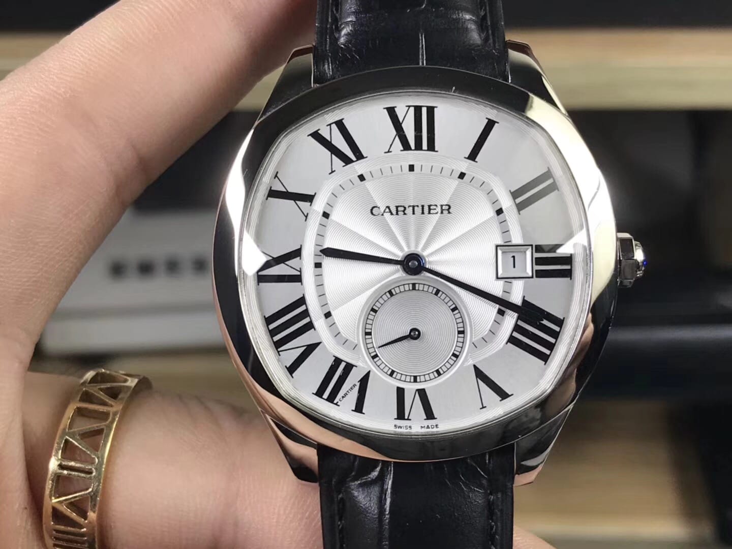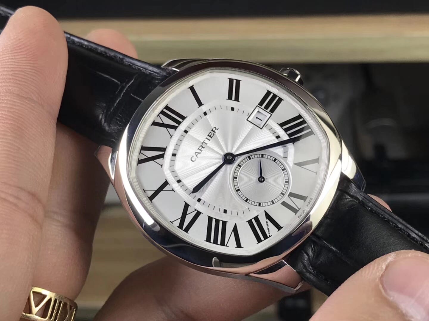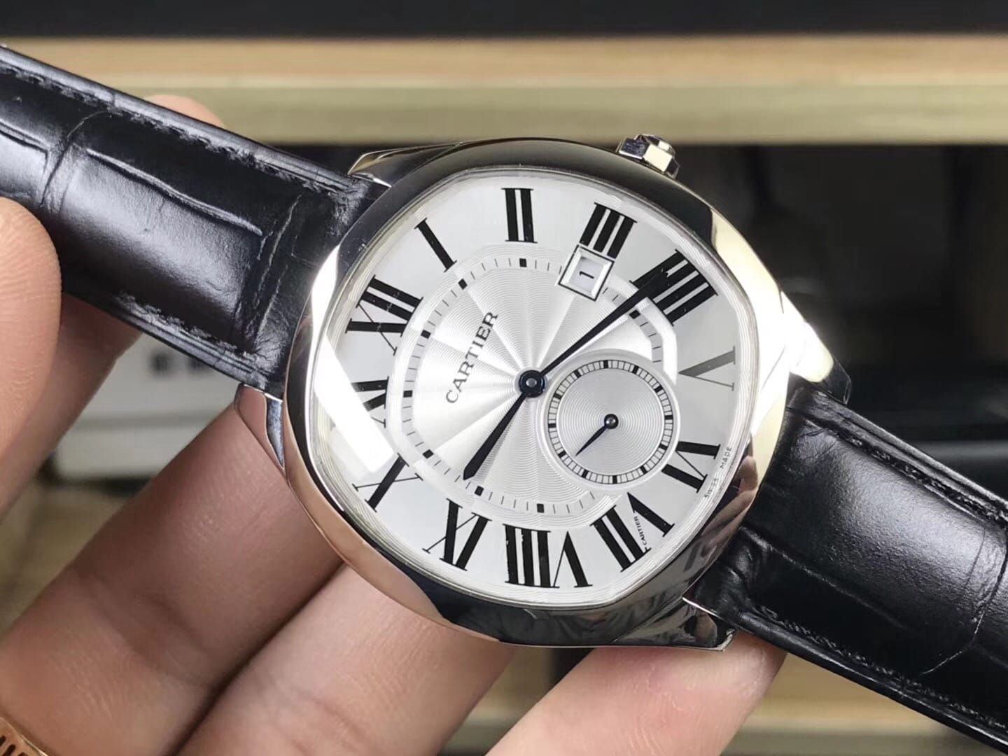 卡地亚DRIVE DE CARTIER系列 尺寸41mm闪亮登场:搭载复刻1904PS-MC机械机芯,以卓越造型成就经典,再添阳刚典雅篇章.卓尔不群的枕形线条利落大方,多切面尖晶石表冠,球状形兰宝石防炫镜面、兰宝石透视底.专业成就品质这就是复刻中的正品。