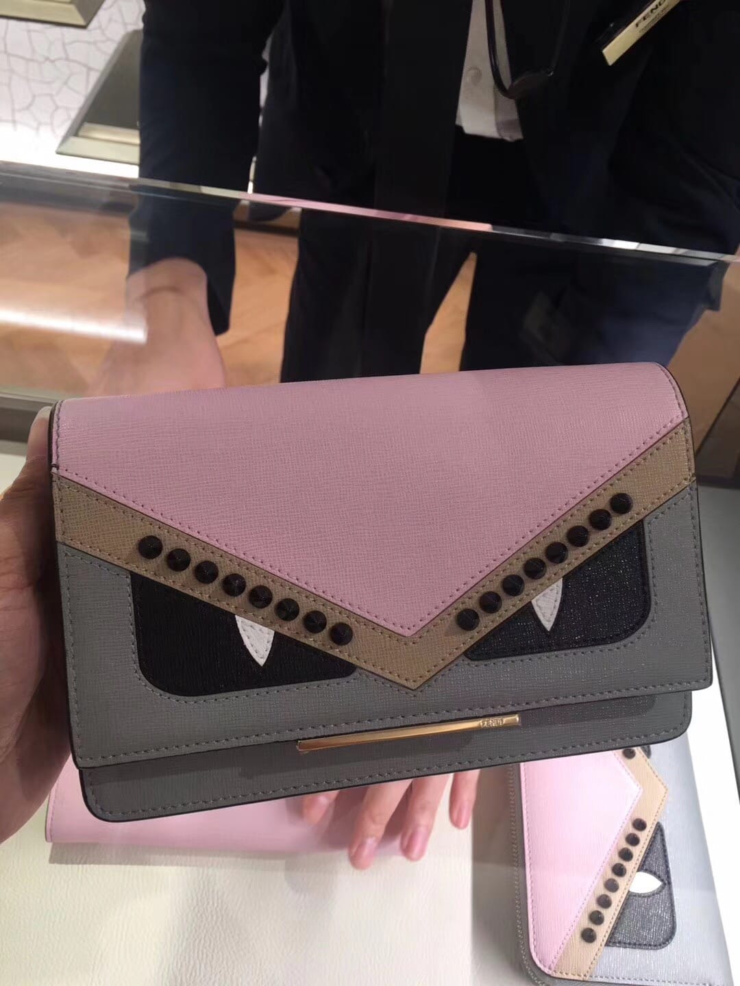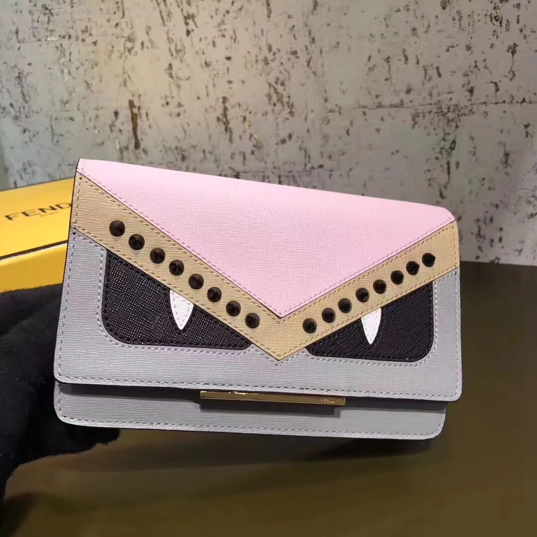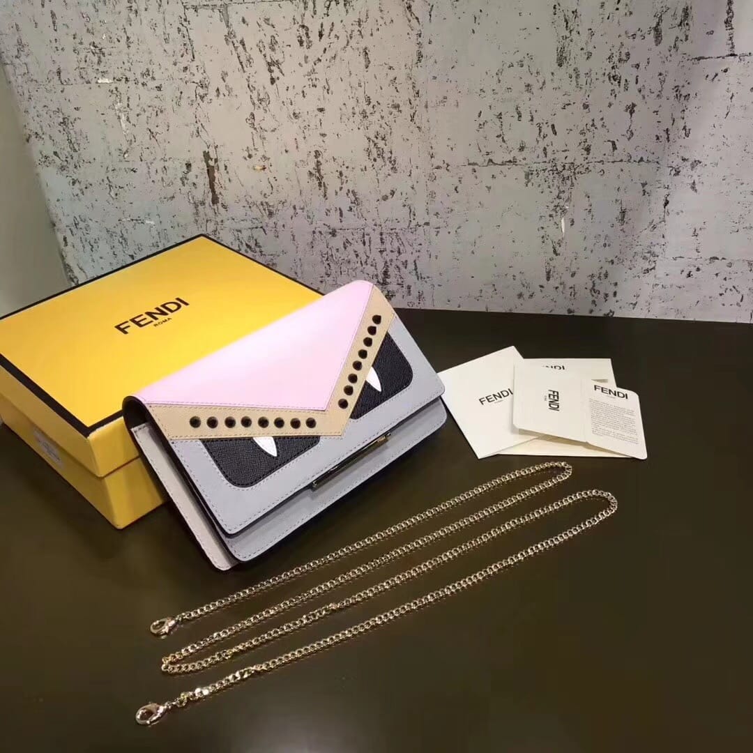 Fendi 0347 WALLET ON CHAIN TUBE十字纹?牛皮链式皮夹,灵感源自经典的BAG BUGS主题,生动活泼小怪兽表情[调皮]平袋和6个卡片夹层的皮夹,可拆卸长链条肩带,适合斜挎在身上或当作手拿包。18cm(全套包装发票)