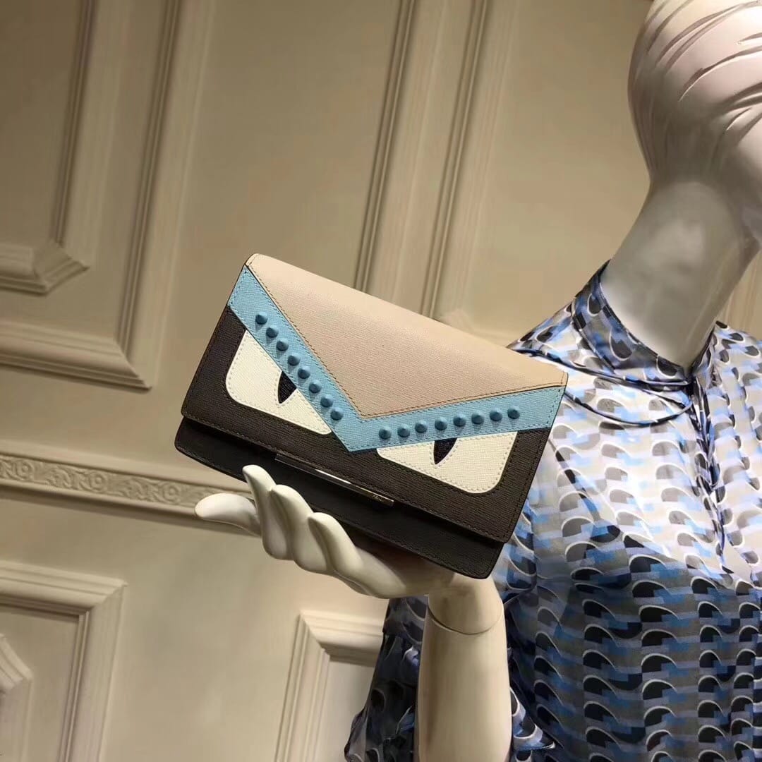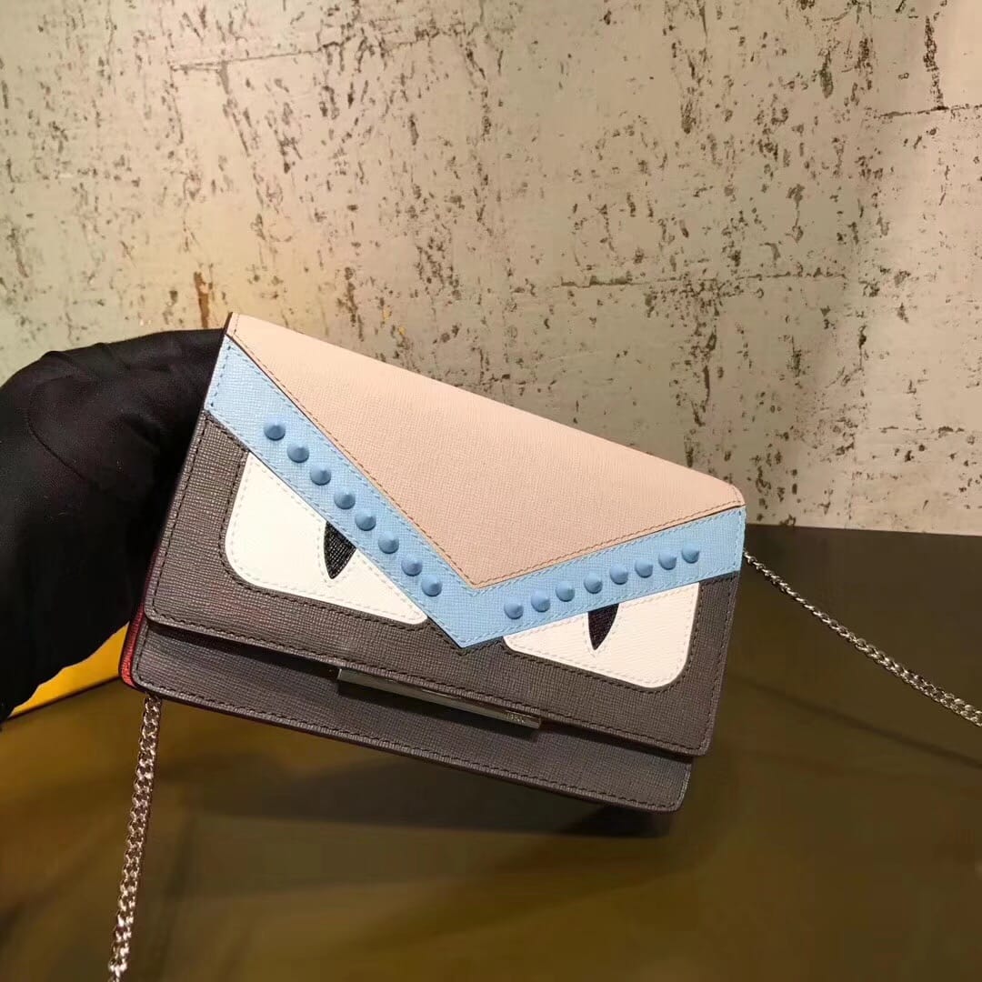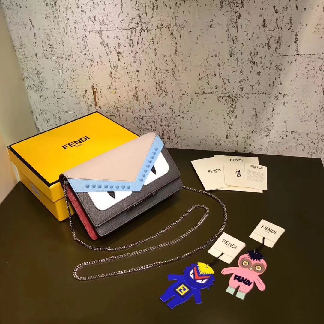Fendi 0347 WALLET ON CHAIN TUBE十字纹?牛皮链式皮夹,灵感源自经典的BAG BUGS主题,生动活泼小怪兽表情[调皮]平袋和6个卡片夹层的皮夹,可拆卸长链条肩带,真空电镀五金,适合斜挎在身上或当作手拿包。18cmF(全套包装发票)