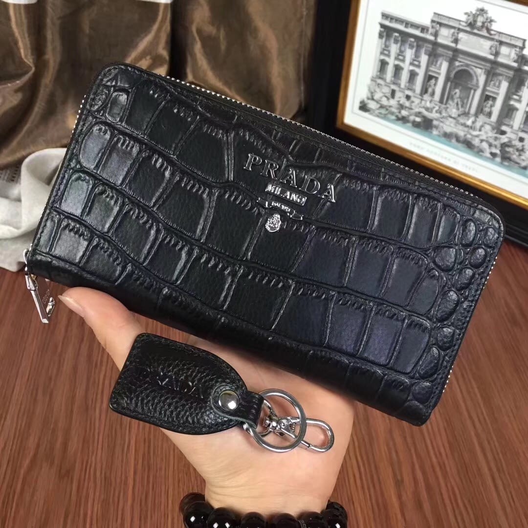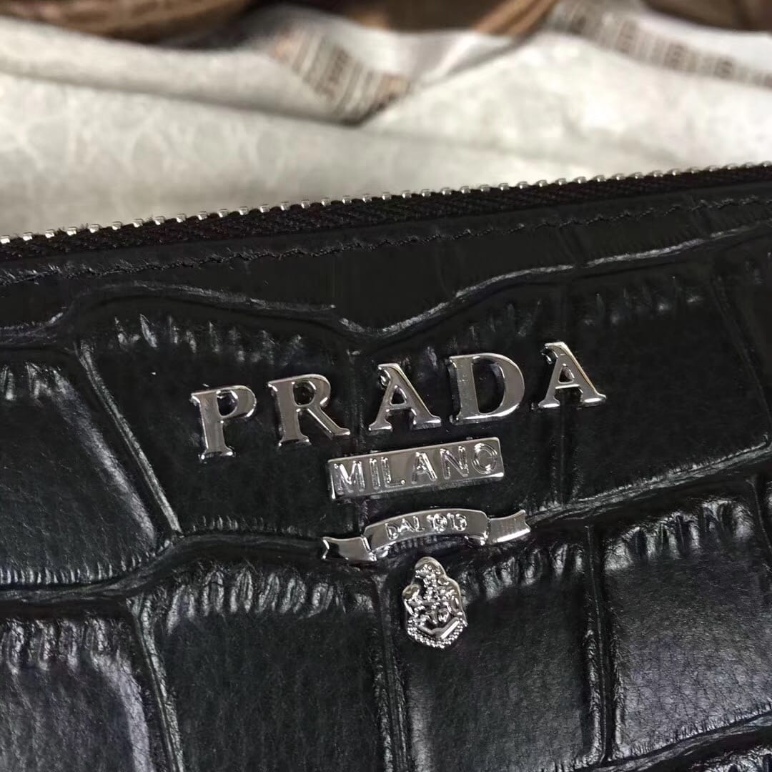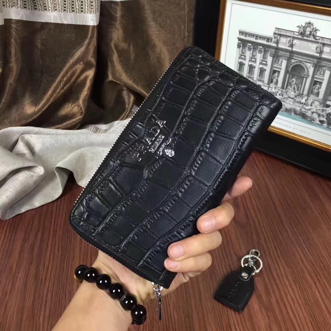PRADA『普拉达』独家新款??注明:搭配礼品盒,礼品袋,发票齐全 【型号】81928# 高端拉链手包小号 【尺寸】19.5-10.5-2cm 【颜色】黑色 高端品质(原单正品) 【材质】PRADA专柜代购经典款??采用原厂进口?皮鳄鱼纹??正宗进口YKK标志五金及拉链及拉链头??皮质柔软手感??独特的品质??简单大方时尚的设计??复杂的手工构制?潮男必备?