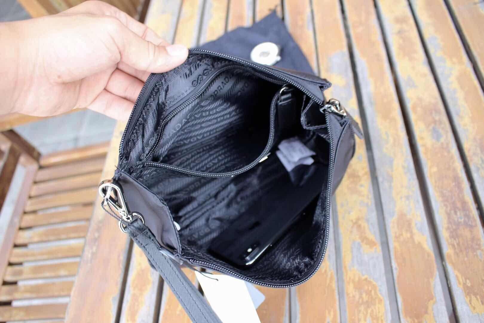 ????尼龙小包,带Saffiano皮革饰边 外部三角形珐琅