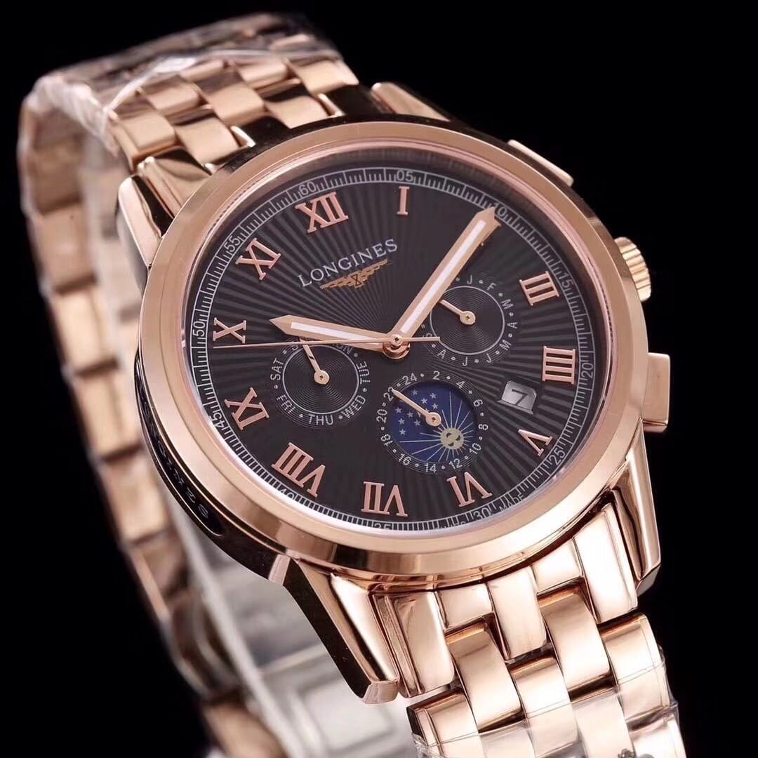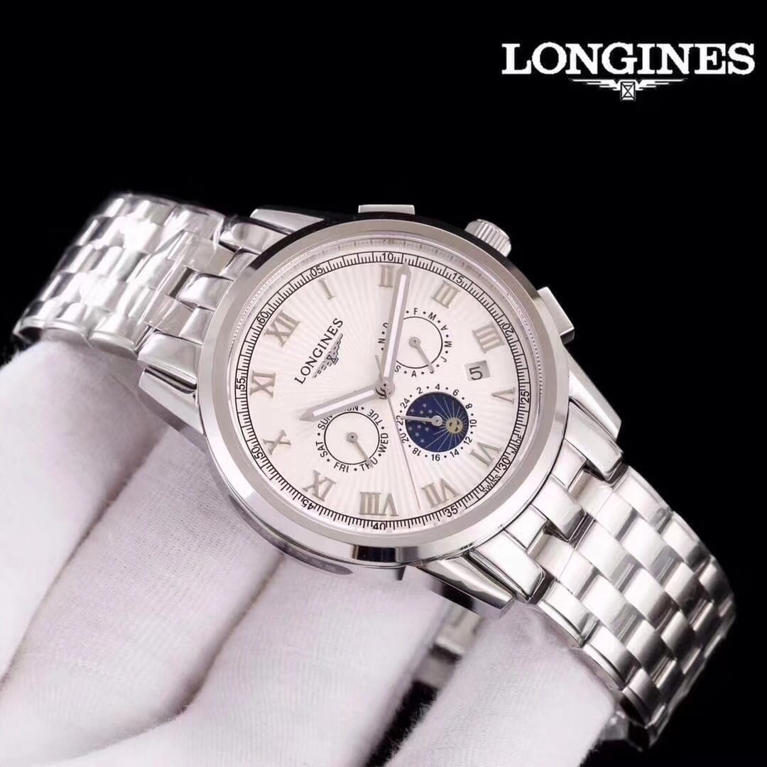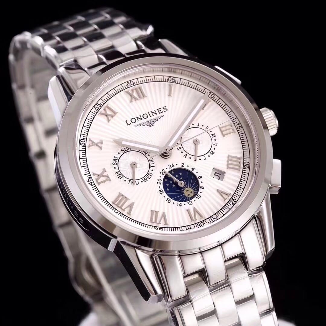浪琴(LONGINES)优雅男士多功能腕表 日月星辰 星期 月份 日历显示 全自动机械机芯 走时精准稳定 316精钢表壳,矿物质水晶镜面 进口小牛皮皮带搭配浪琴原装蝴蝶扣 直径40mm厚12mm