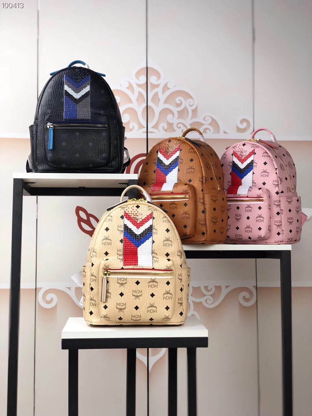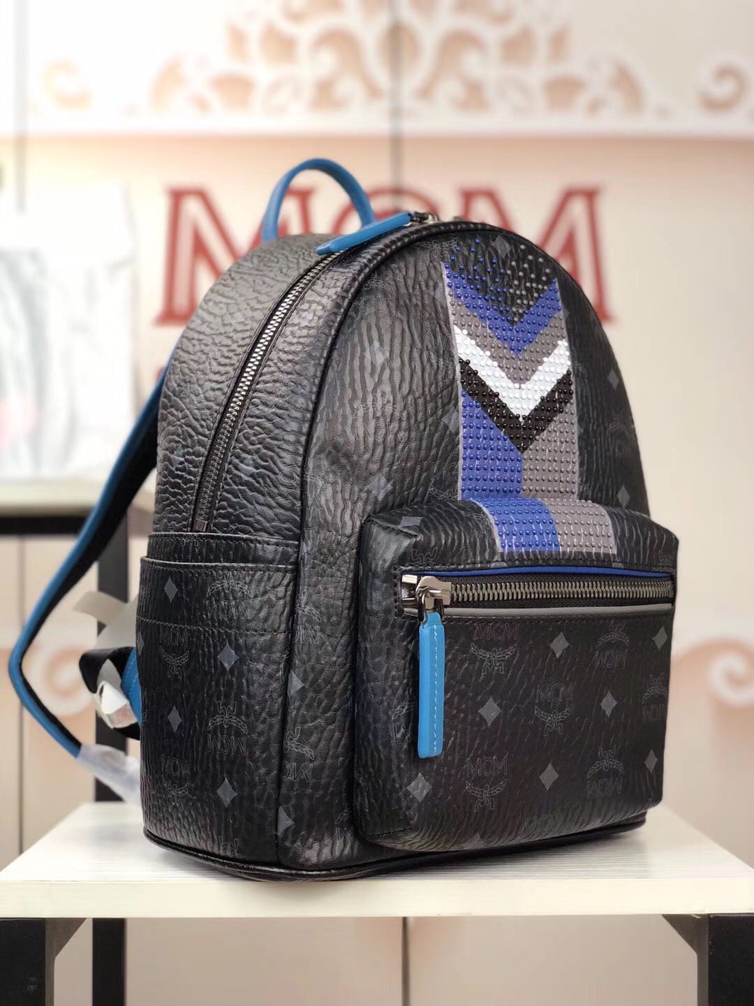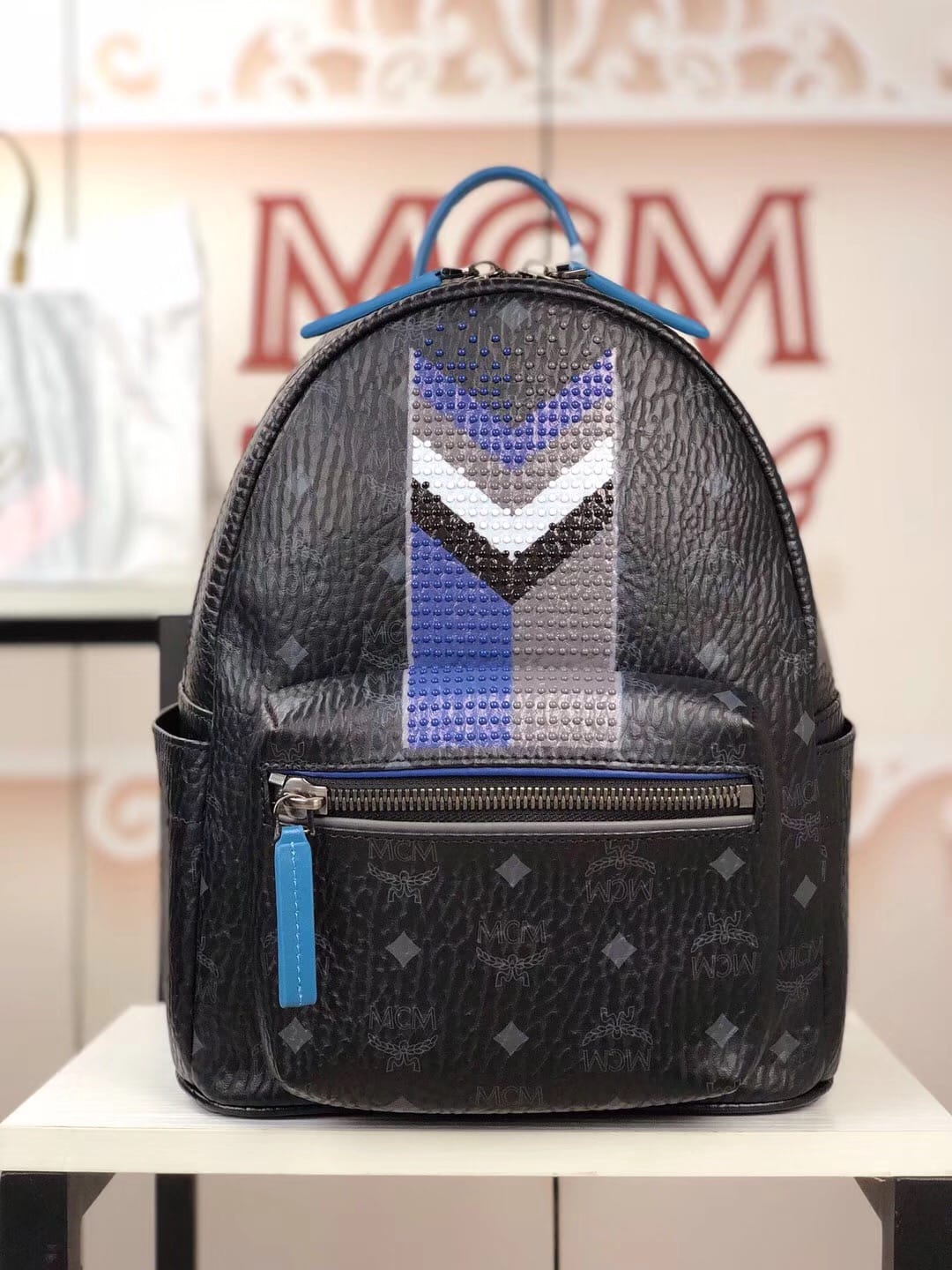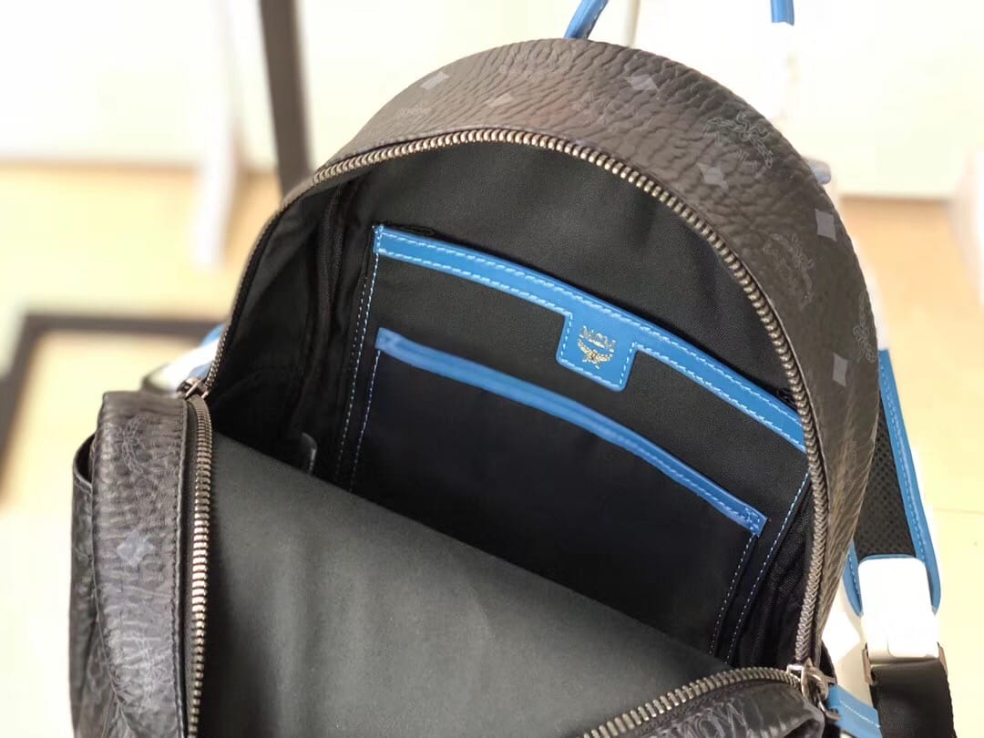 编码:5910 -新款上市-原单货 MCM STARK CHEVRON系列时尚V字型条纹彩虹?钉新款经典印花logo双肩包?背包采用优质网眼材料 提高舒适性和透气性 总共配备多个口袋和一个内置平板电脑?隔层 可为你的所有需品提供充足存放空间 小号:27.33.14 中号:34.41.16