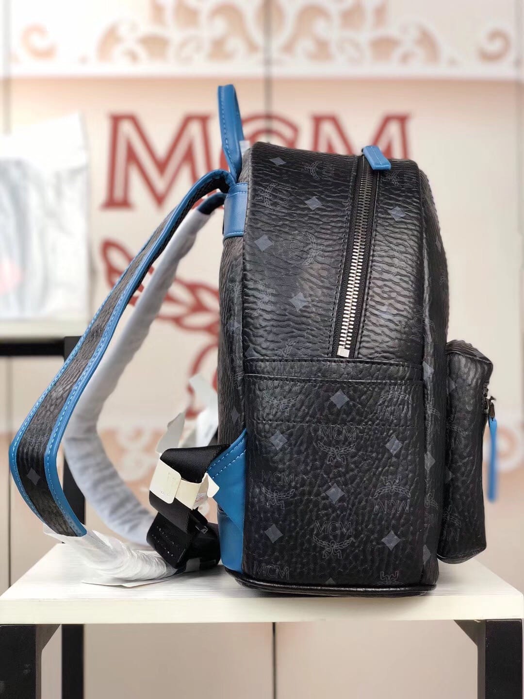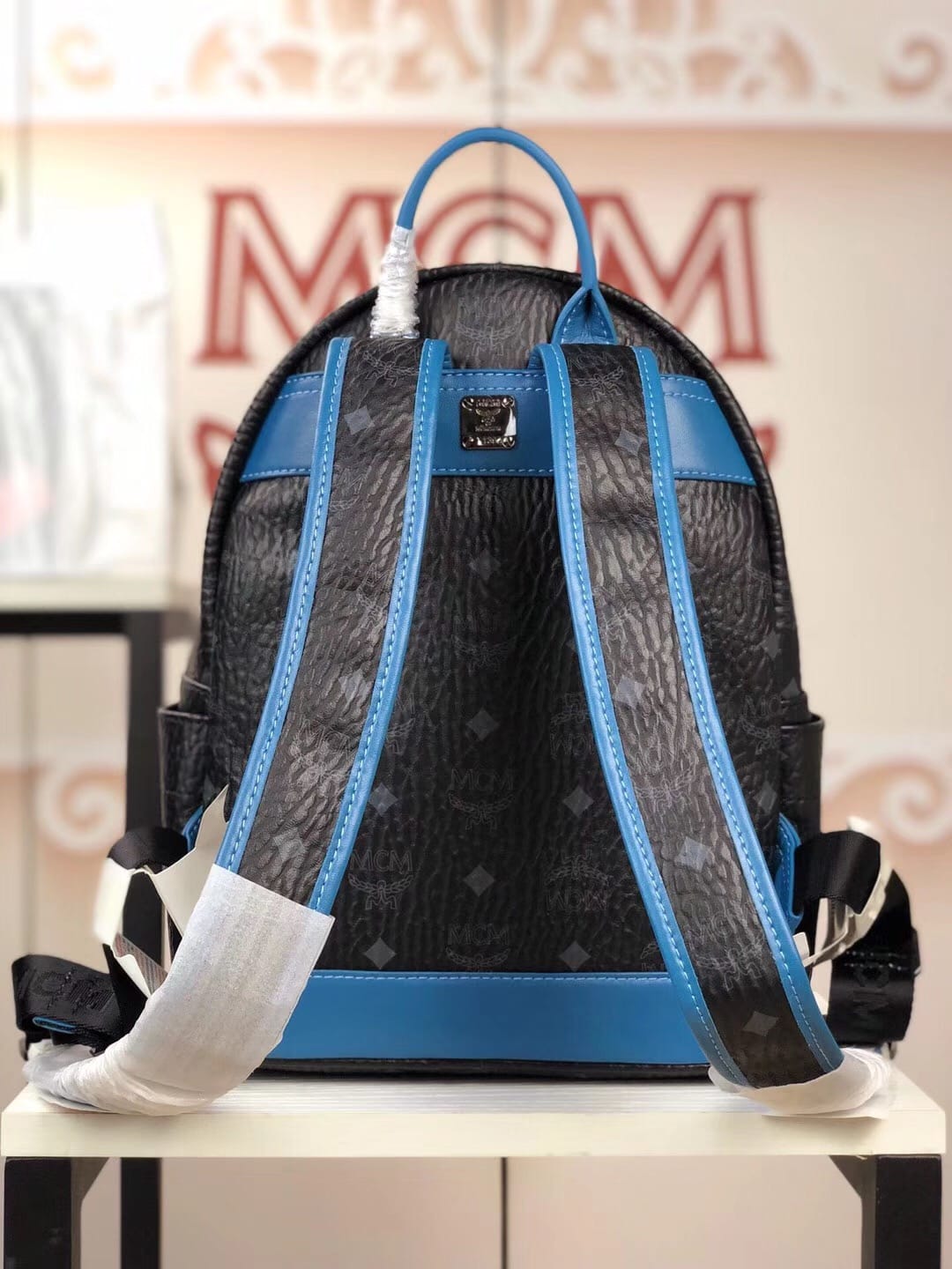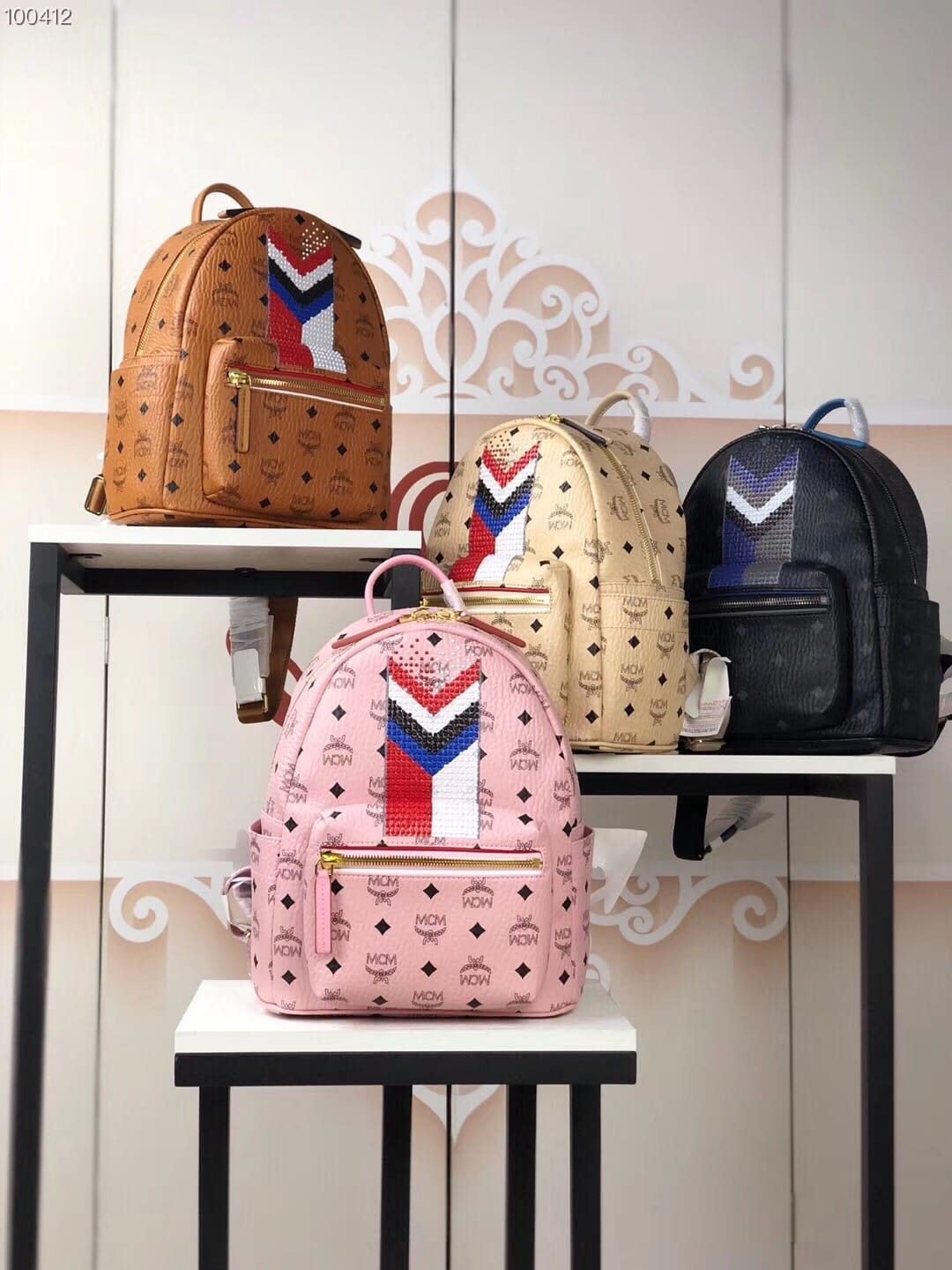 编码:5910 -新款上市-原单货 MCM STARK CHEVRON系列时尚V字型条纹彩虹?钉新款经典印花logo双肩包?背包采用优质网眼材料 提高舒适性和透气性 总共配备多个口袋和一个内置平板电脑?隔层 可为你的所有需品提供充足存放空间 小号:27.33.14 中号:34.41.16