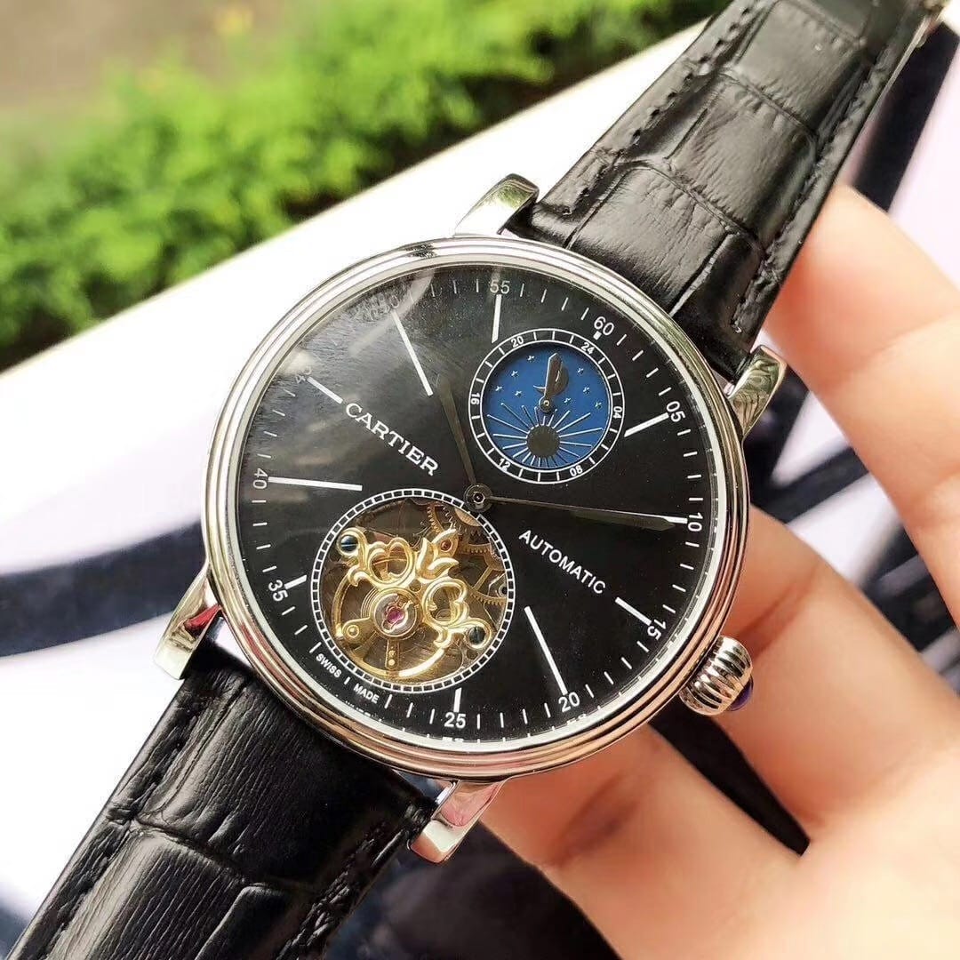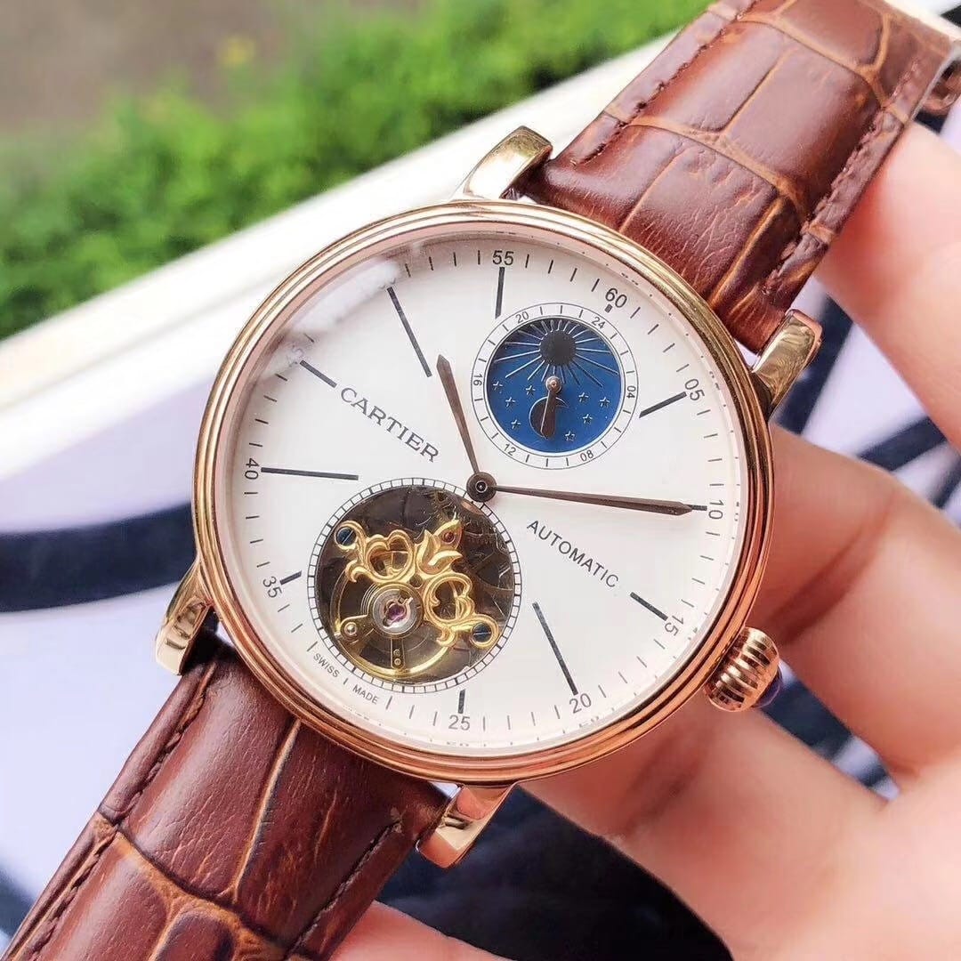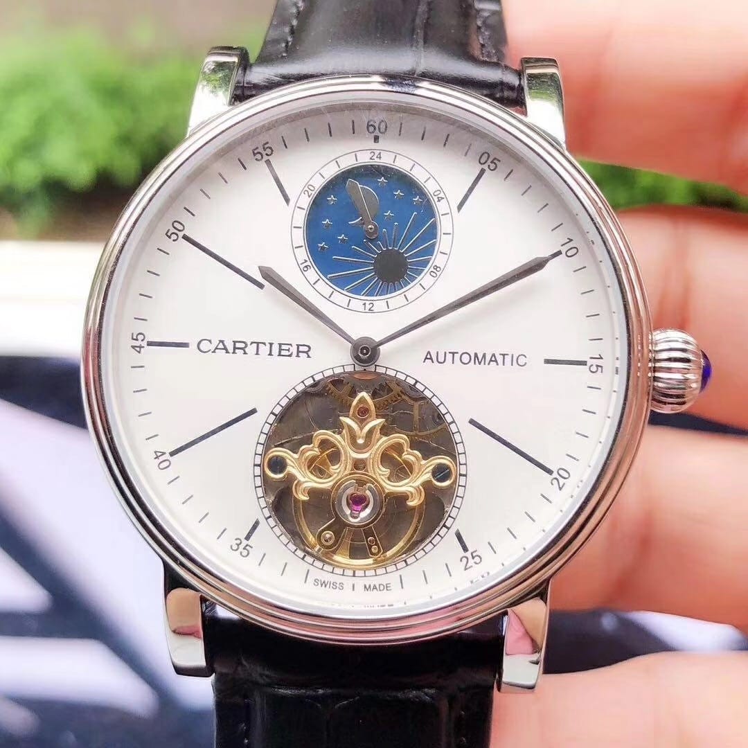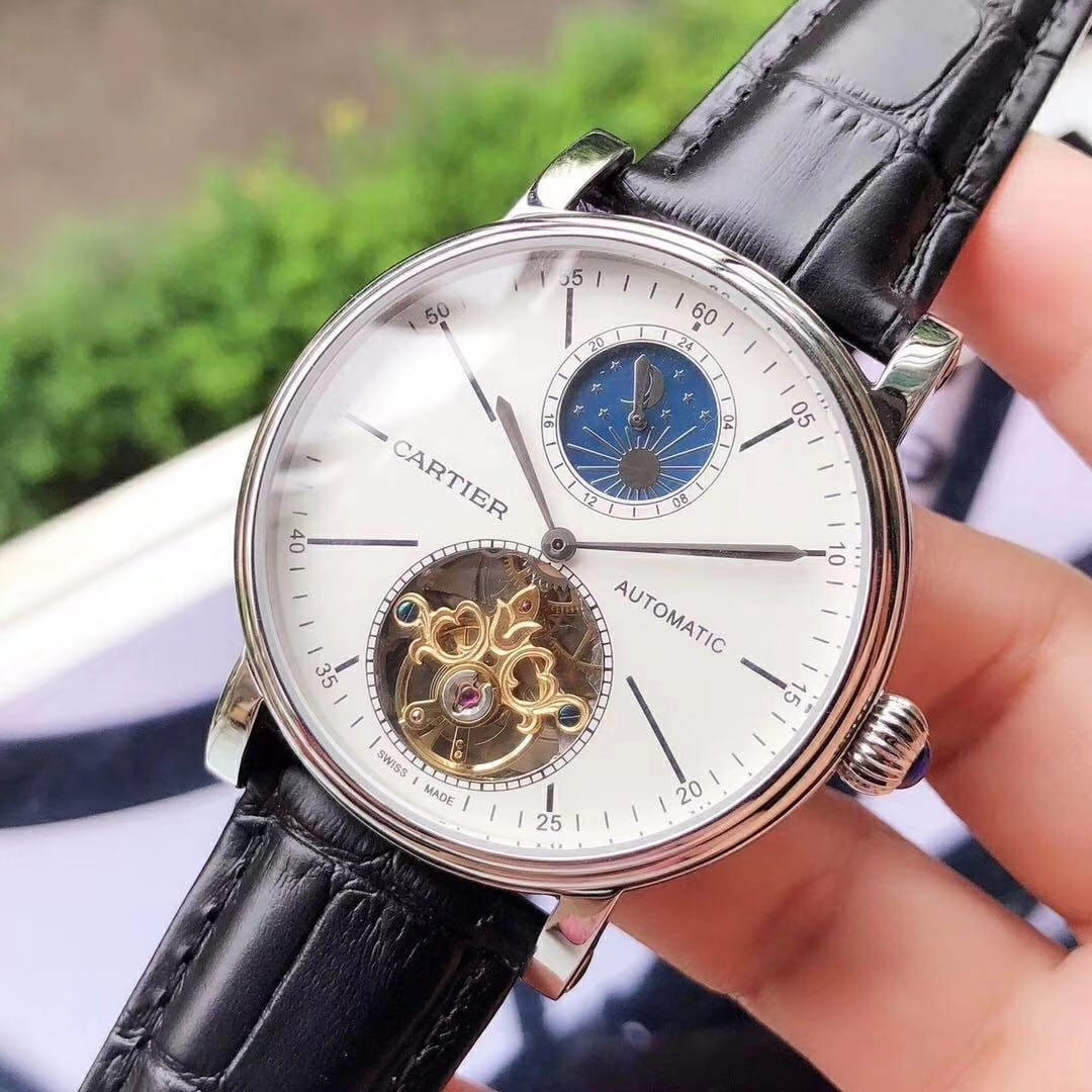 品牌:卡地亚-CARTIER精品男士腕表,简约两针半飞轮搭配12字位日月星辰设计,316精钢表壳,全自动机械机芯,尺寸:43mm厚12mm,顶级进口牛皮表带,装配原装表扣A级水晶镜面