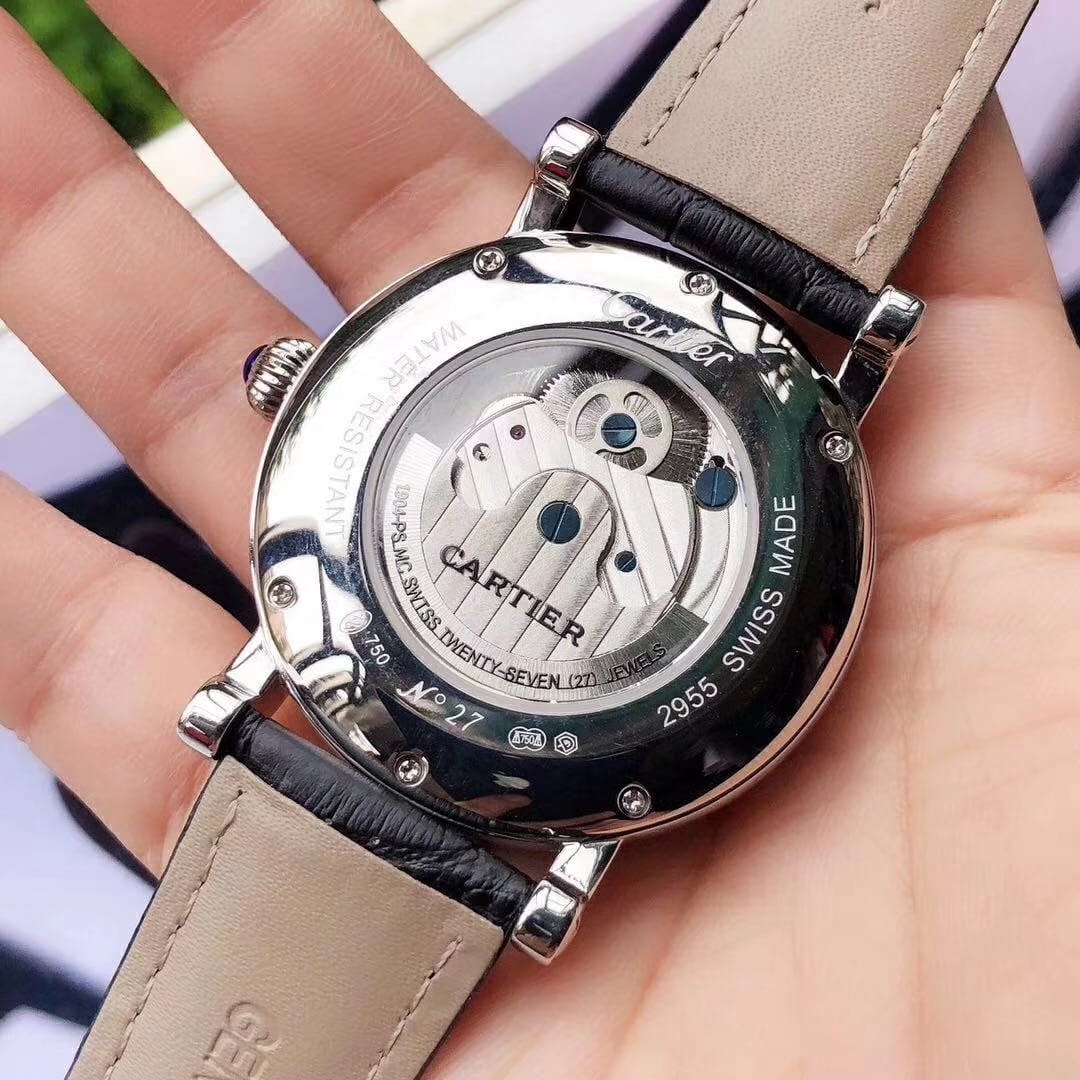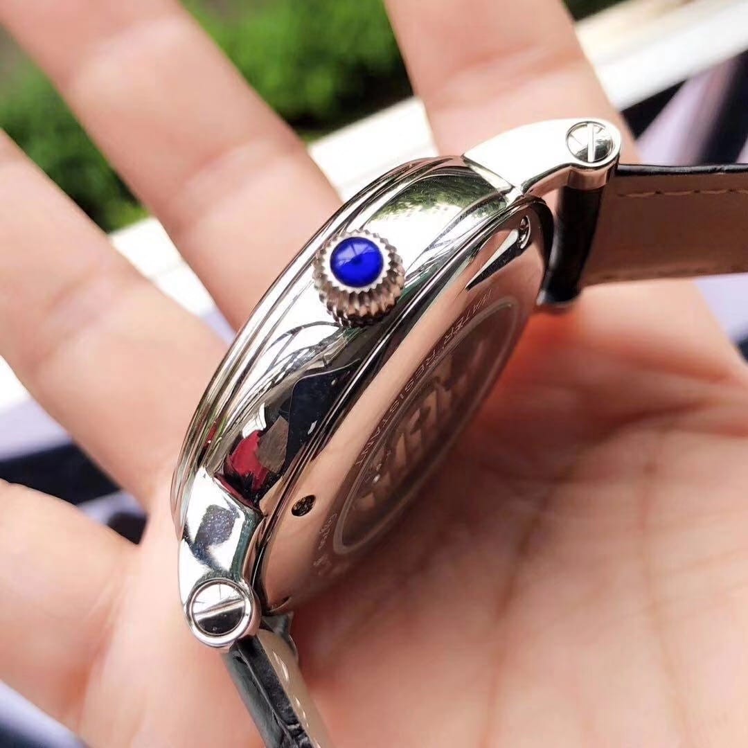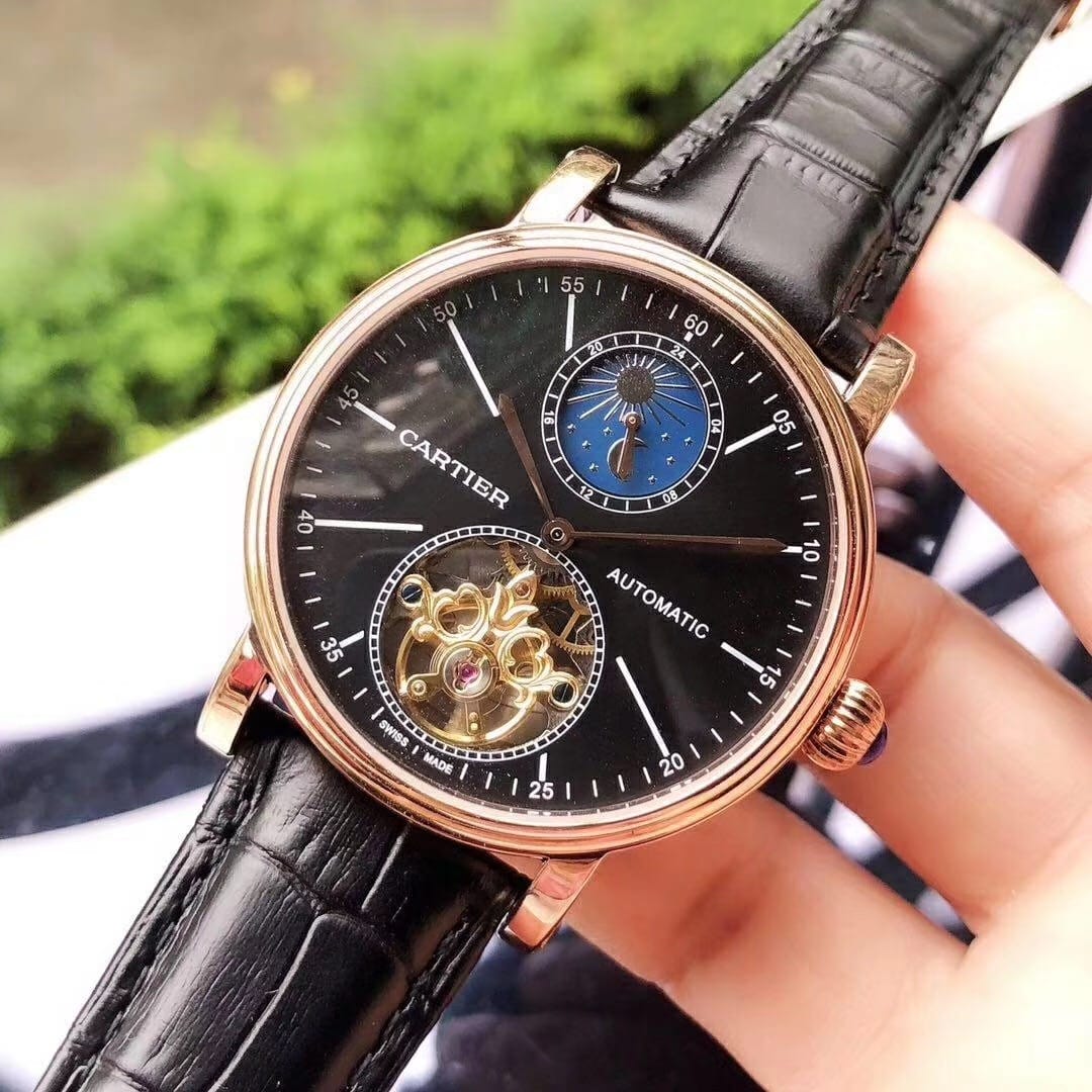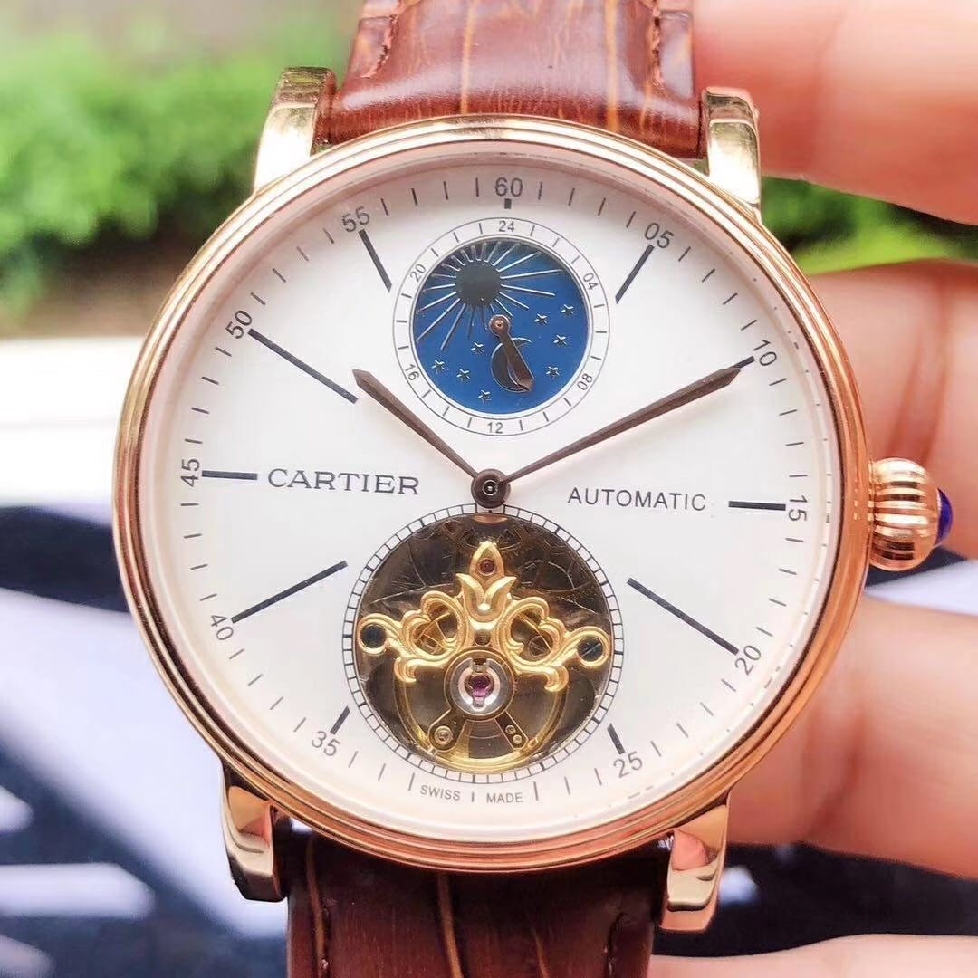品牌:卡地亚-CARTIER精品男士腕表,简约两针半飞轮搭配12字位日月星辰设计,316精钢表壳,全自动机械机芯,尺寸:43mm厚12mm,顶级进口牛皮表带,装配原装表扣A级水晶镜面