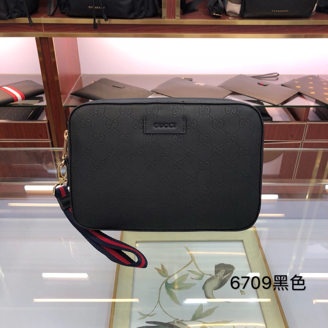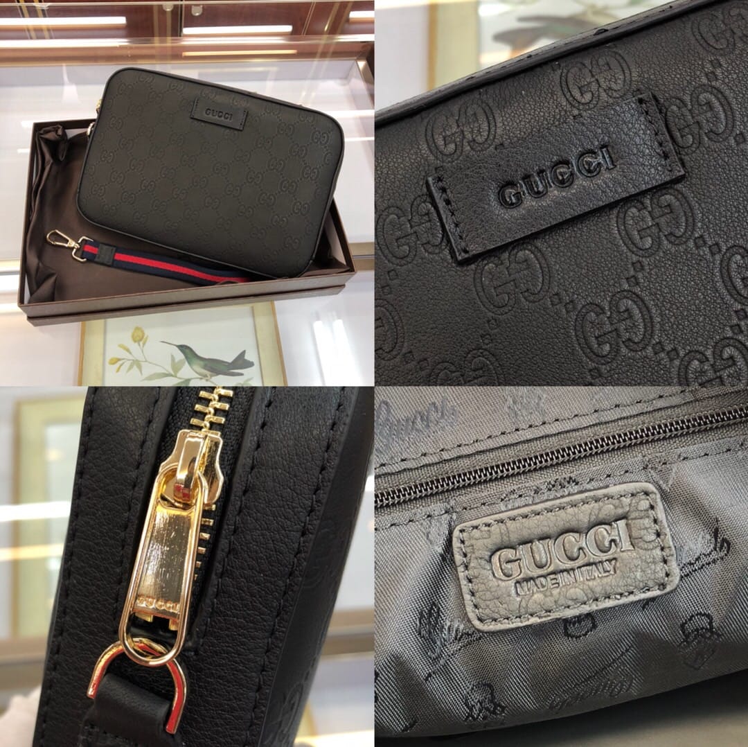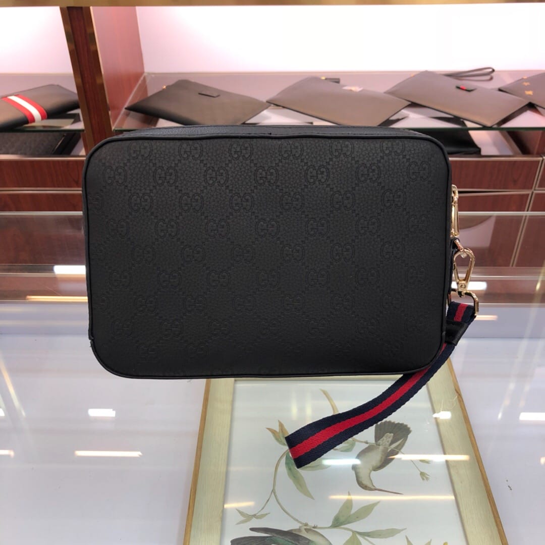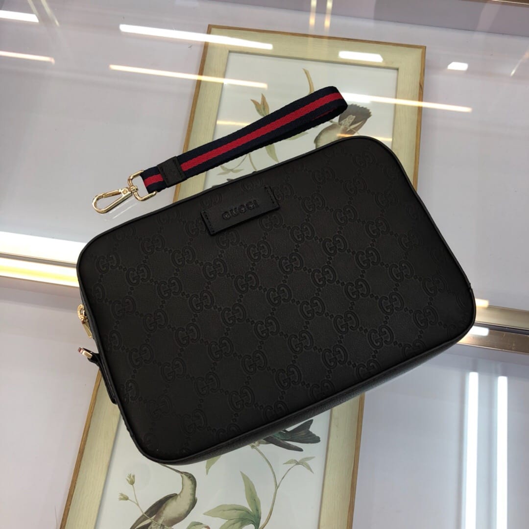 原单网6709手拿包GG图案花牛皮配有可拆卸肩手包,使用Gucci Signafure高级人造帆布制作,黑色和灰色组合,除了GG图案外,还在中心位置加入一条兰红织带,这是Gucci经典热压皮革的新版本,结构更具延展性,(意大利创作)尺寸:23.5*4.5*15.5cm