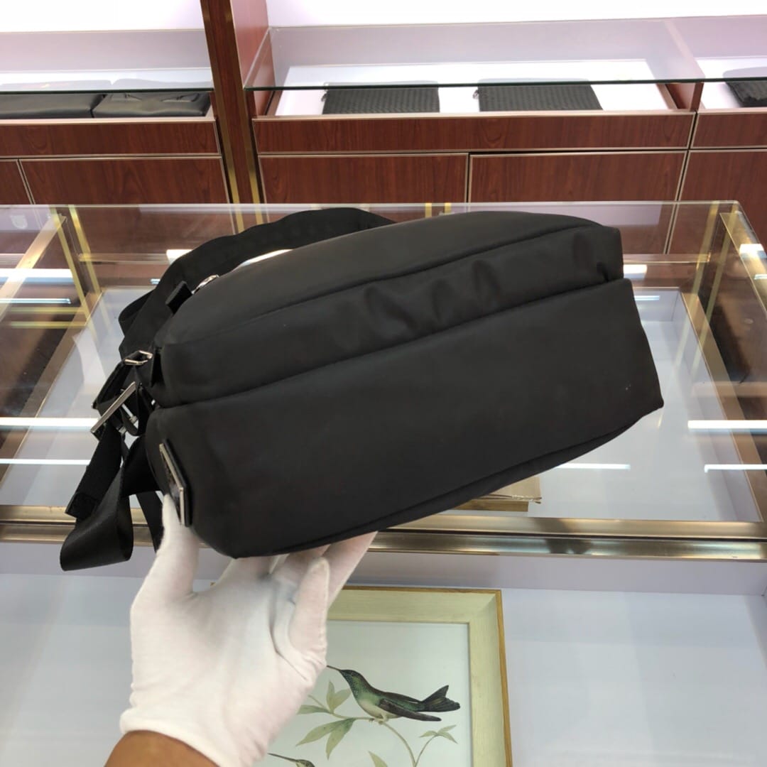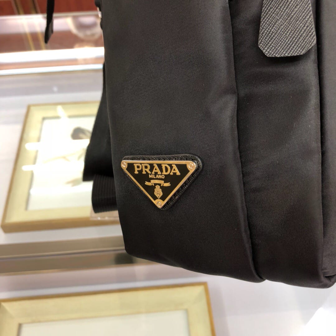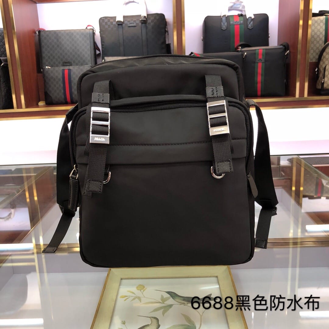 原官网6688尼龙材质带Saffiano皮革饰边 抛光钢质金属配件 深色金属拉链 内部徽标标签,外部三角形搪瓷铭牌 双侧面插扣 背面口袋拉链开合 翻盖下方两个口袋 一个内部拉链袋和两个手机袋 可调式尼龙肩带 尼龙衬里 尺寸:25*8*28cm