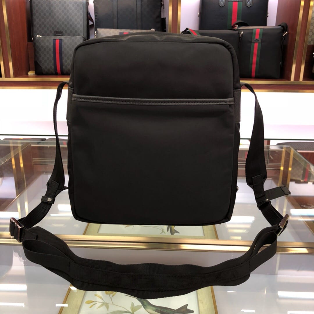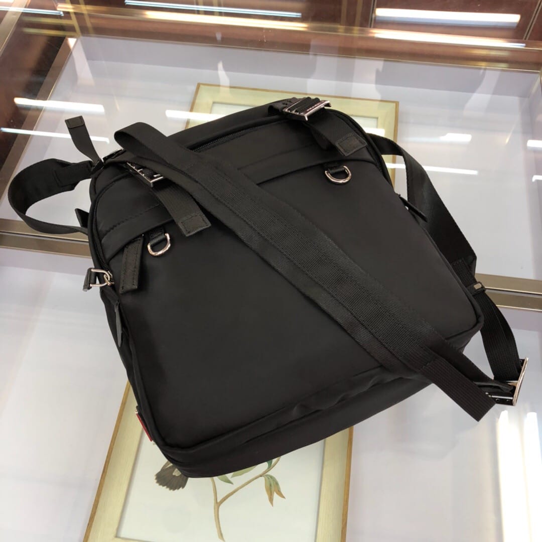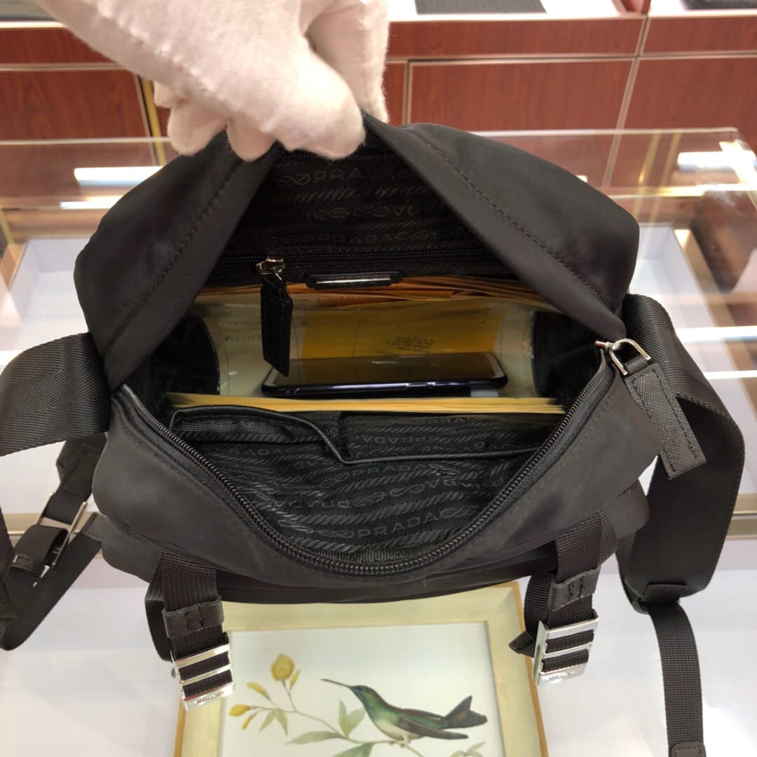 原官网6688尼龙材质带Saffiano皮革饰边 抛光钢质金属配件 深色金属拉链 内部徽标标签,外部三角形搪瓷铭牌 双侧面插扣 背面口袋拉链开合 翻盖下方两个口袋 一个内部拉链袋和两个手机袋 可调式尼龙肩带 尼龙衬里 尺寸:25*8*28cm