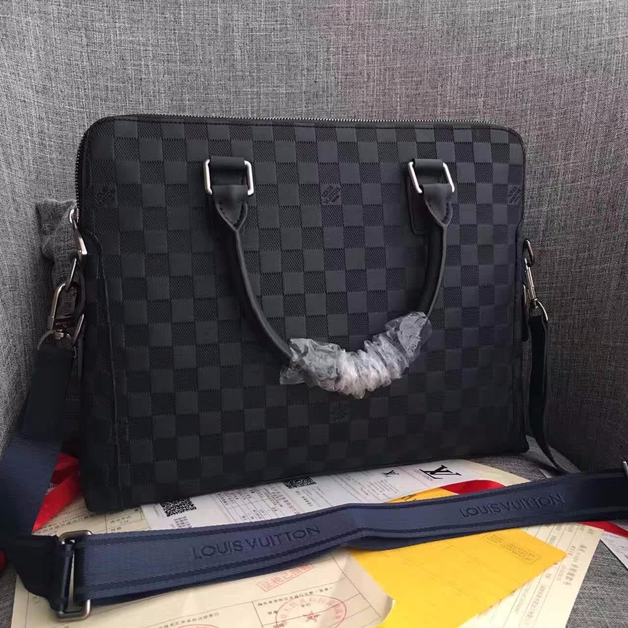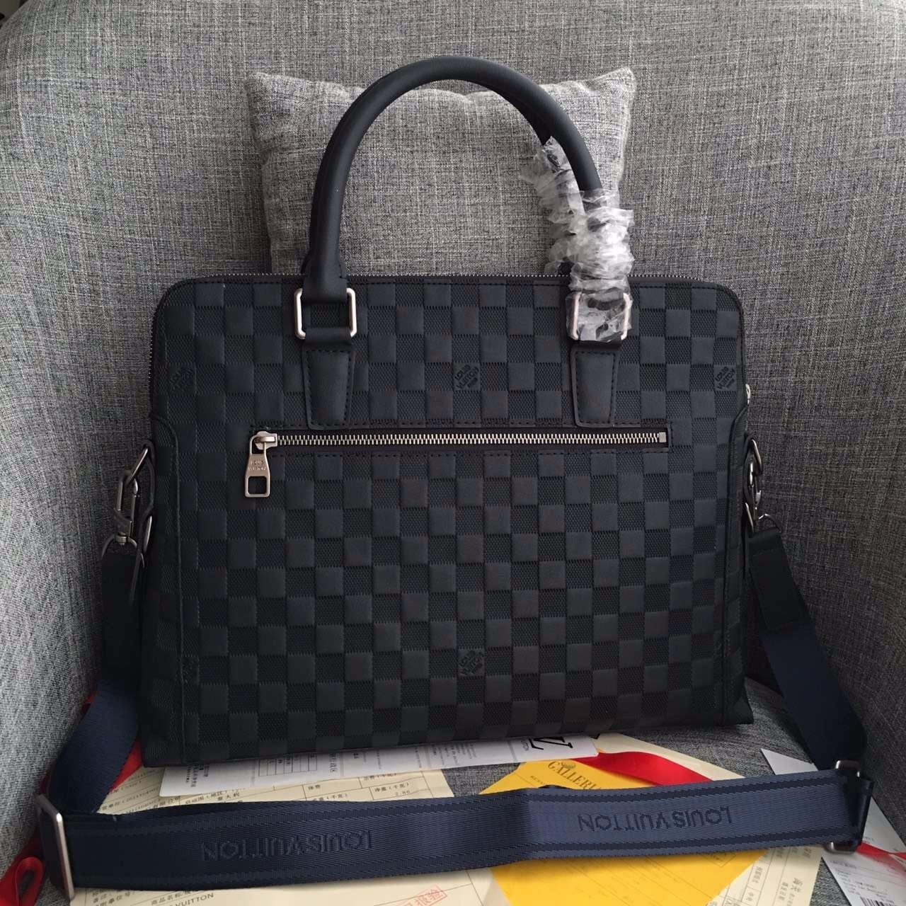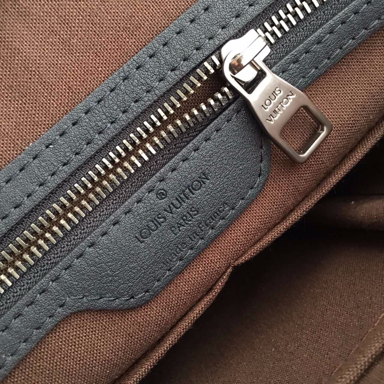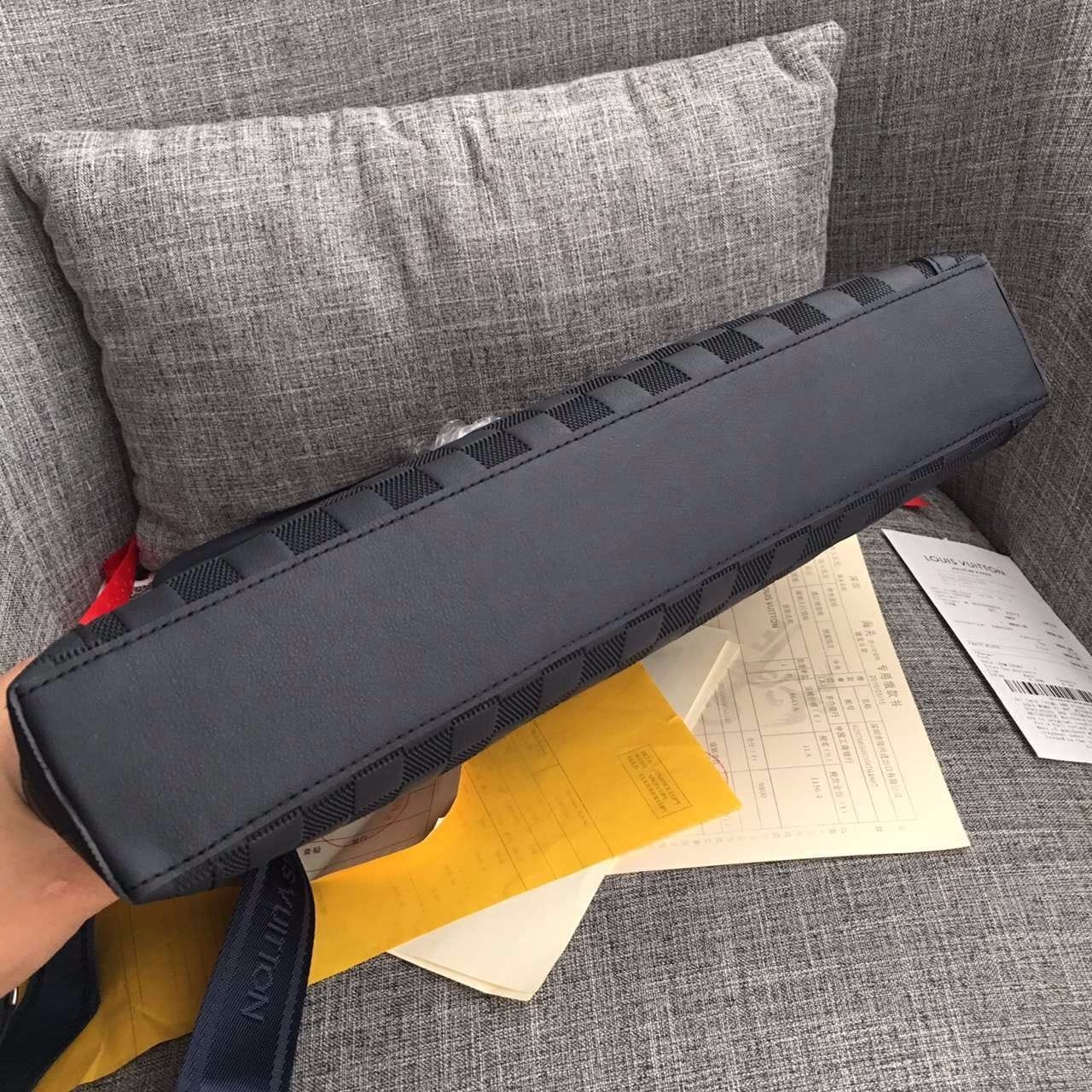 独家实拍!N41151兰色压格公文包,贵族气质,规格37×28×7cm,材质:小牛皮压格,皮色泽很哑,原版边油,冰川灰内里,肩带标准的4cm(正品开磨),内设序列号,此款绝对独家,从选材到5金都对版复刻.跟足原版分格,做工精细,专柜无差异!