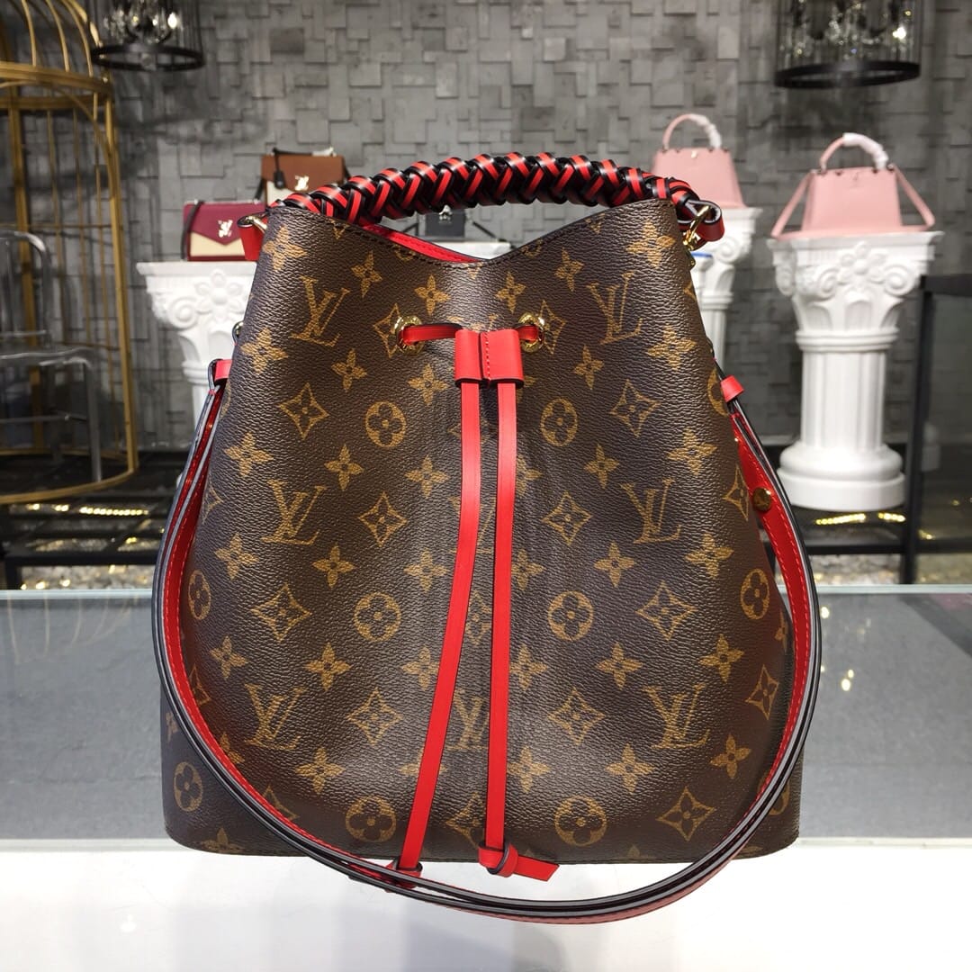 LU N?ONO? 水桶包 M43985 此款NéoNoé手袋的设计原型可追溯至1932年出自嘉士顿-路易·威登之手的作品。精工细作的编织手柄为本季新品的设计特色,由缤纷多彩的皮革条带编织而成,并采用手工染边装饰。采用柔软的Monogram帆布面料,配有同色系皮革系带与可调节牛皮包带。-Monogram涂层帆布-光滑牛皮饰边-超细纤维内衬-金色金属饰件-顶部编织手柄-拉链内袋-配有摁扣的可调节长包带-系带闭合-size26*18*26