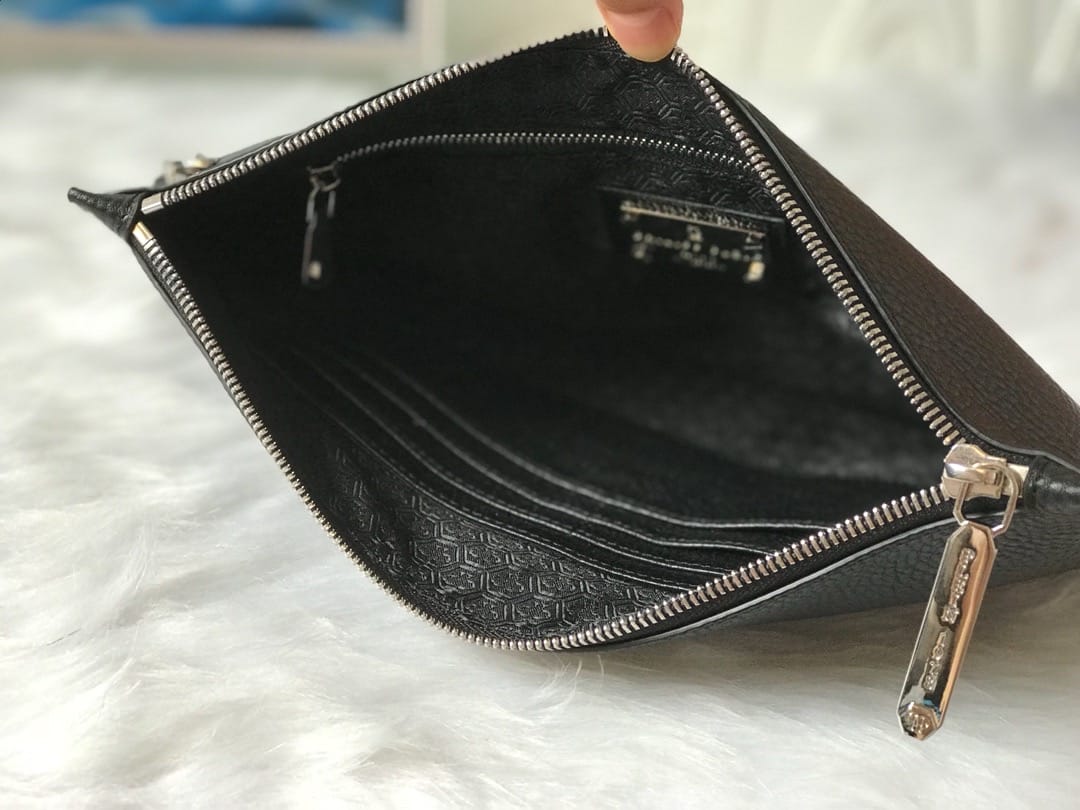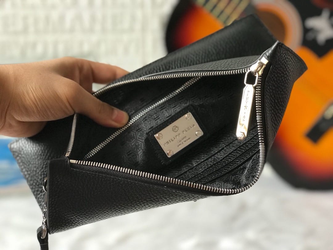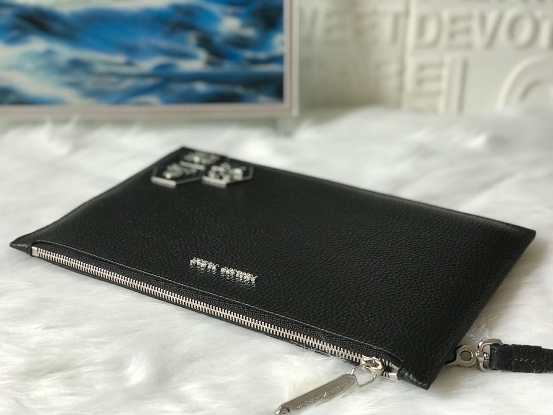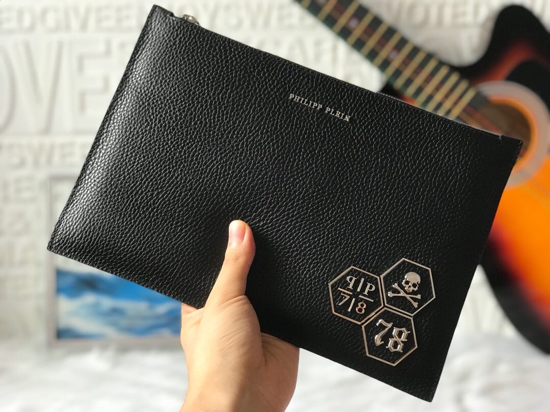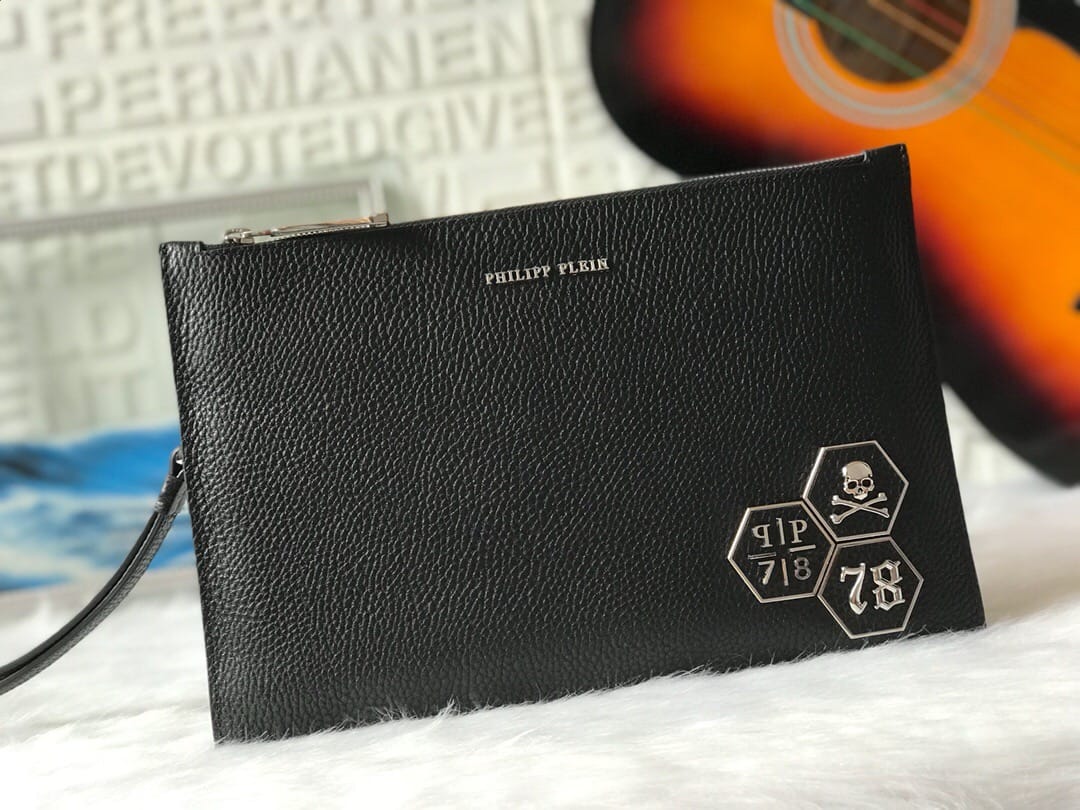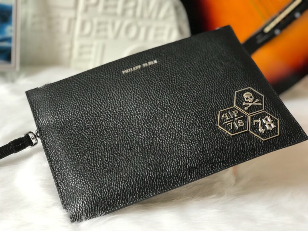 ?【PHILIPP PLEIN?菲利普·普来因】?品牌创于德国/一直享有顶级潮流之称??男士手拿包??高端品质?原版进口牛皮?精湛手工更彰显尊贵??最新立体五金标牌装饰?细节做到一丝不苟。品质无需质疑??黑色 尺寸:29-19cm?