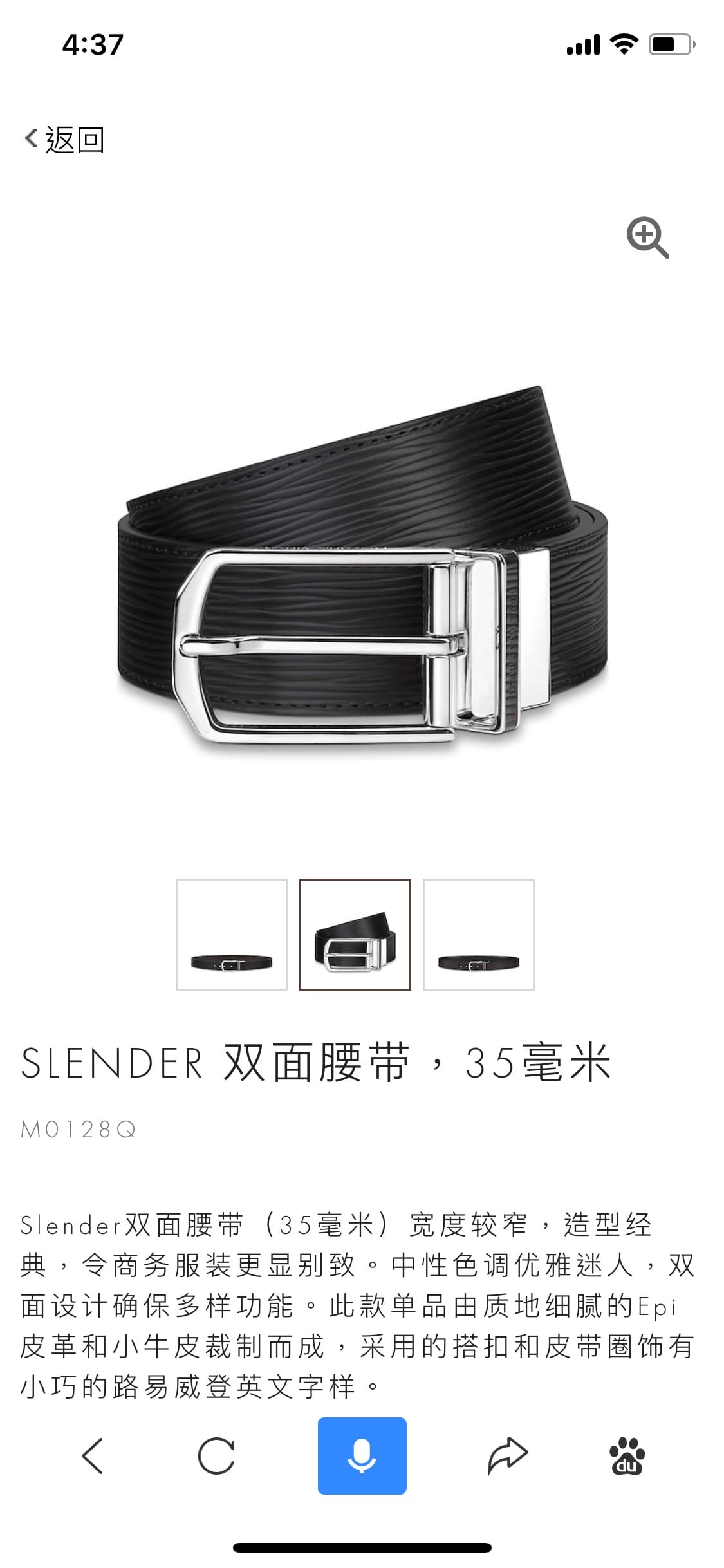 配全套包装 SLENDER 双面腰带M0128。Slender双面腰带(35毫米)宽度较窄,造型经典,令商务服装更显别致。中性色调优雅迷人,双面设计确保多样功能。此款单品由质地细腻的Epi皮革和小牛皮裁制而成,采用的搭扣和皮带圈饰有小巧的路易威登英文字样。