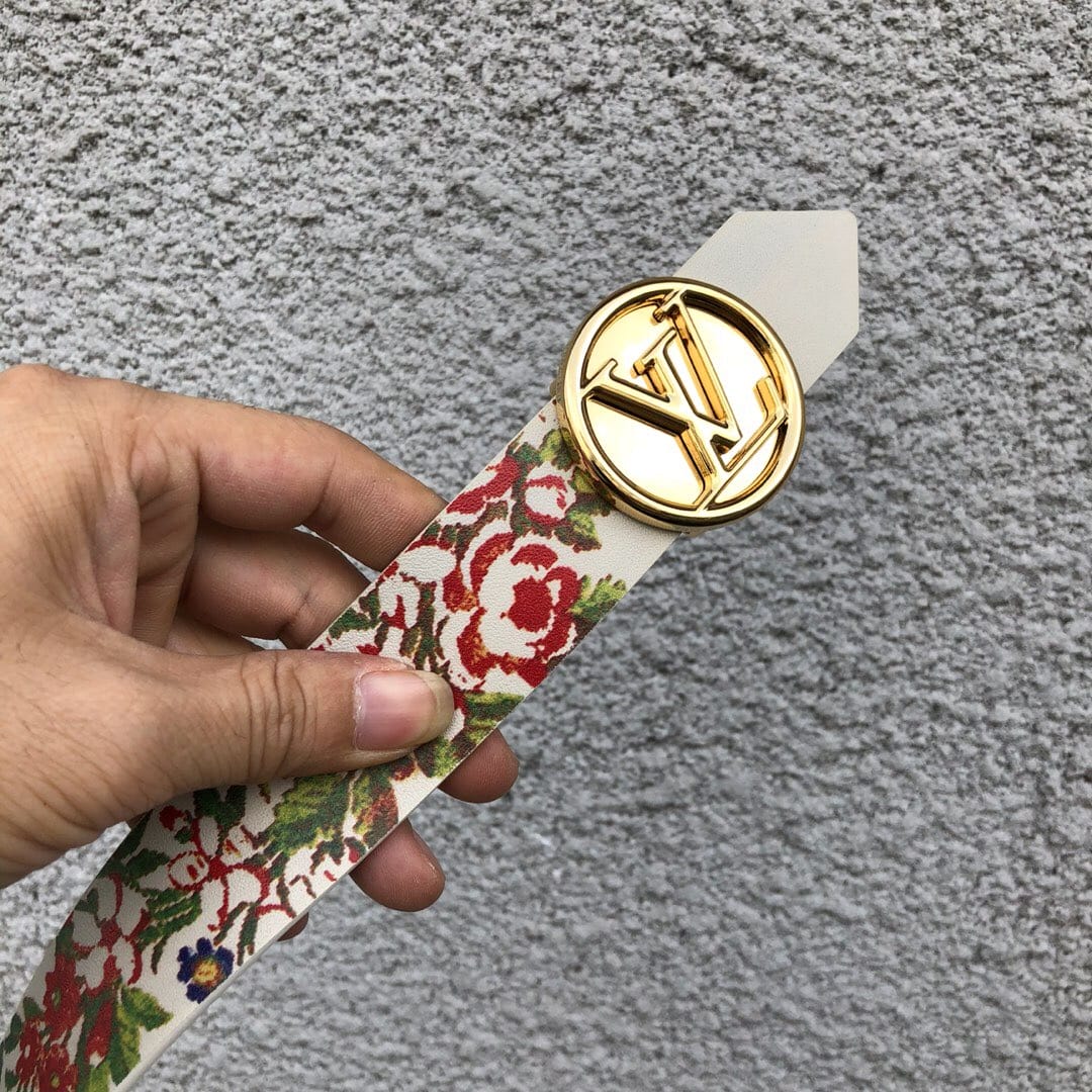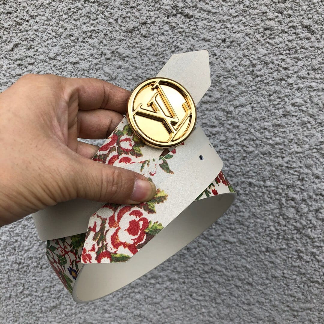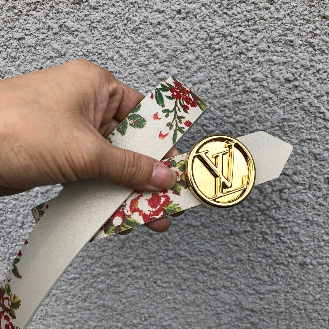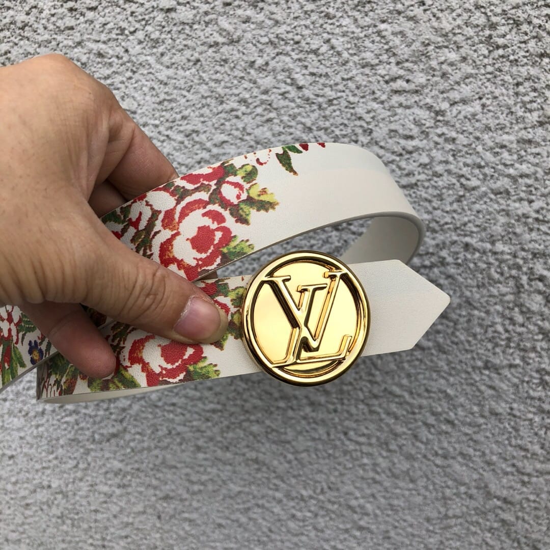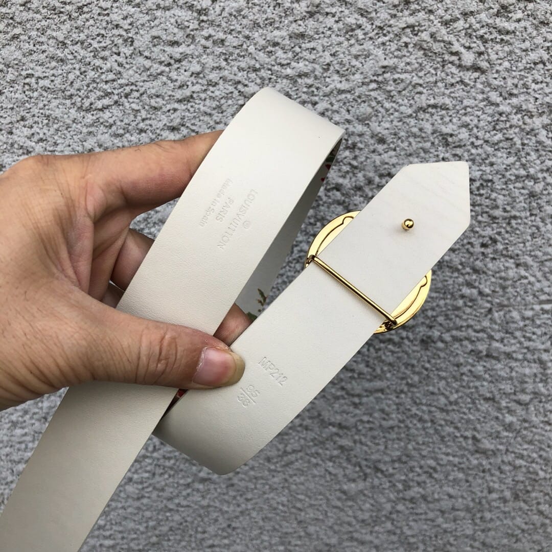 配全套包装 LV CIRCLE 腰带,35毫米MP212源自2018春夏成衣系列的装饰灵感,此款小牛皮腰带两面印有巴洛克风格的华丽花饰。银色金属LV Circle搭扣,为夏日造型增添女士魅力。