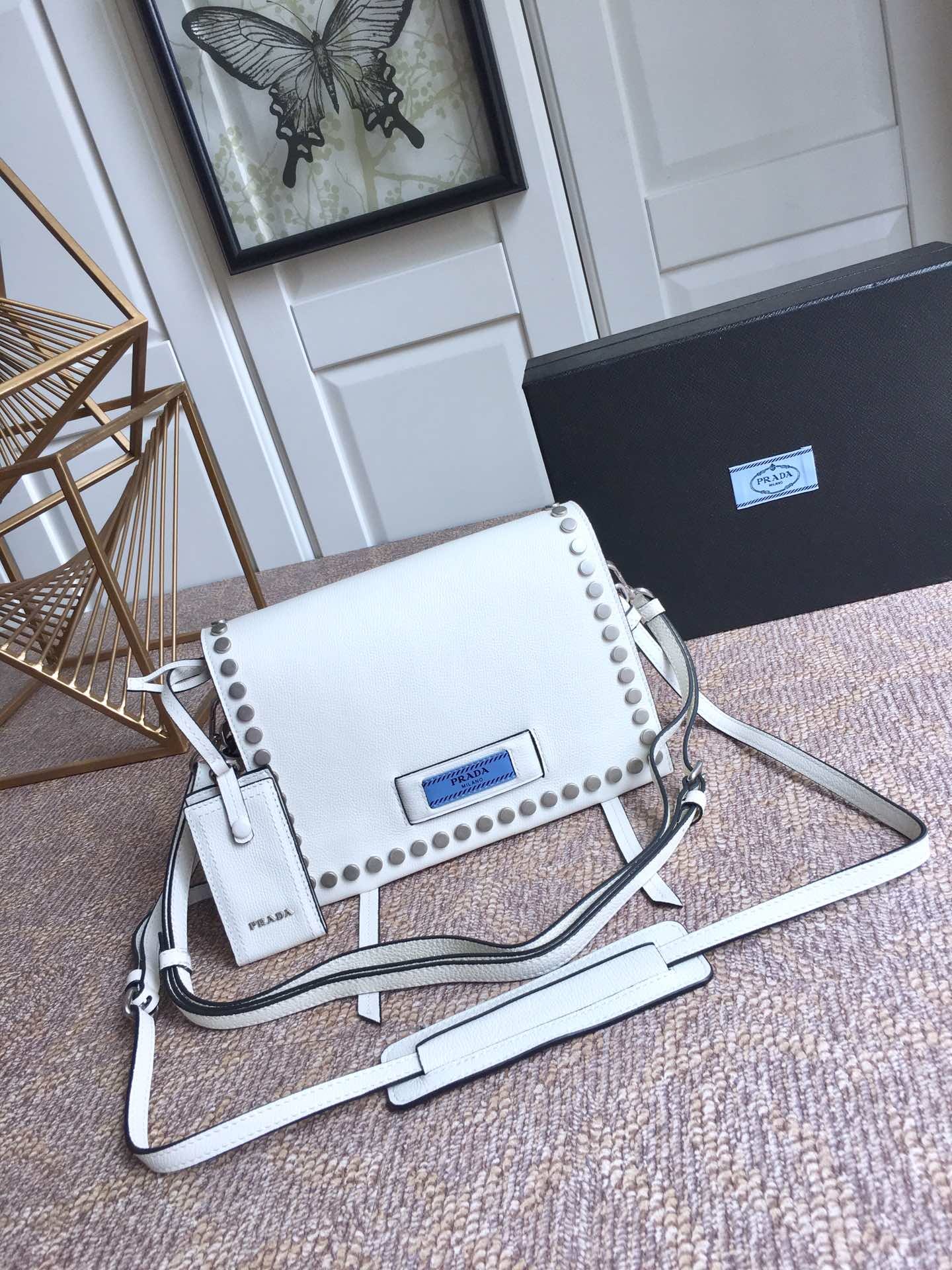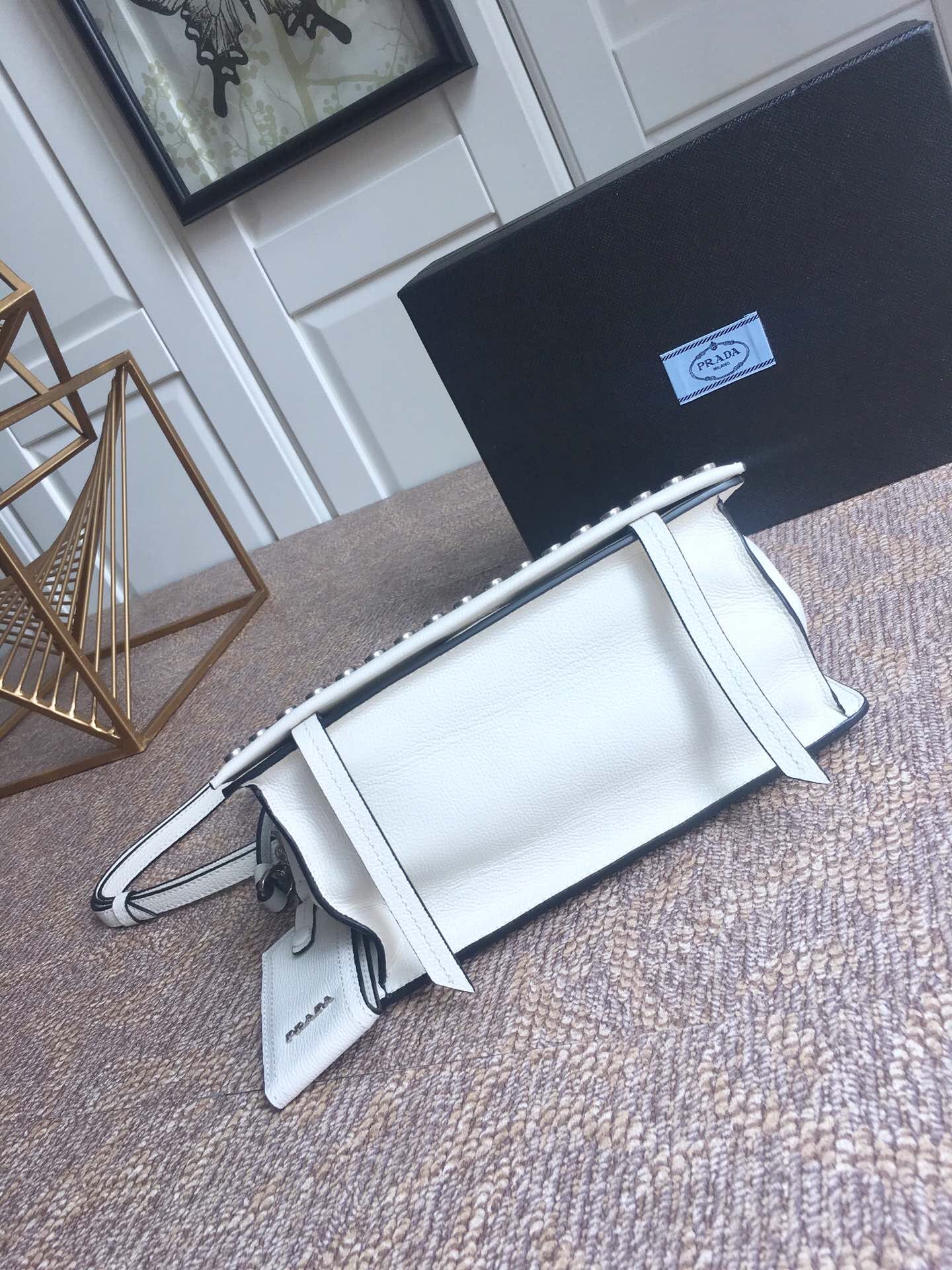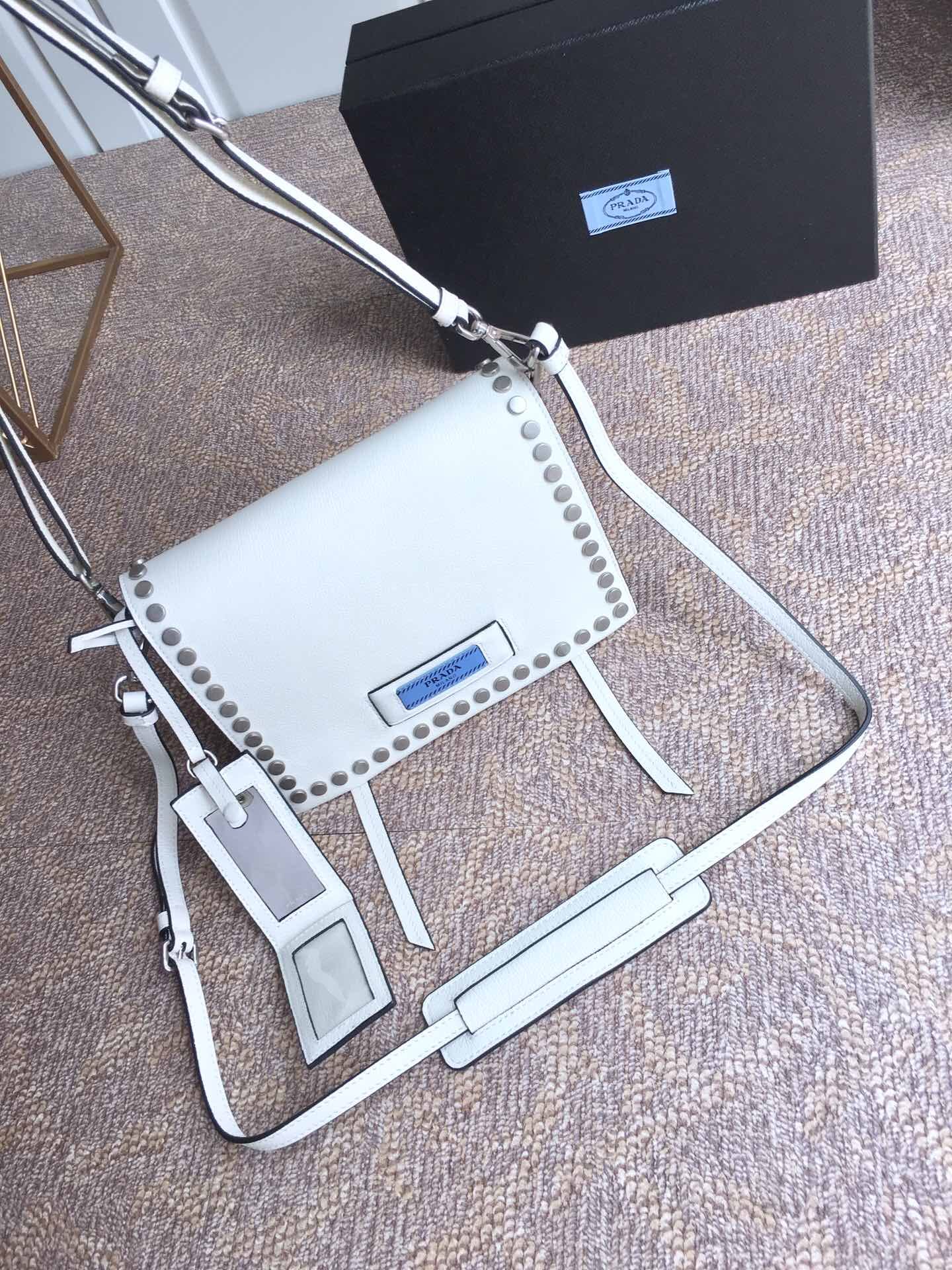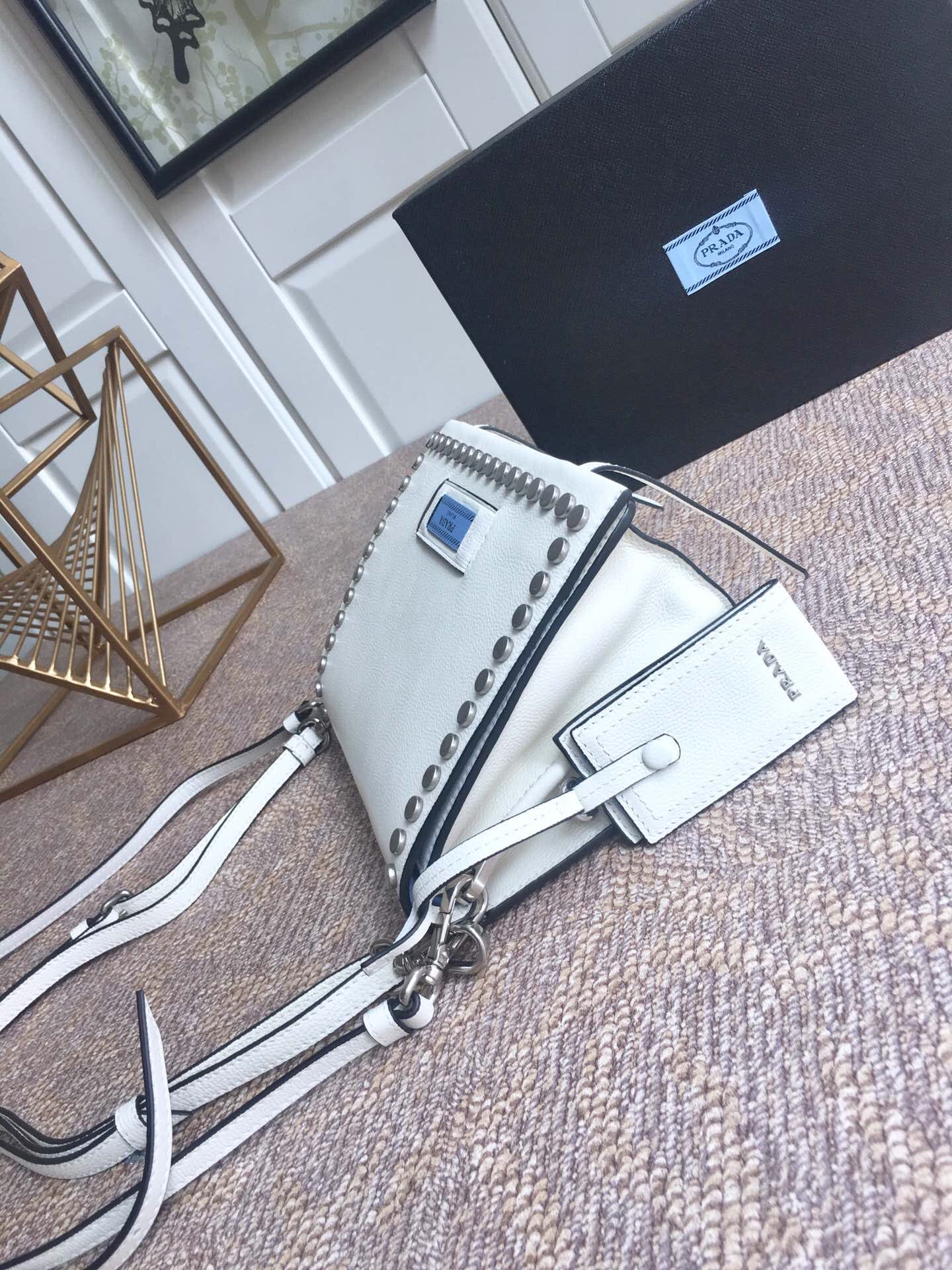 到货了???2018年最新款 lBD082,Prada Etiquette手袋???采用进口小牛皮 锡铅色金属配件 金属钉饰边 ,对比色皮革标识 ,双内袋可肩背,超级实用 无敌美美哒!女神必备 尺寸23乂高15x底10cm,