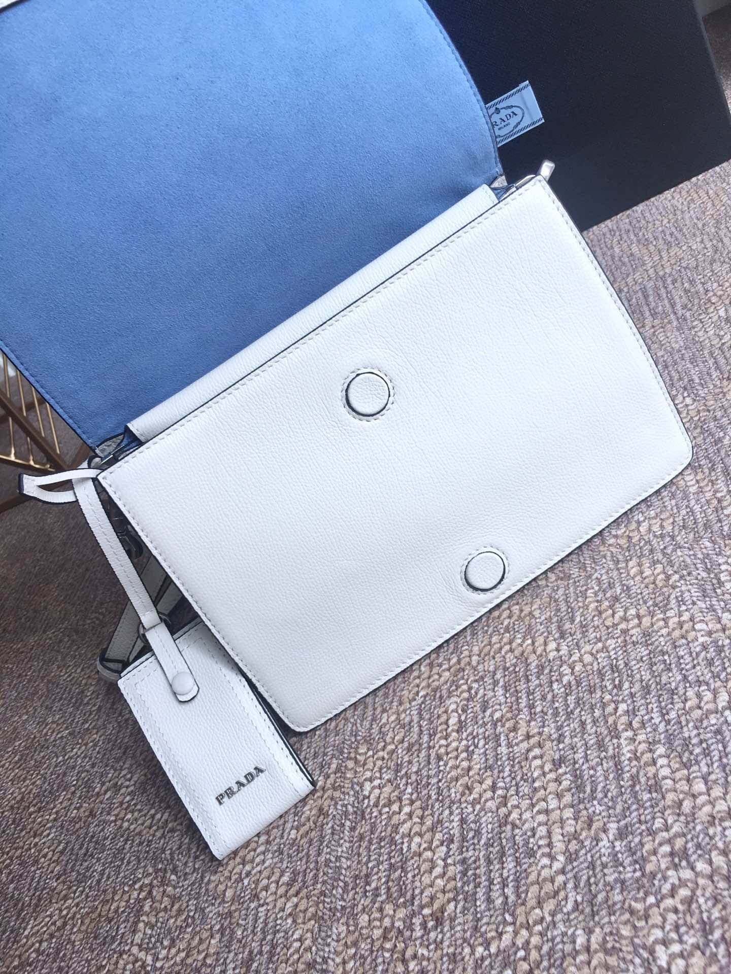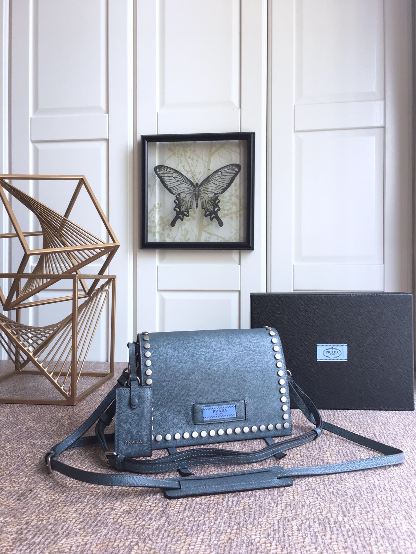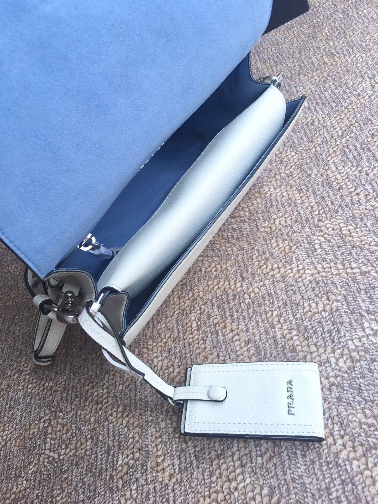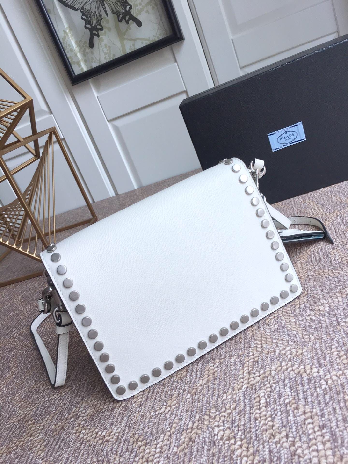 到货了???2018年最新款 lBD082,Prada Etiquette手袋???采用进口小牛皮 锡铅色金属配件 金属钉饰边 ,对比色皮革标识 ,双内袋可肩背,超级实用 无敌美美哒!女神必备 尺寸23乂高15x底10cm,