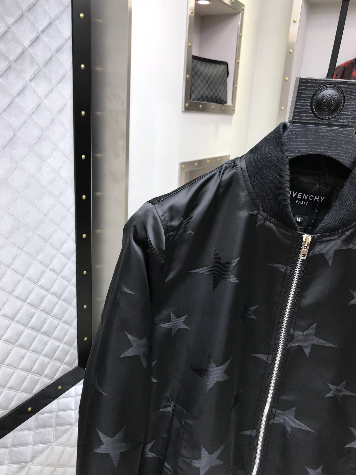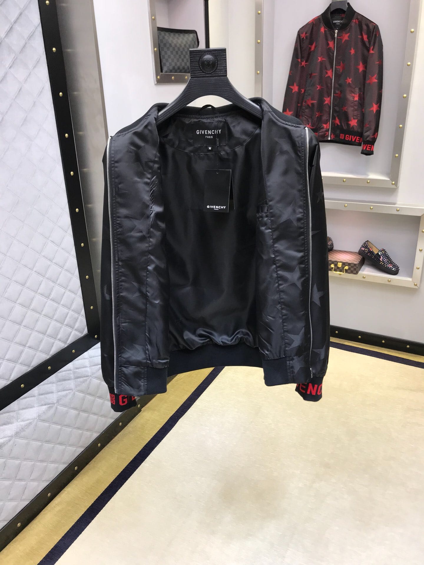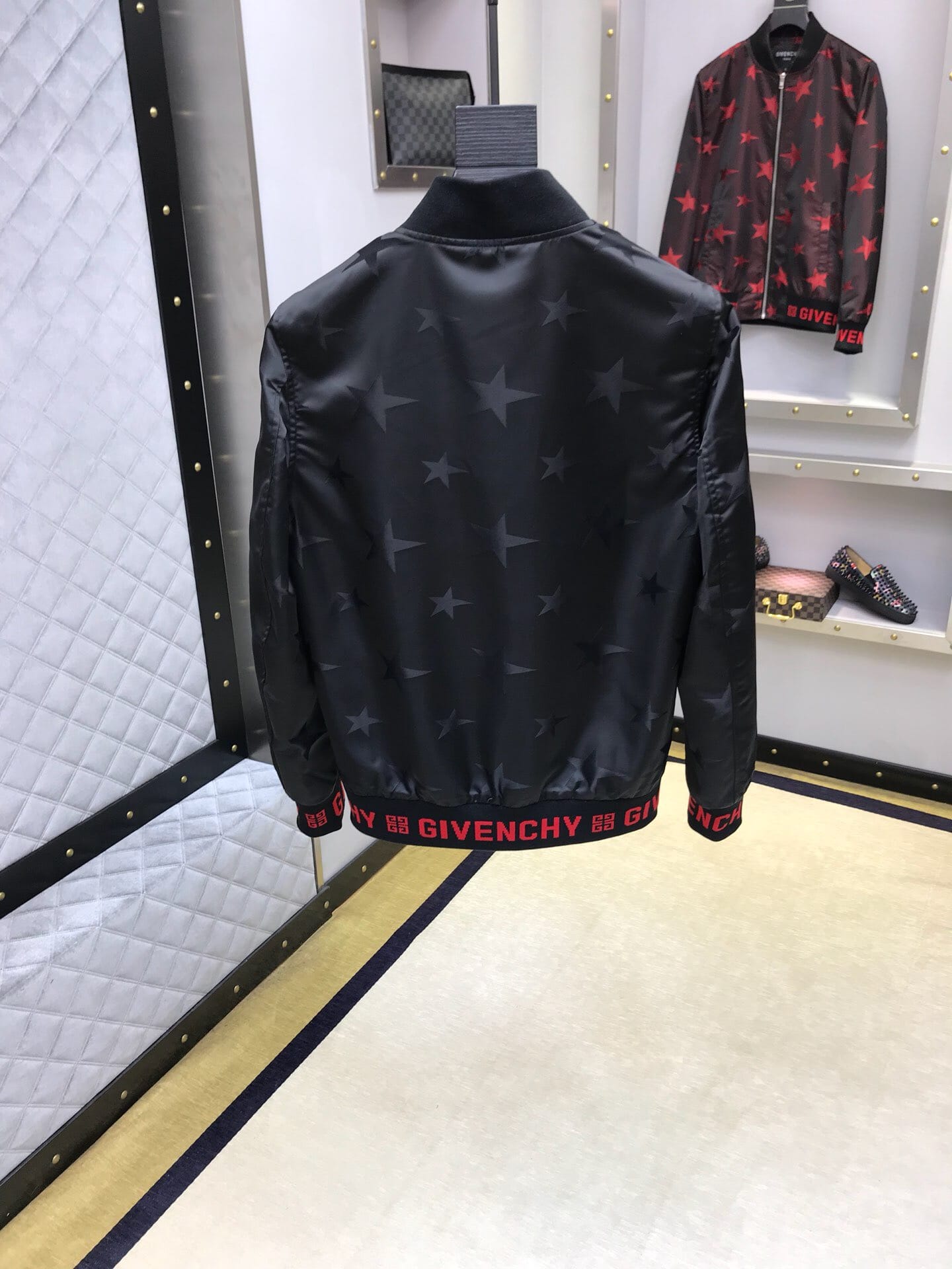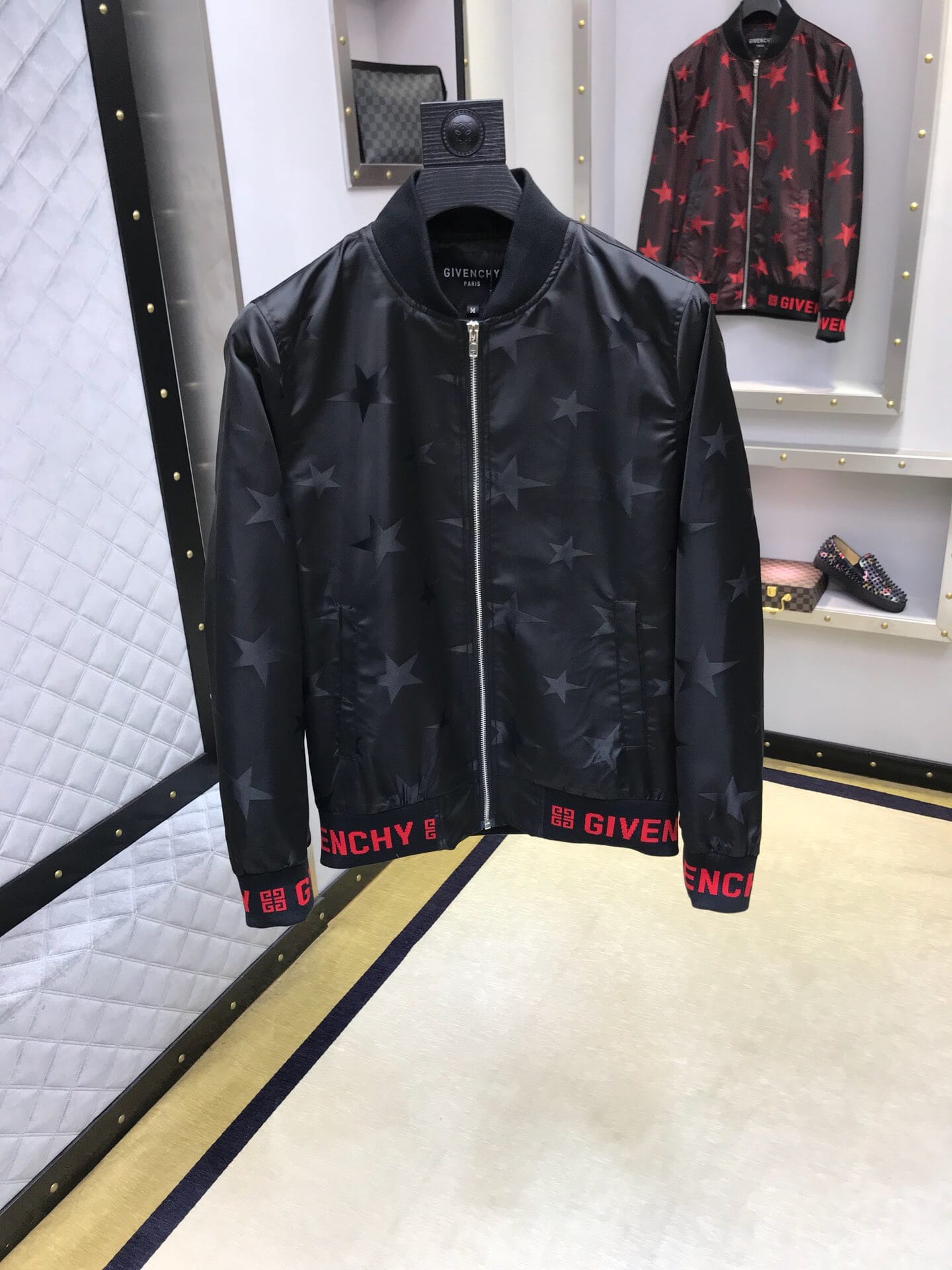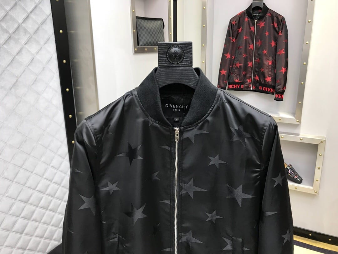 纪梵希 2018官网秋冬系列最新走秀款夹克外套,秀场新品,品相非常完美,专柜高科技面料,色泽饱满诱人,原版五金、全景五角星徽章3D数码印花、撞色螺纹收口设计,极为抢眼!非常出彩的设计,轻松将时髦感进阶,做工极为考究严谨,走线工整细致!原版五金,大牌设计师巨作!上身超级时尚帅气!柜台码数:M-3XL