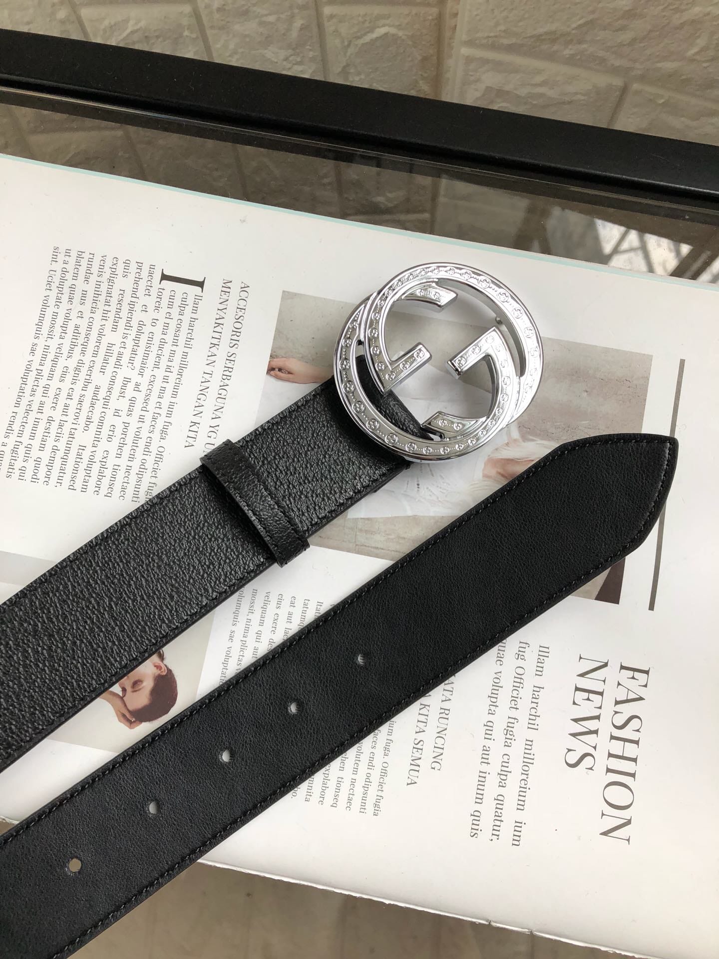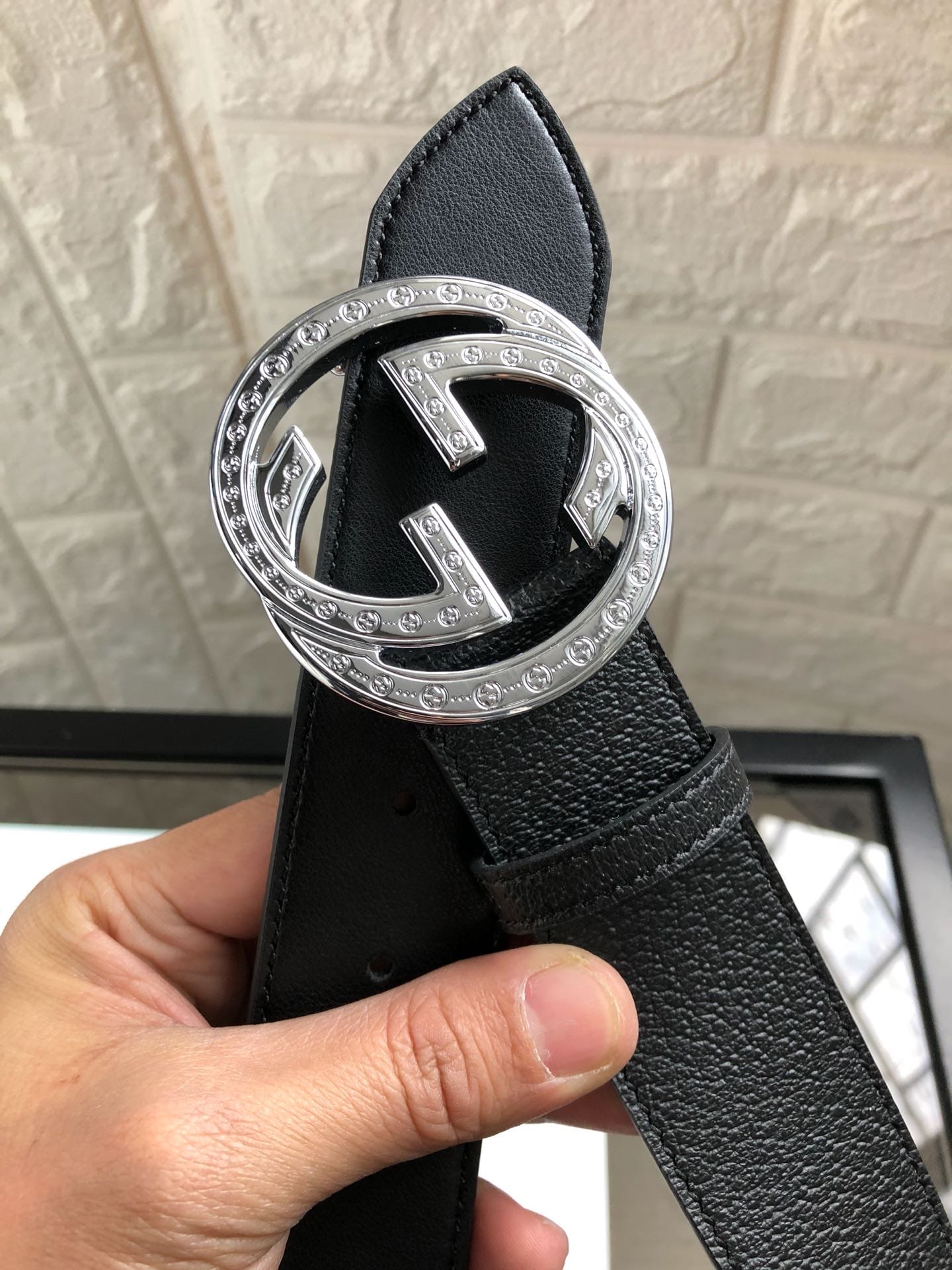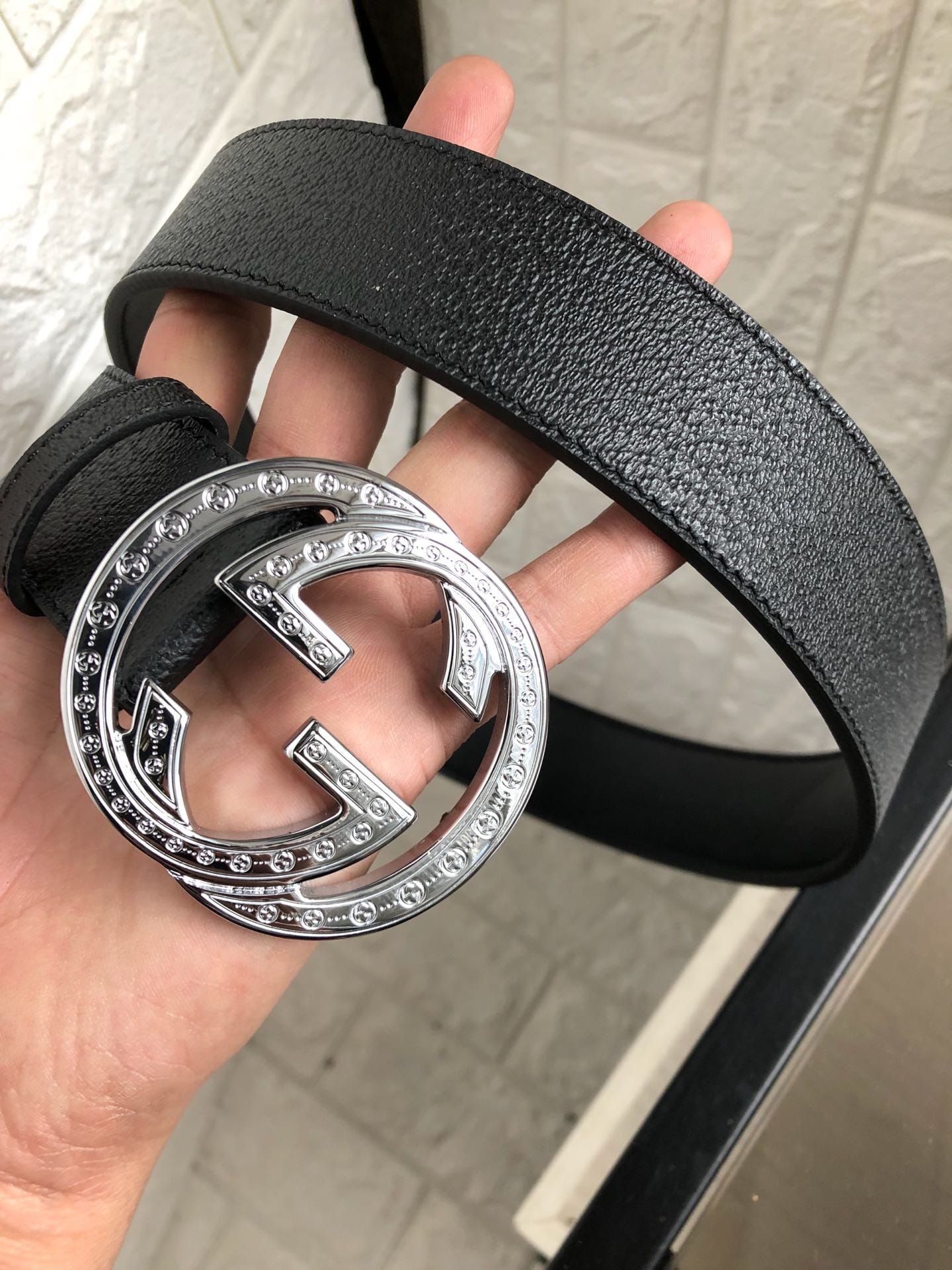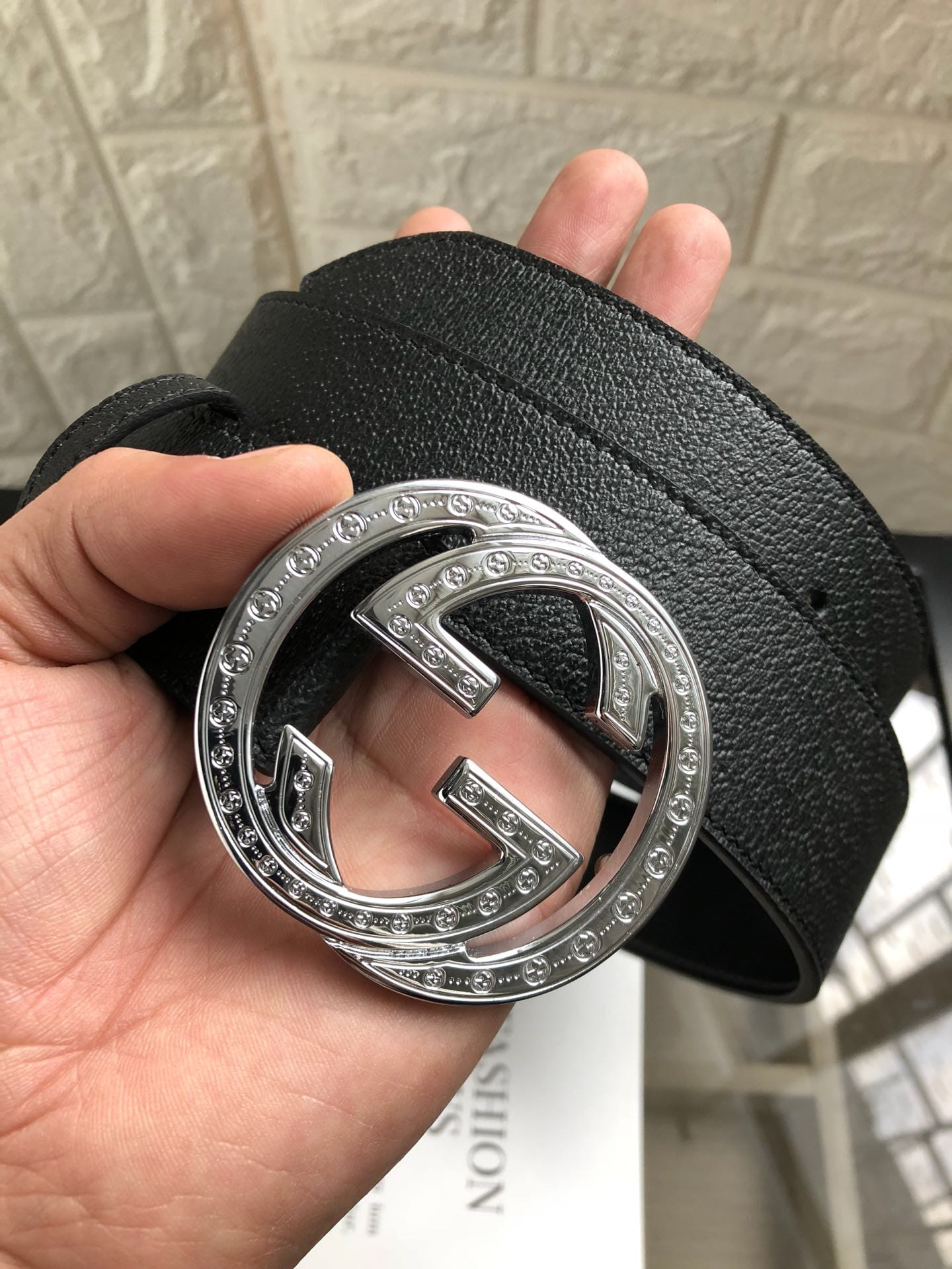 {古驰}原单头层小牛皮腰带采用热压制作,以获得野猪皮效果?内衬平纹牛皮底,营造织纹外观。饰以标志单G带扣。专柜宽度3.8cm
