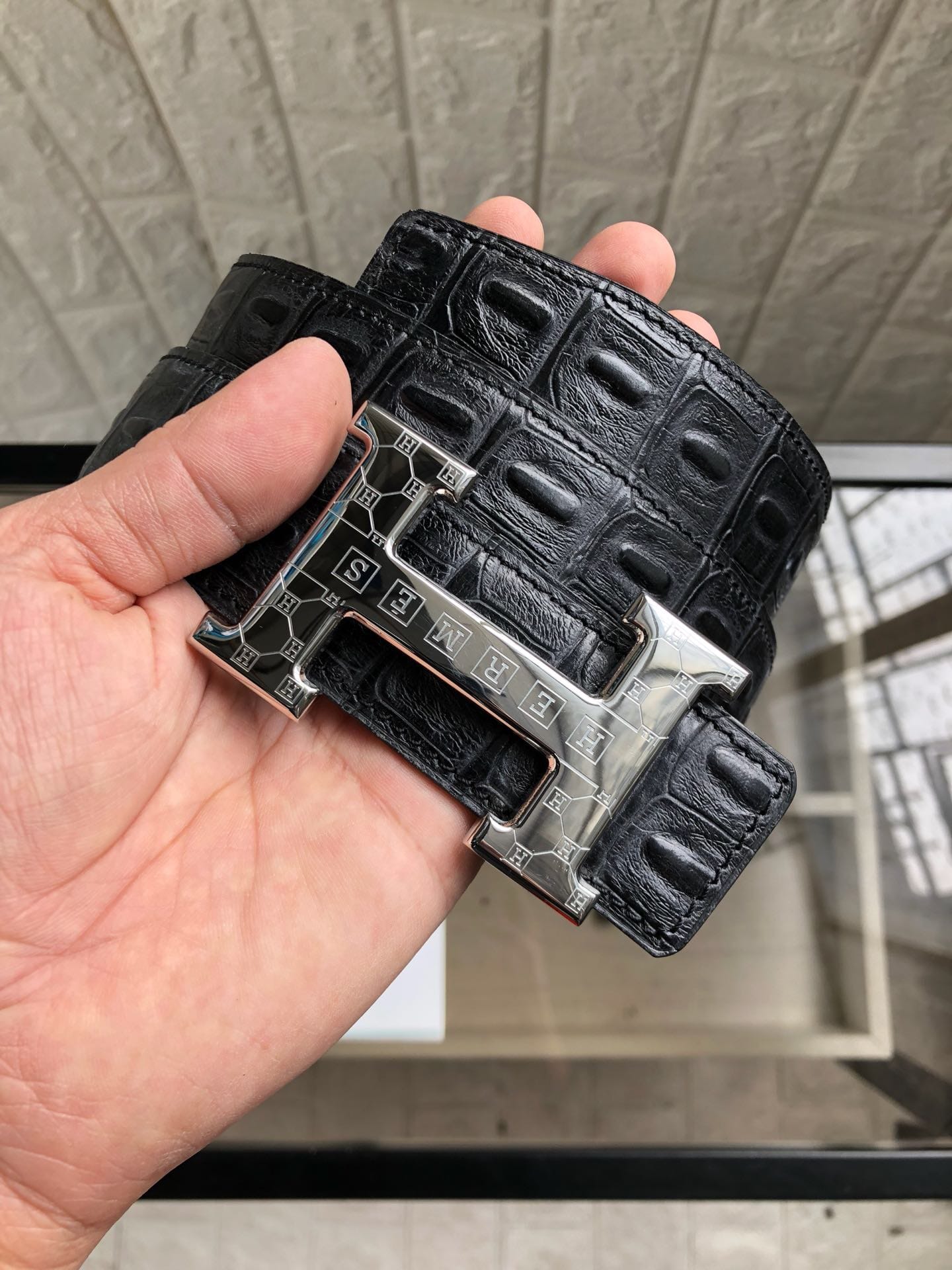{爱玛仕}男士皮带?头层牛皮鳄鱼骨纹面:内衬头层牛皮荔枝纹底