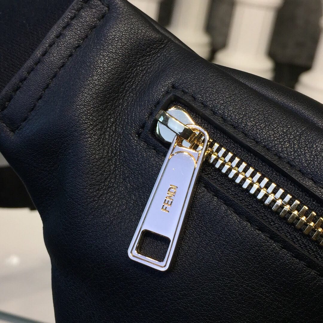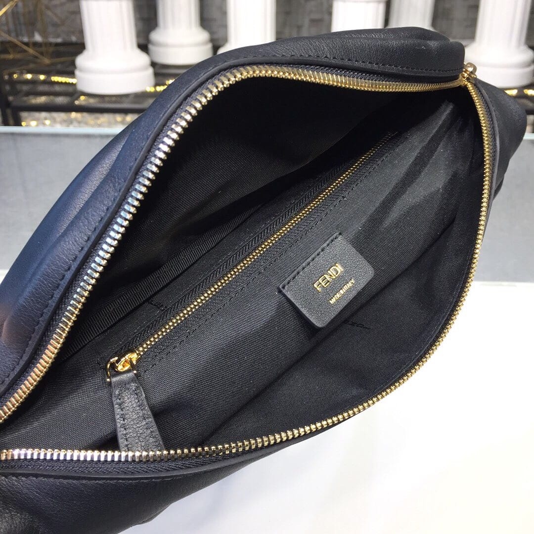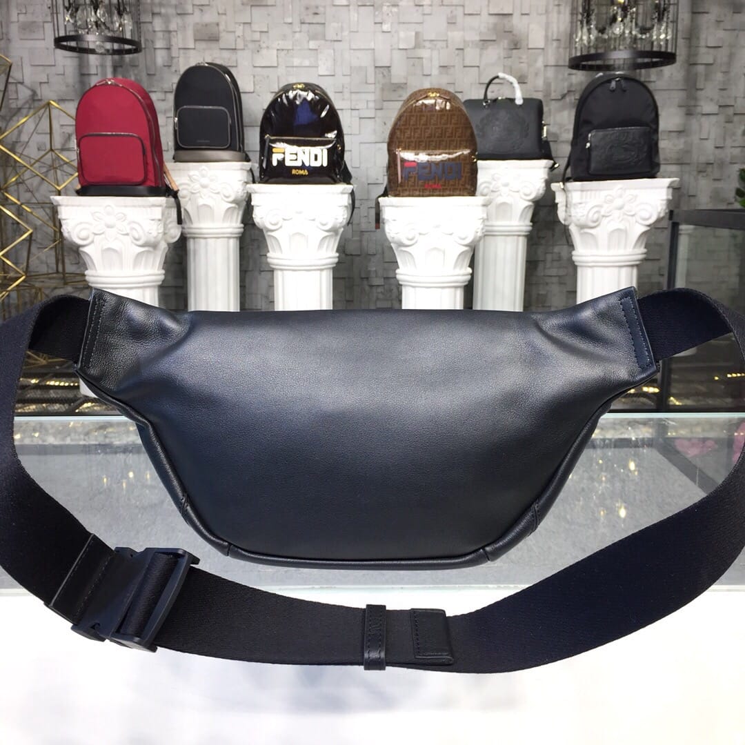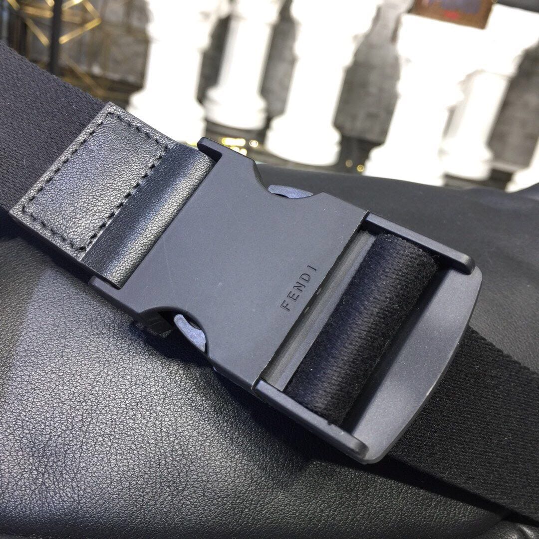 拉链开合腰包。黑色小牛皮材质??可调节腰带?饰以凸印贴花和形