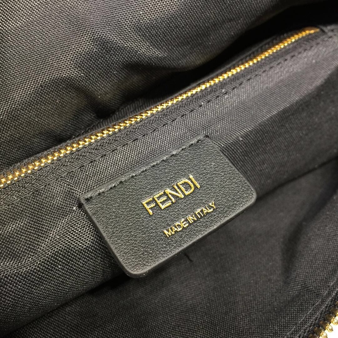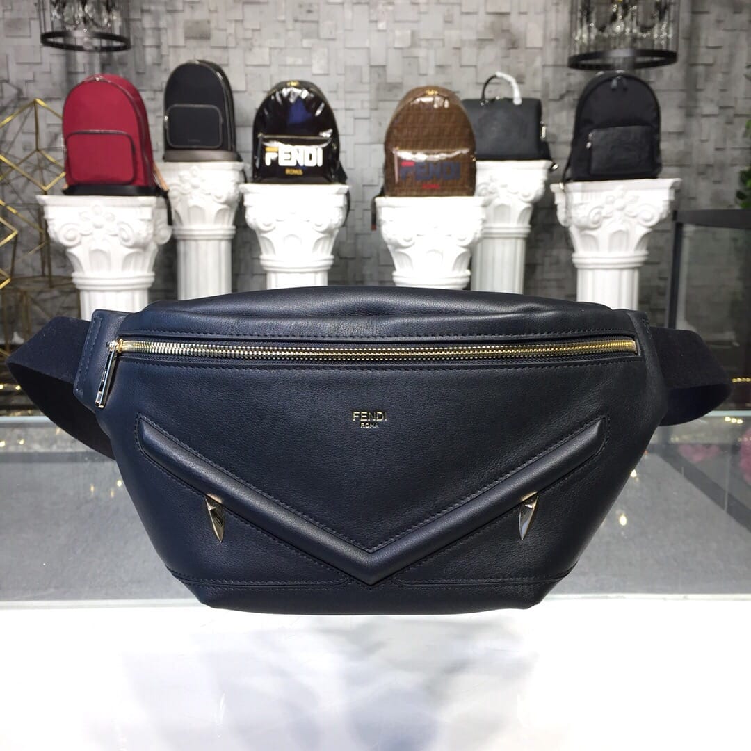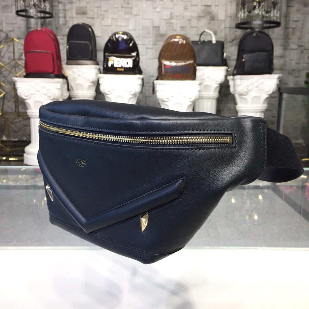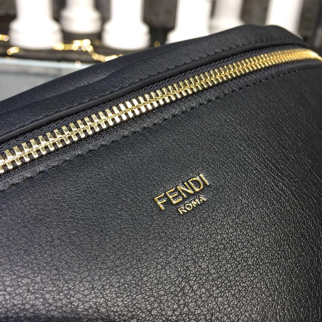 拉链开合腰包。黑色小牛皮材质??可调节腰带?饰以凸印贴花和形