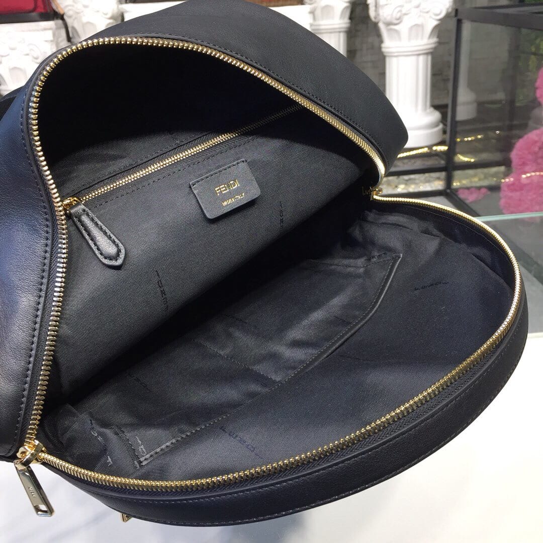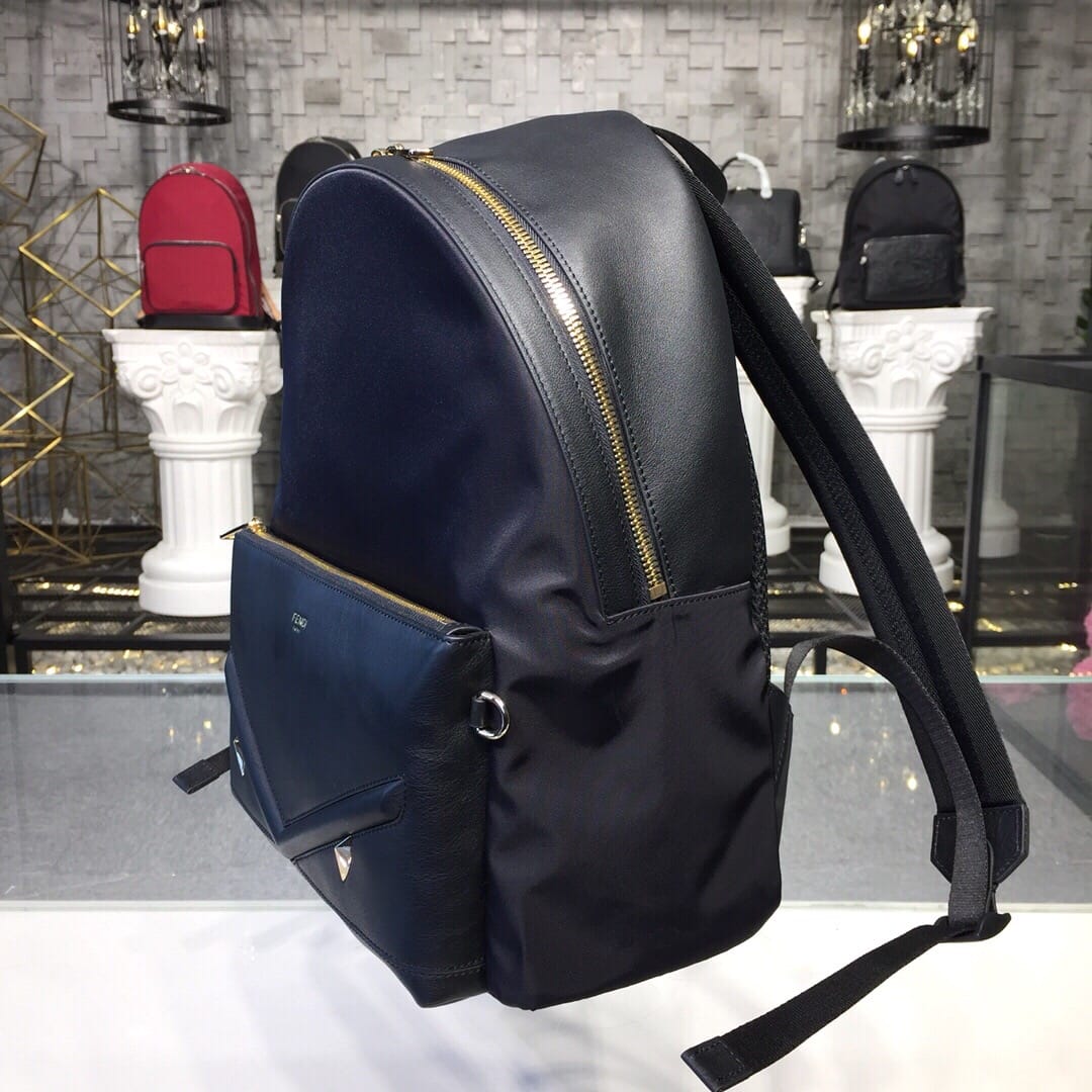 Mania logo背包。顶部有弧状手柄??双向拉链、金色五