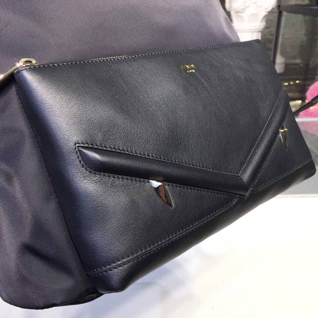 手拿包。修长拉链小口袋??黑色小牛皮材质?饰以凸印贴花和形似