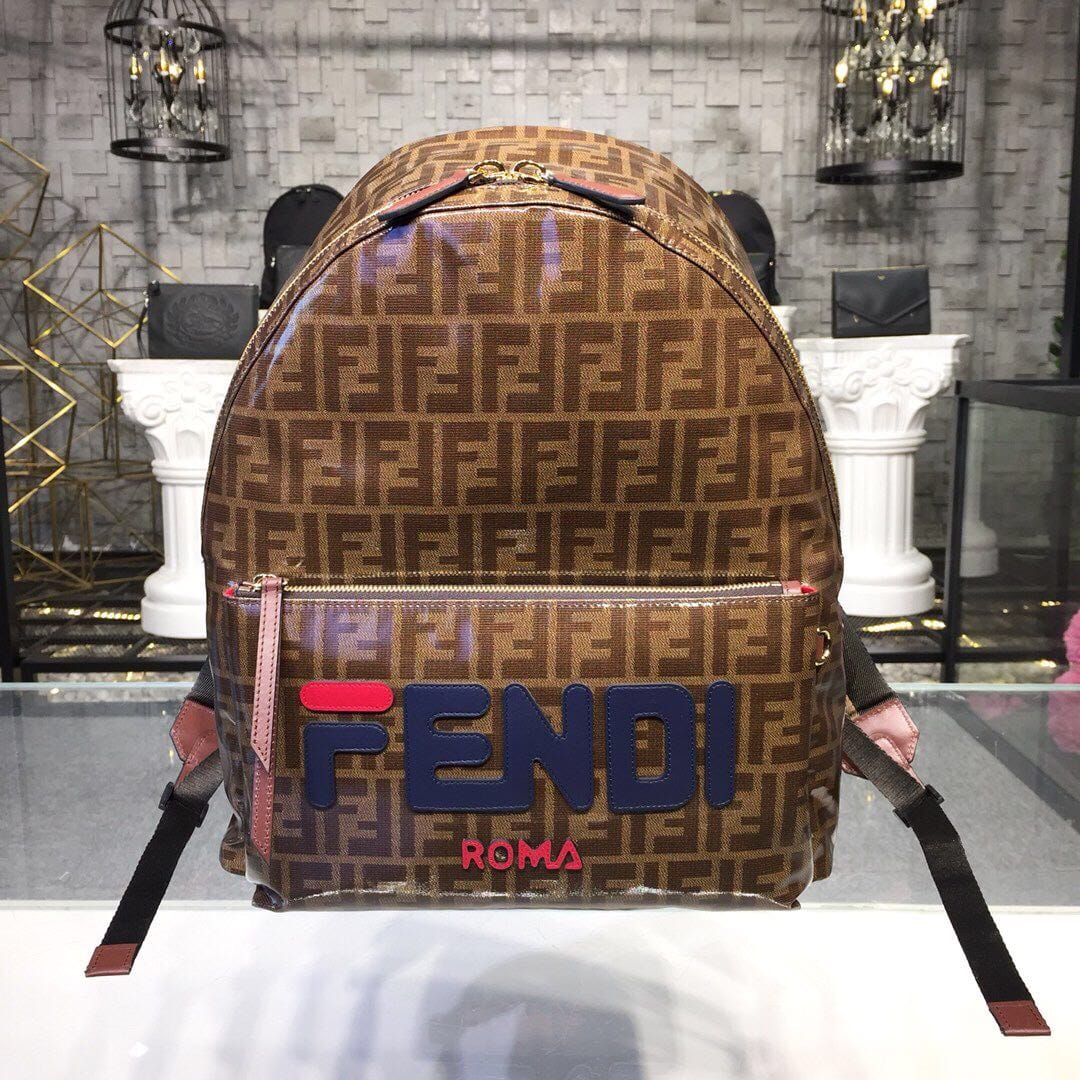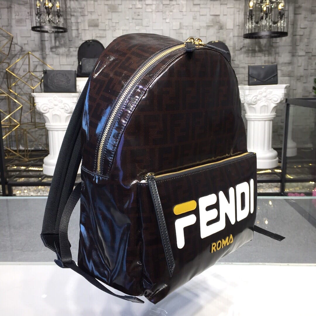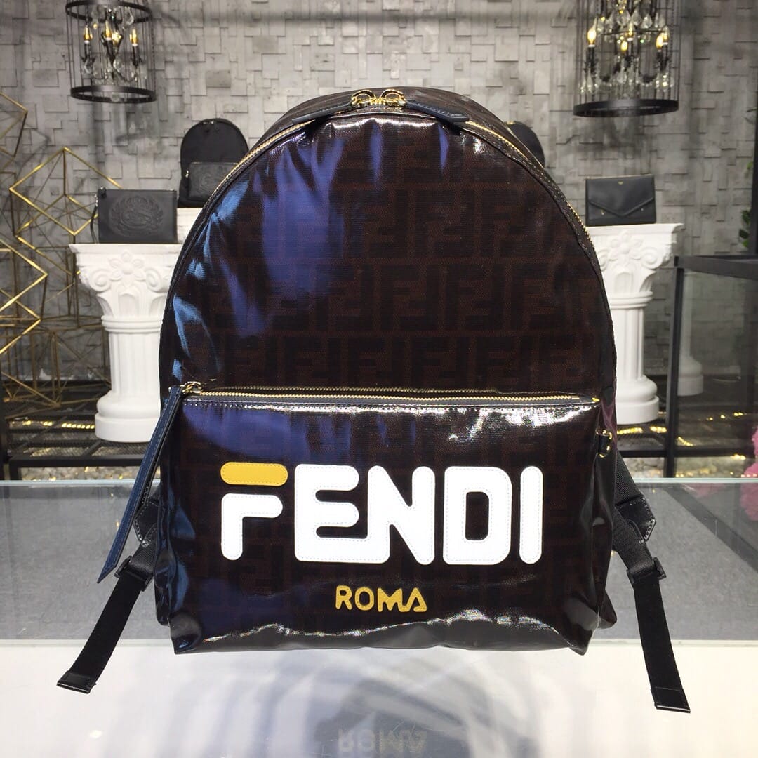 Mania logo背包。顶部有弧状手柄??双向拉链、金色五