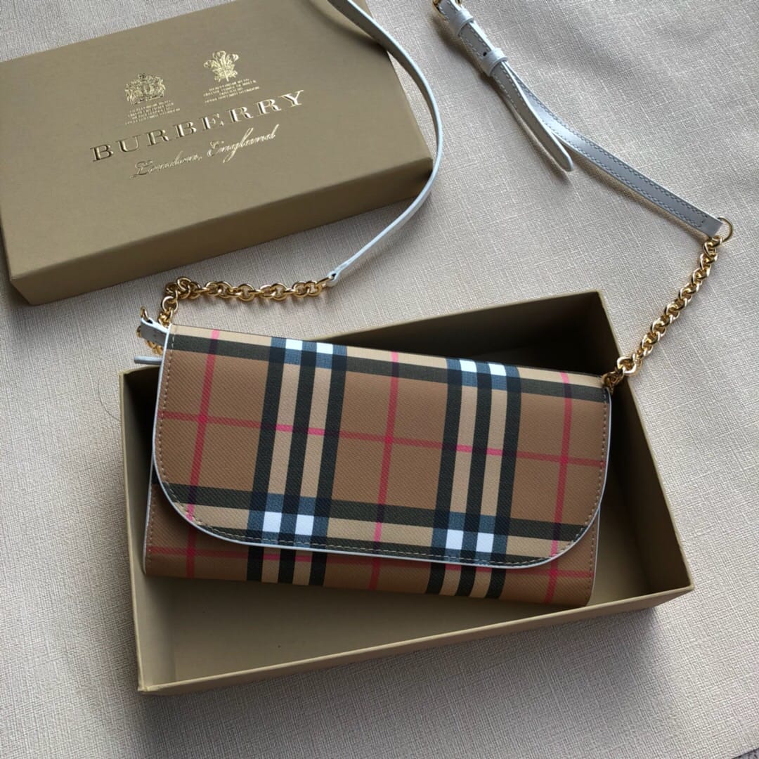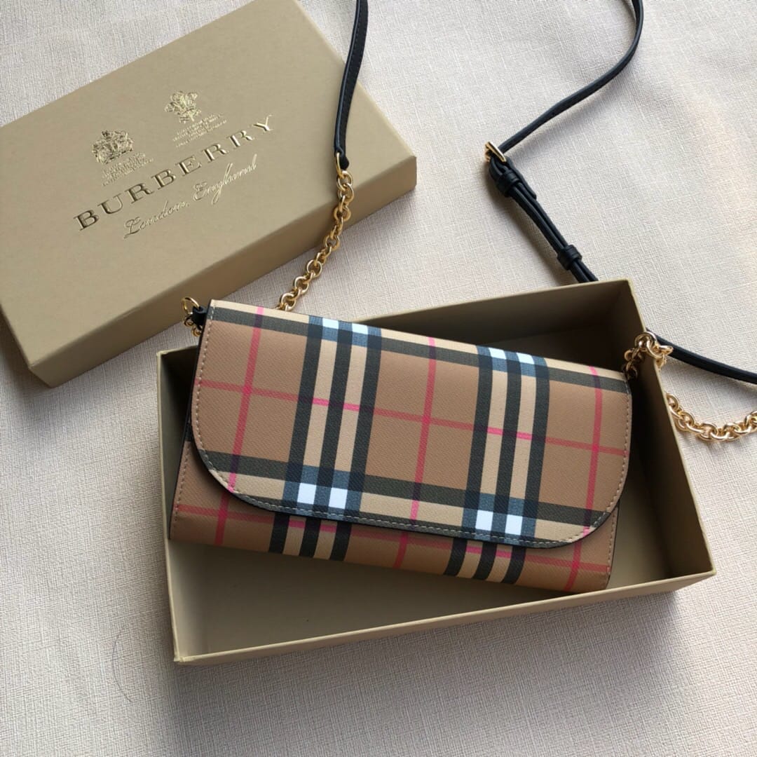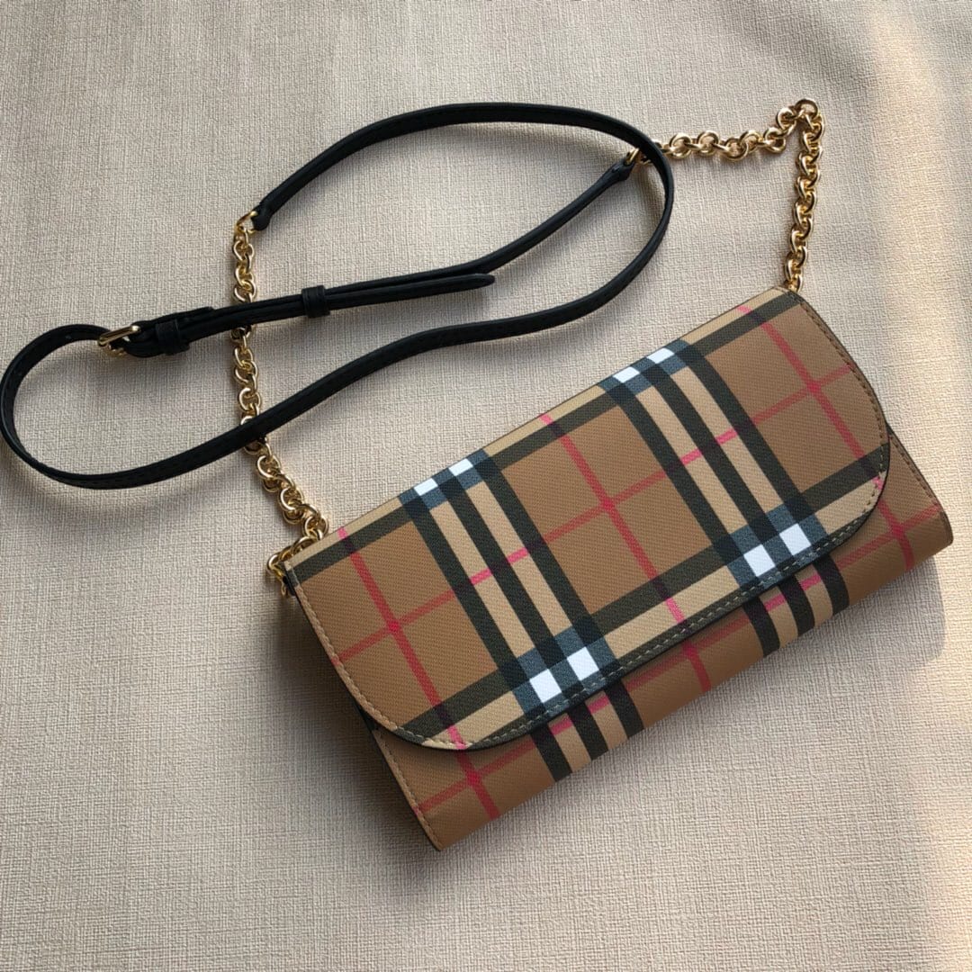B家顶级原单】Burberry博柏利英国精纺Vintage复古格纹拼牛皮钱夹,巴宝莉斜挎包,随附链饰拼皮革肩背带,既可作为小型手袋单独使用,又可纳入日常手袋之内作为钱夹使用。21 x 4 x 11cm