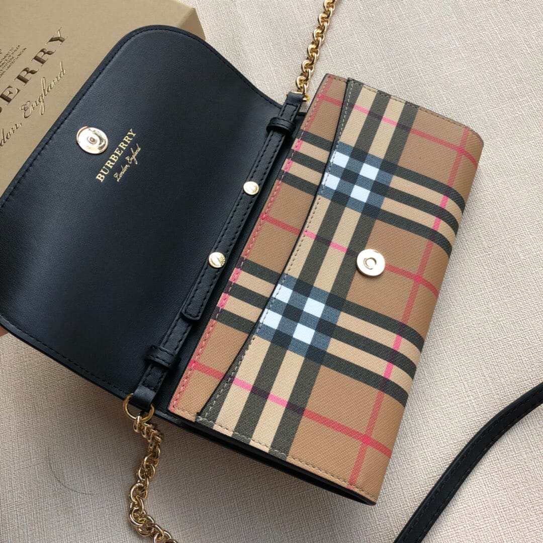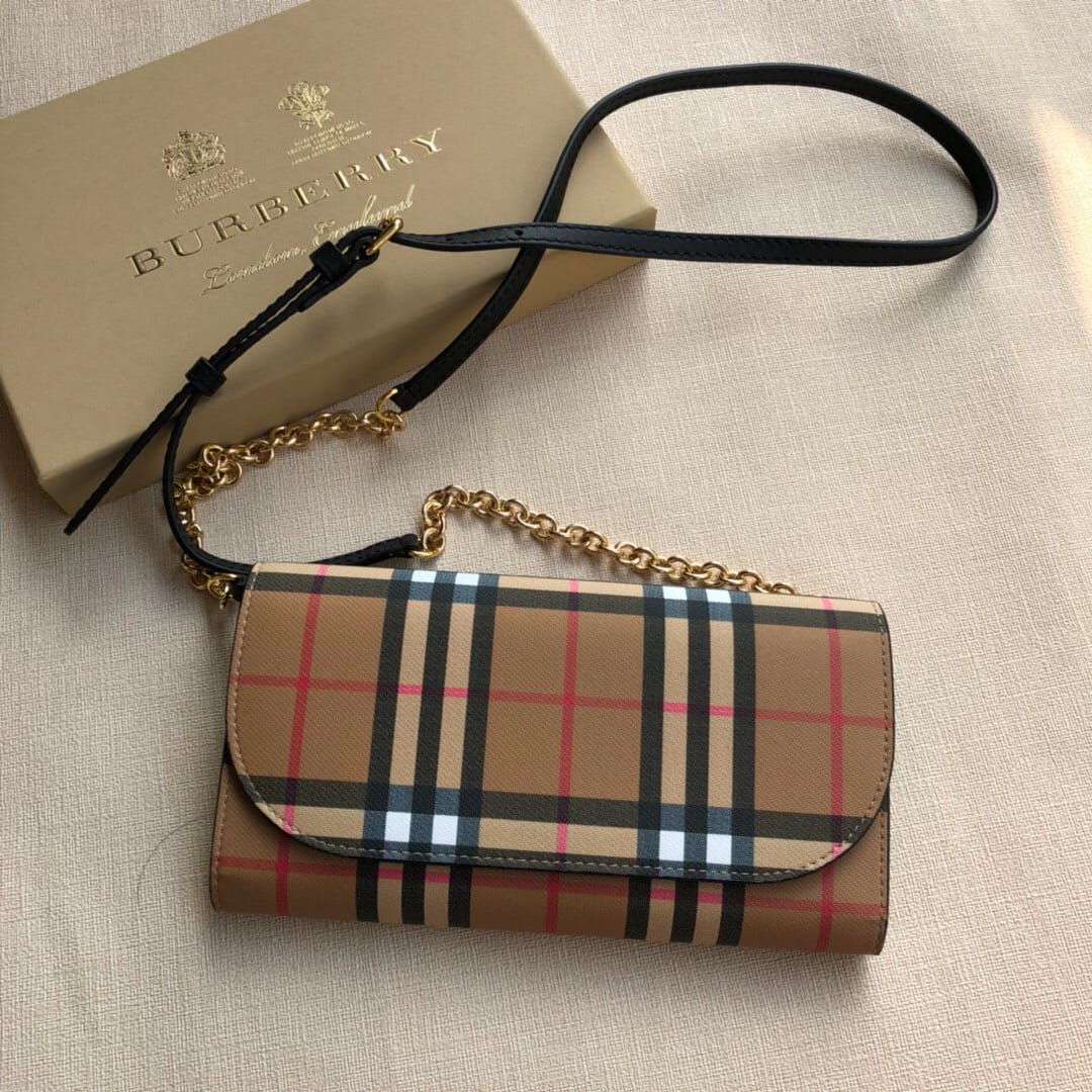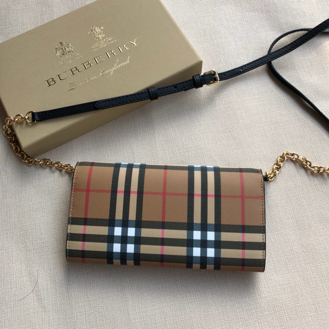 B家顶级原单】Burberry博柏利英国精纺Vintage复古格纹拼牛皮钱夹,巴宝莉斜挎包,随附链饰拼皮革肩背带,既可作为小型手袋单独使用,又可纳入日常手袋之内作为钱夹使用。21 x 4 x 11cm